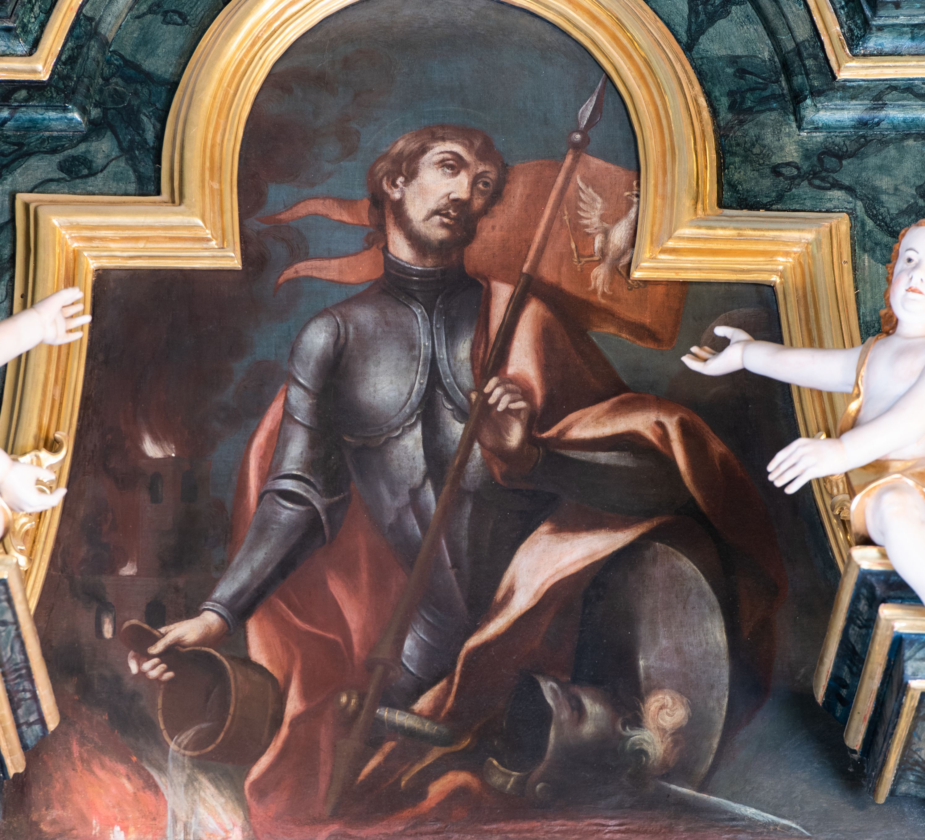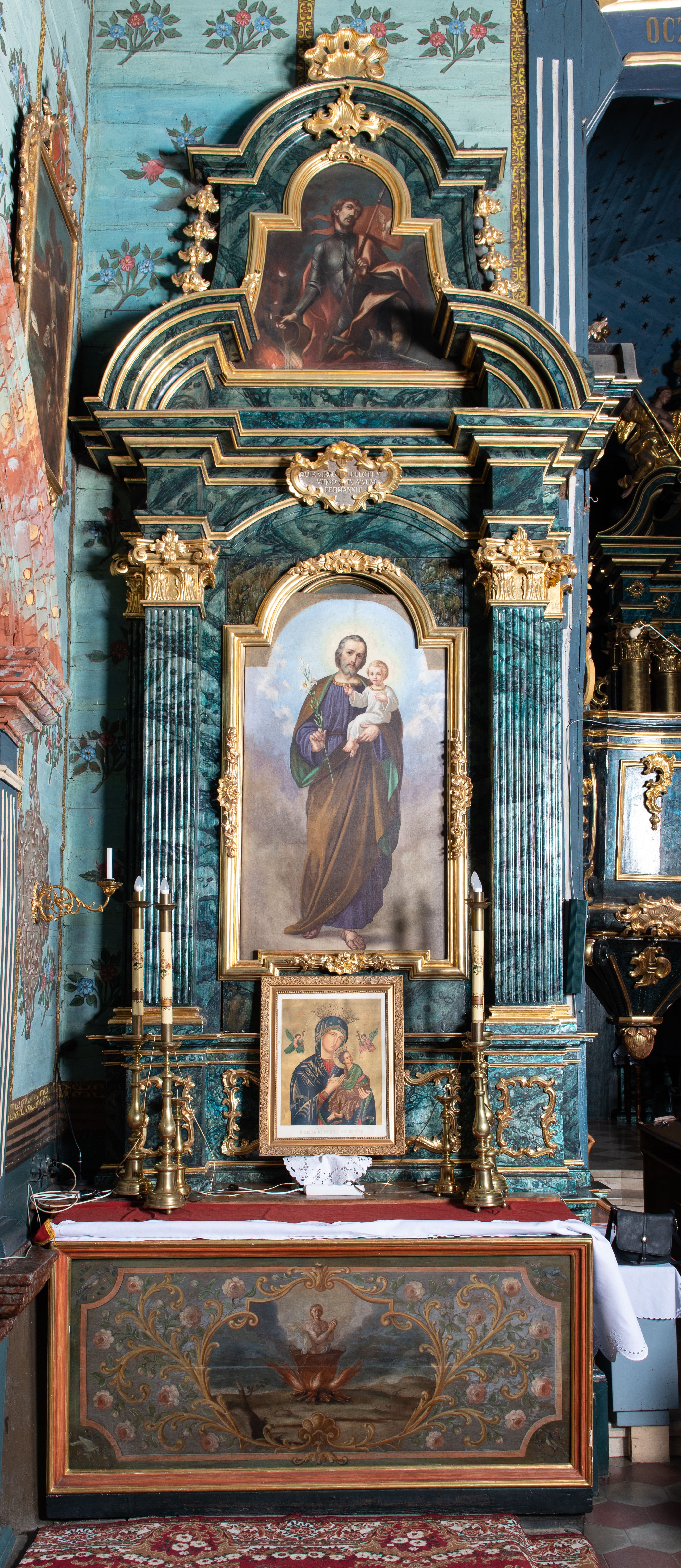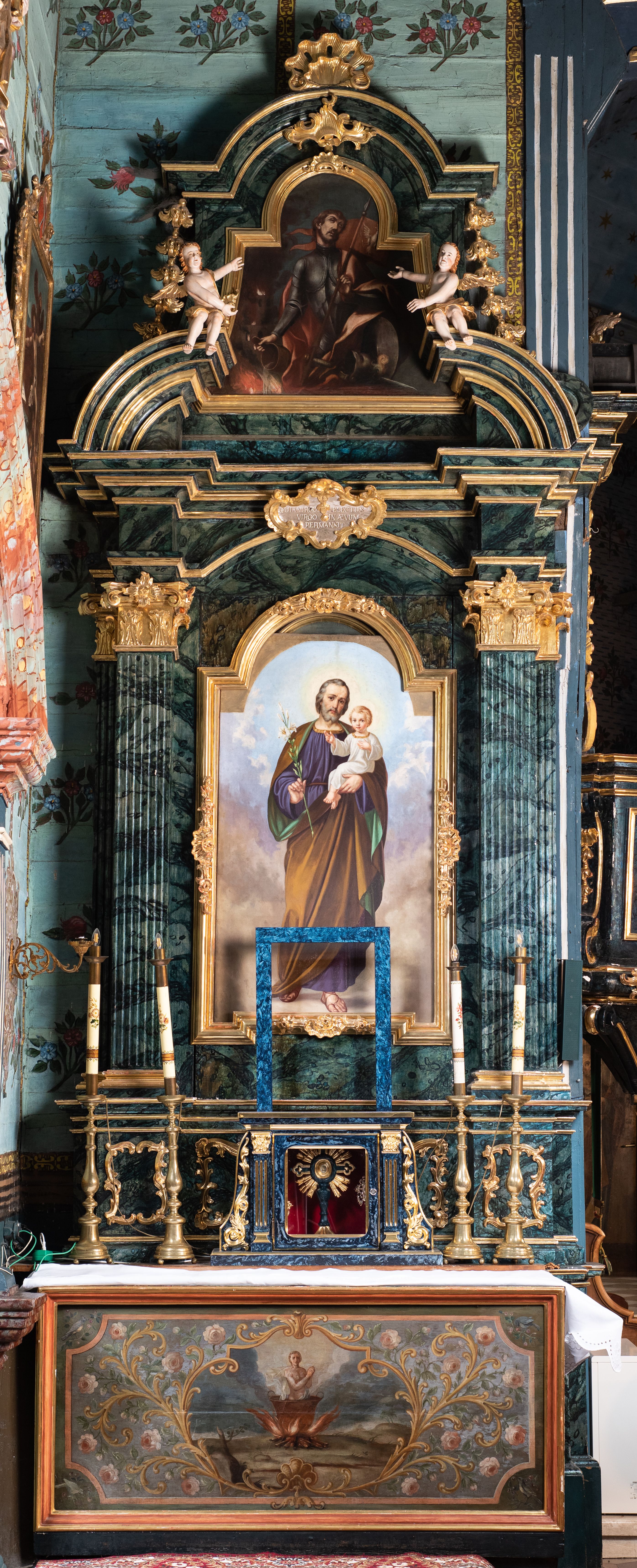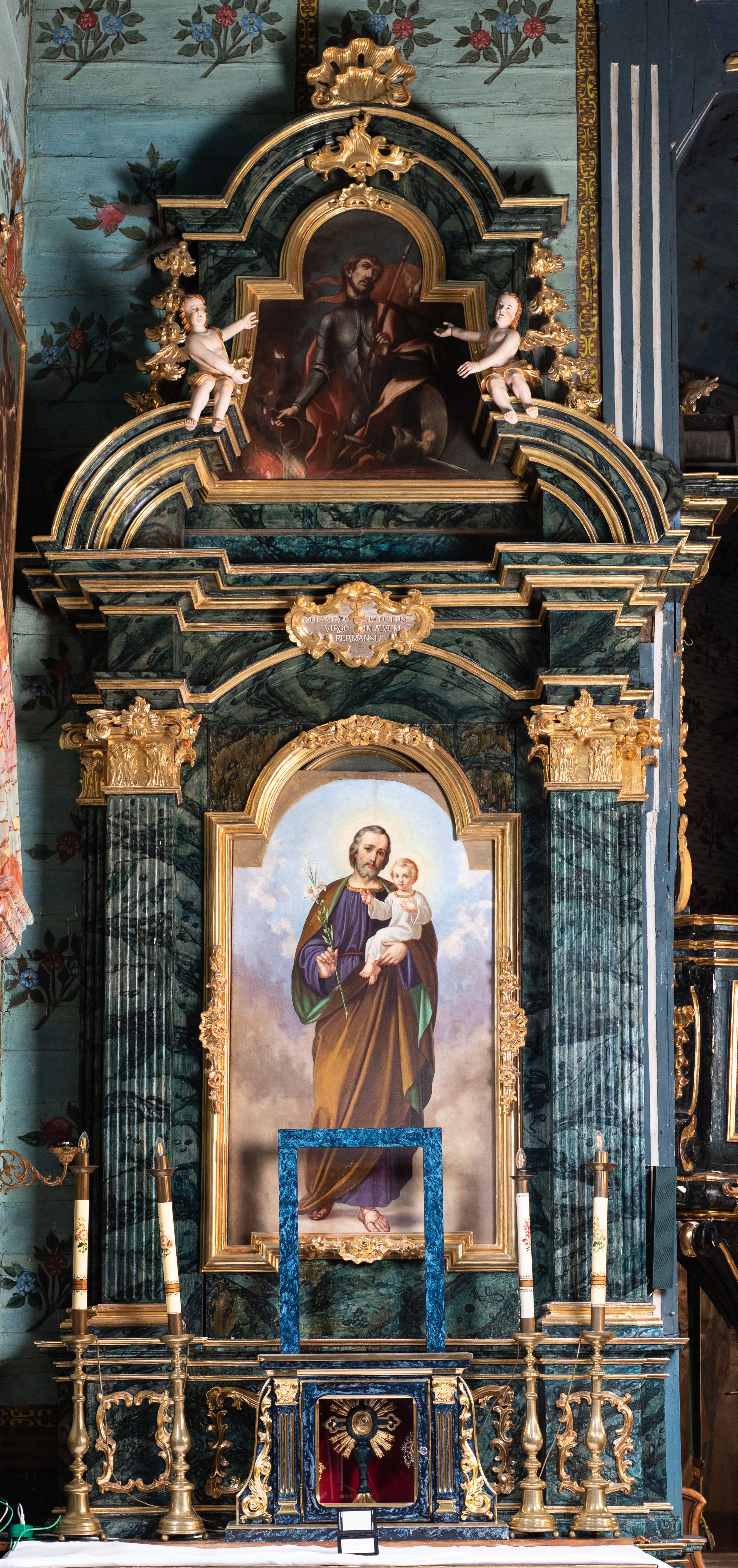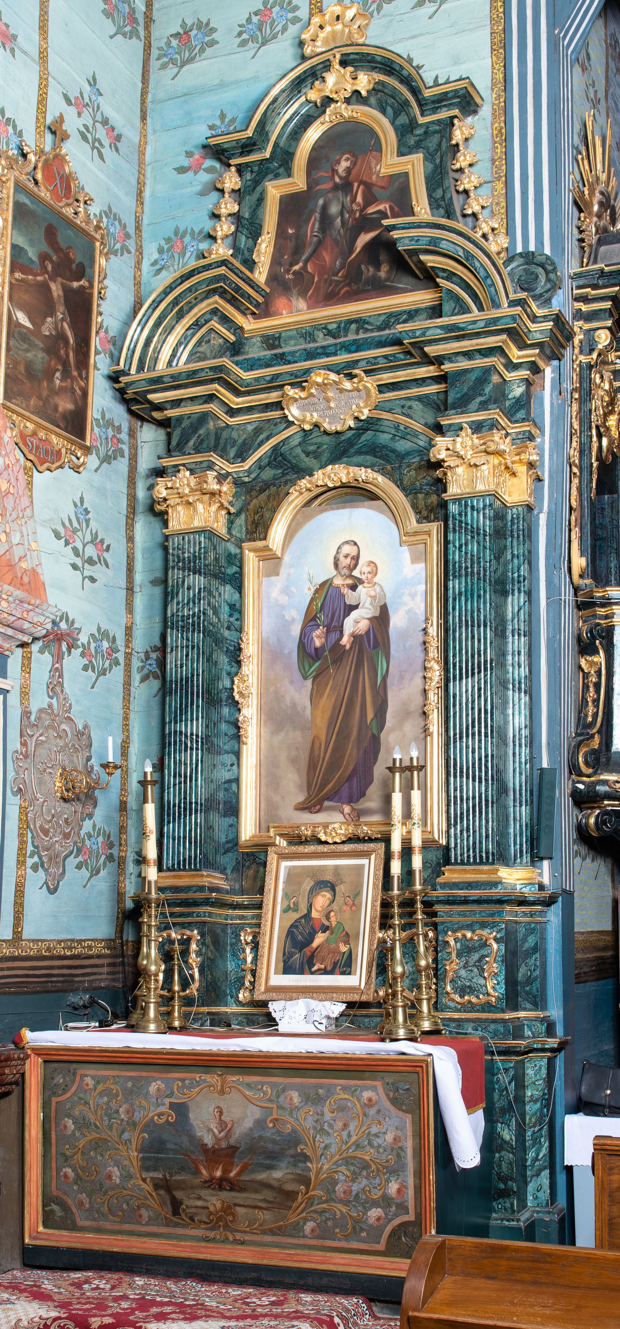 Nastawa architektoniczna, jednoosiowa, jednokondygnacyjna ze zwieńczeniem. Ołtarz prostopadłościenny, murowany, w drewnianej obudowie, z kamienną mensą. Antepedium ujęte profilowaną ramą, w polu malowana płycina w formie leżącego prostokąta o wklęsłych narożach, wypełniona różami, z akantowym kartuszem w centrum. W narożach przedstawienia ptaków na gałęziach. W polu kartusza scena męczeństwa św Wita, na tle pejzażu. Retabulum ustawione na dwustrefowym cokole, z wyłamanymi dwoma prostopadłościanami, w górnej części dekorowanymi rocaille'owymi płycinami. Nastawa ujęta parą zdwojonych pilastrów, o kanelowanych trzonach i kapitelach kompozytowych, dźwigających pełne belkowanie, wyłamane na ich osi, z architrawem przyjmującym nad polem środkowym formę łuku odcinkowego oraz fragmenty półkolistego, przerwanego przyczółka. W polu centralnym wnęka w kształcie stojącego prostokąta zamkniętego łukiem półkolistym nadwieszonym, ujęta profilowaną ramą, z obrazem św. Józefa z Dzieciątkiem. Nad nią, w polu belkowania rocaille'owy kartusz z napisem „QUIA VIRGO ELECTUS / VIRGO IN AEVUM / PERMANSIT”. Zwieńczenie w formie zbliżonej do trapezu, ujętego spływami wolutowymi, zamkniętego fragmentem gzymsu w formie łuku półkolistego nadwieszonego. Zwieńczenie zakończone rokokową muszlą i rocaille'm, flankowane kampanulami. W polu obraz św. Floriana w kształcie analogicznym do zwieńczenia, w profilowanej ramie. Struktura polichromowana na sposób imitujący marmoryzację w kolorach niebieskim i zielonym, profile i ornamentyka złocone, detal srebrzony.