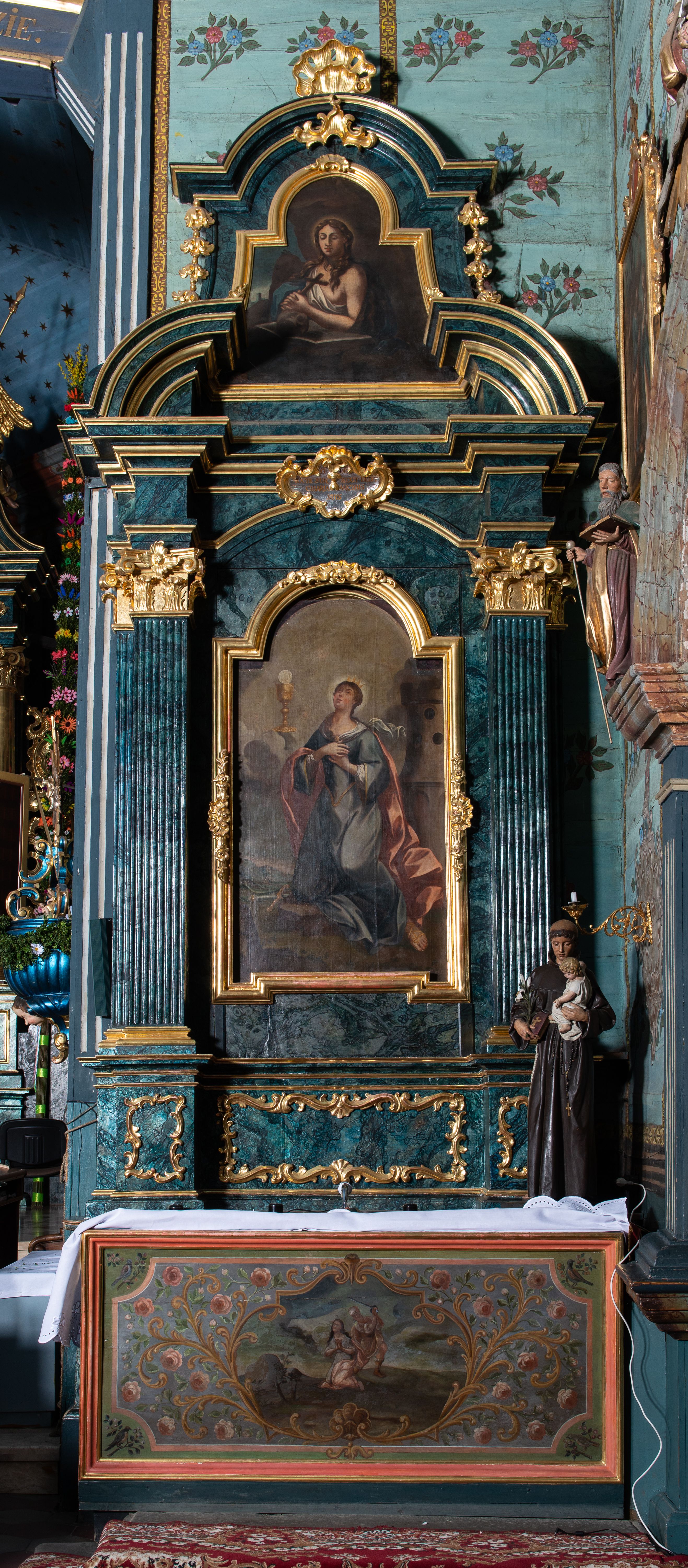 Nastawa architektoniczna, jednoosiowa, jednokondygnacyjna ze zwieńczeniem. Ołtarz prostopadłościenny, murowany, w drewnianej obudowie, z kamienną mensą. Antepedium ujęte profilowaną ramą, w polu malowana płycina w formie leżącego prostokąta o wklęsłych narożach, wypełniona różami, z akantowym kartuszem w centrum. W narożach przedstawienia ptaków na gałęziach. W polu kartusza scena ścięcia św. Barbary przez oprawcę, na tle pejzażu. Retabulum ustawione na dwustrefowym cokole, z wyłamanymi dwoma prostopadłościanami, w górnej części dekorowanym rocaille'owymi płycinami. Nastawa ujęta parą zdwojonych pilastrów, o kanelowanych trzonach i kapitelach kompozytowych, dźwigających pełne belkowanie, wyłamane na ich osi, z architrawem przyjmującym nad polem środkowym formę łuku odcinkowego oraz fragmenty półkolistego, przerwanego przyczółka. W polu centralnym wnęka w kształcie stojącego prostokąta zamkniętego łukiem półkolistym nadwieszonym, ujęta profilowaną ramą, z obrazem św. Barbary. Nad nią, w polu belkowania rocaille'owy kartusz z napisem „IT DE / NOCTE SURREXIT DEDIT / CIBARIA ANCIRIS / SUIS”. Zwieńczenie w formie zbliżonej do trapezu, ujętego spływami wolutowymi, zamkniętego fragmentem gzymsu w kształcie łuku półkolistego nadwieszonego. Zwieńczenie zakończone rokokową muszlą i rocaille'm, flankowane kampanulami. W polu obraz pokutującej św. Marii Magdaleny w kształcie analogicznym do zwieńczenia, w profilowanej ramie. Struktura polichromowana na sposób imitujący marmoryzację w kolorach niebieskim i zielonym, profile i ornamentyka złocone, detal srebrzony.