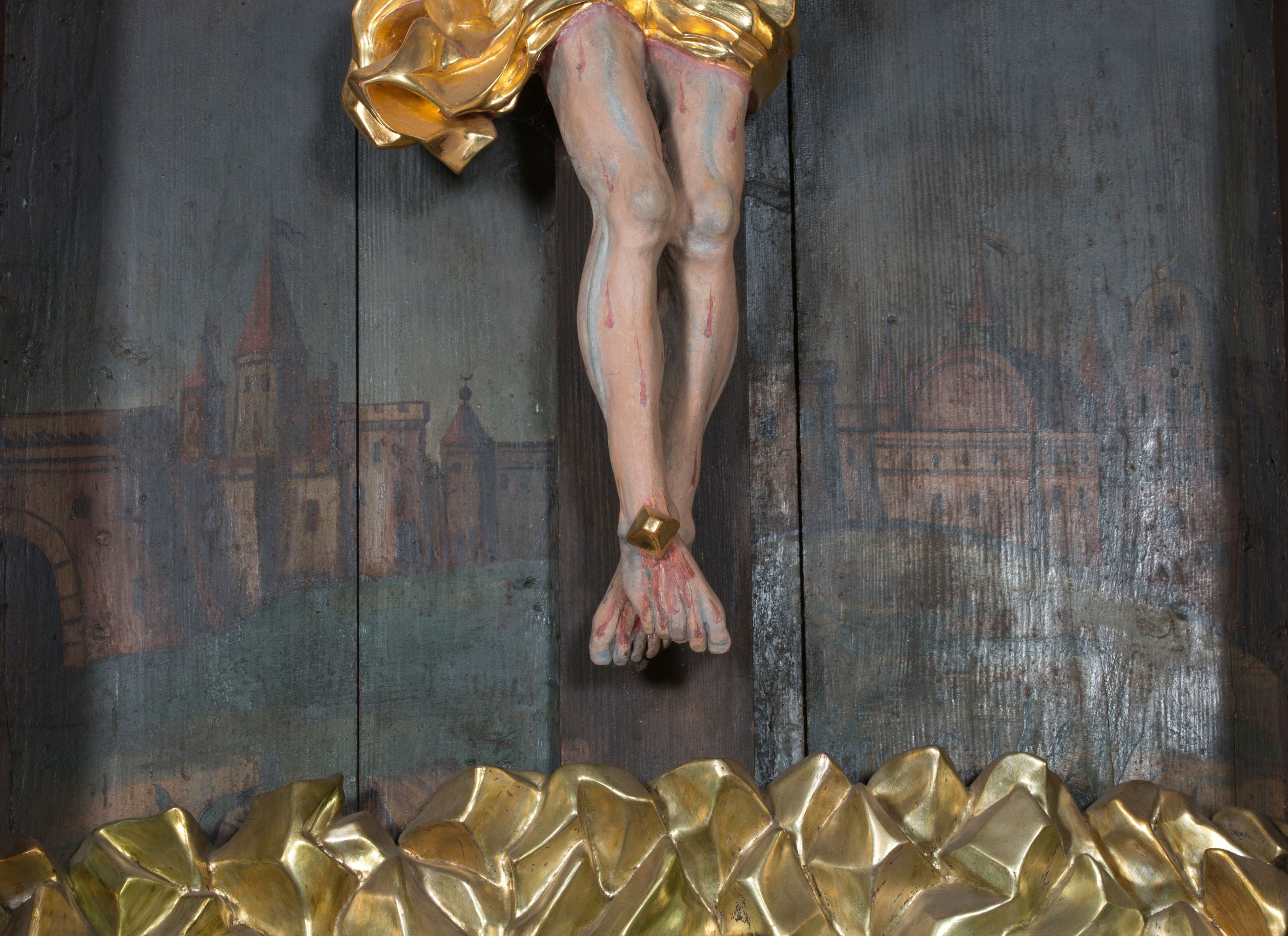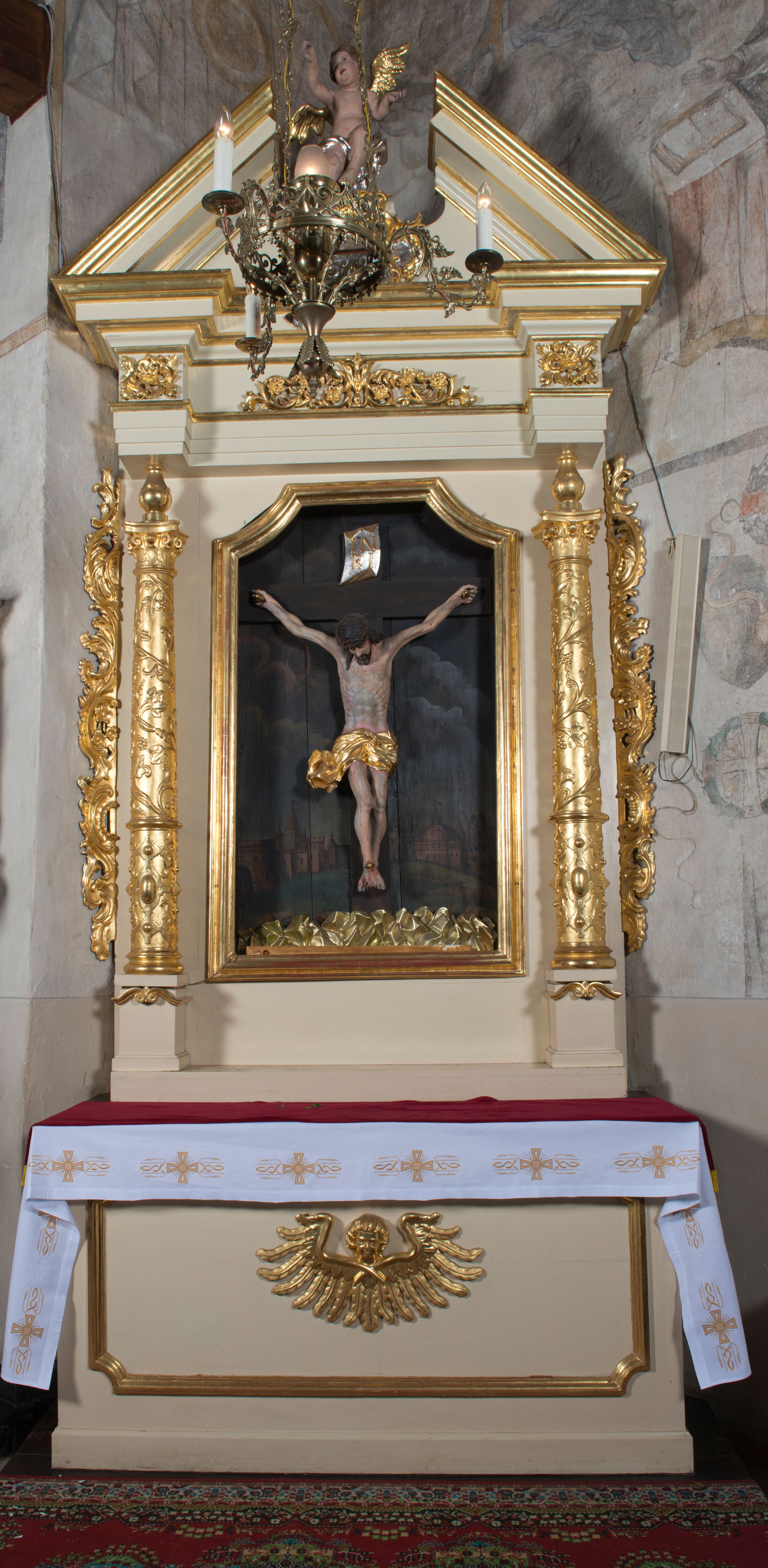 Ołtarz przyścienny, architektoniczny, jednoosiowy, jednokondygnacyjny. Ołtarz prostopadłościenny, skrzyniowy, mensa drewniana z kamiennym portatylem. Antepedium zdobione prostokątną płyciną o wklęsłych narożach, w której rzeźbiona uskrzydlona główka anielska. Retabulum ujęte parą kolumn, ustawionych na bazach. Trzony kolumn dekorowane w jednej trzeciej wysokości ornamentem okuciowym z rautami i kaboszonami, powyżej przewiązane opaską i zdobione w górnej części płaskorzeźbioną wicią winorośli. Powyżej kapiteli ustawione wazony wspierające wyłamane ponad nimi belkowanie z trójkątnym, przerwanym przyczółkiem. Pośrodku zwieńczenia pełnoplastyczna figura uskrzydlonego putta stojąca na kartuszu. Nastawa po bokach dekorowana ażurowymi, wąskimi uszakami formowanymi ze splotów z akantu i ornamentu rocaille'owego. Fryz zdobiony rzeźbioną wicią roślinną z rozetami. Pole środkowe w formie prostokątnej wnęki o wklęsłych górnych narożach, ujętej profilowaną ramą; wewnątrz rzeźbiony krucyfiks na malowanym tle Jerozolimy. Całość struktury ołtarza polichromowana w odcieniu jasnego beżu, detal architektoniczny, ornamentyka i profilowania złocone; pole kartusza i szata aniołka srebrzone.