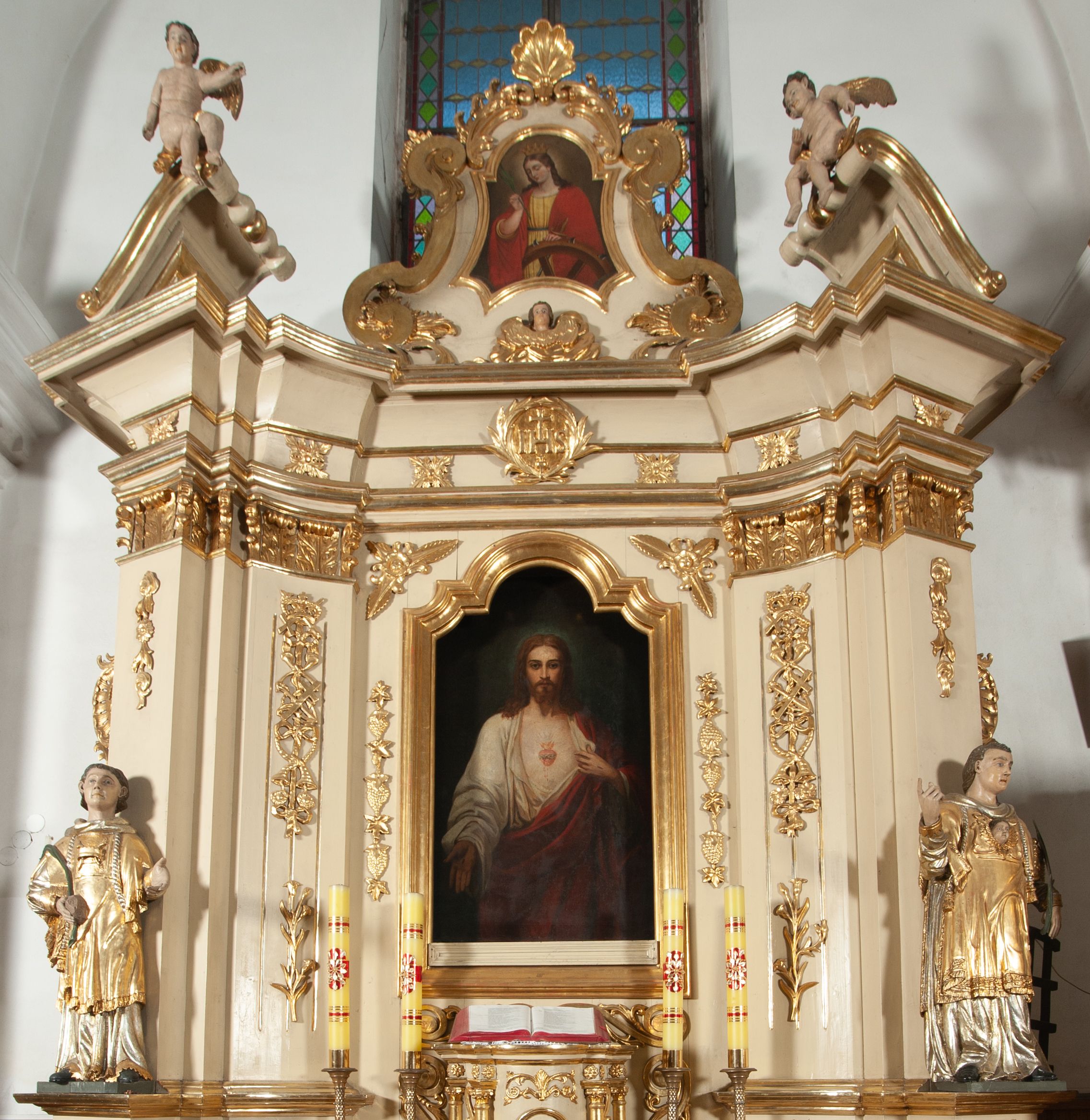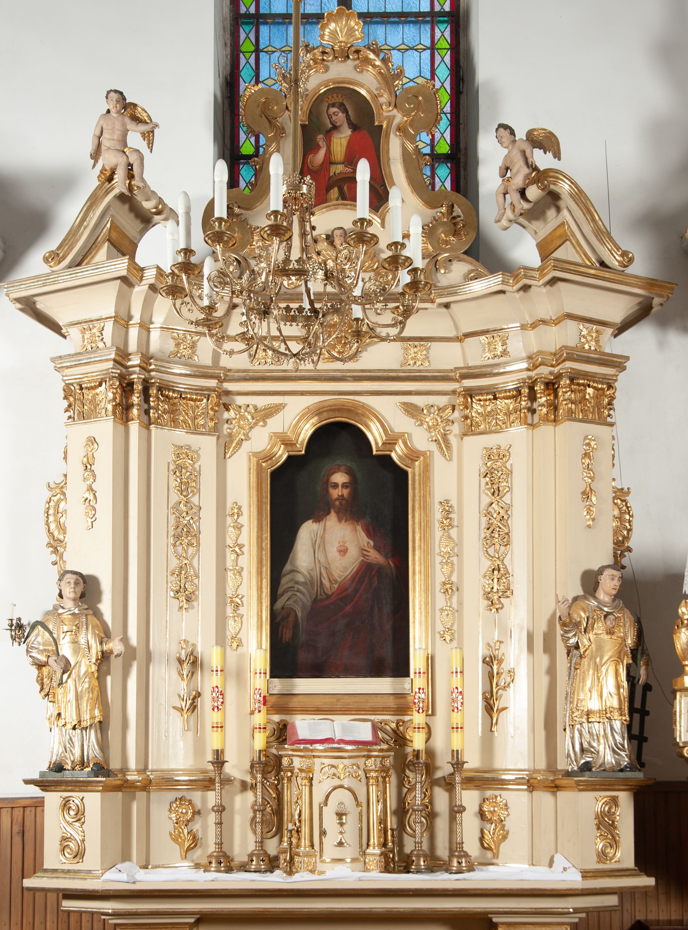 Ołtarz architektoniczny, jednokondygnacyjny, jednoosiowy ze zwieńczeniem. Ołtarz prostopadłościenny, z drewnianą mensą, z antepedium ujętym po bokach parą konsoli w formie wolut. Pole antepedium w postaci prostokątnej płyciny z płaskorzeźbionym motywem gorejącego serca pośrodku, ujętego promienistą glorią. Na mensie tabernakulum w formie prostopadłościennej szafki o wypukłej, przedniej ściance ujętej dwoma parami osadzonych na niewielkich cokołach kolumienek wspierających niepełne, wyłamujące się ponad nimi belkowanie. Drzwiczki w kształcie stojącego prostokąta zamkniętego półkolistym łukiem nadwieszonym, zdobione motywem płaskorzeźbionego kielicha eucharystycznego. Struktura zdobiona motywami rozet i wici roślinnej. Retabulum osadzone na niewysokim, zryzalitowanym po bokach cokole. Część środkową nastawy ujmuje para ustawionych skośnie filarów wspierających wyłamujące się ponad nimi belkowanie. Zamknięte półkoliście zwieńczenie ujmuje para spływów wolutowych oraz flankuje przerwany, wolutowy przyczółek. Pola wolutowych konsoli zdobi para liści akantu, cokół retabulum para stylizowanych słoneczników i S-kształtnych wici. Zewnętrzne pola trzonów filarów zdobią w górnych partiach ukwiecone gałązki, wewnętrzne motyw podwieszeń skomponowanych z zamkniętej korony, krzyżujących się rogów obfitości i krzyża z kotwicą, oraz kokard, u dołu para gałązek. Boki pola środkowego z motywem wici winnego grona, u góry w narożach para ulistnionych rozet. Fryz zdobiony rozetami, pośrodku kartusz w monogramem imienia Jezus ujętym parą gałązek laurowych. Retabulum flankowane parą ażurowych uszaków rocaille’owych. W dolnej partii zwieńczenia uskrzydlona główka anielska, szczyt w formie konchy ujętej po bokach parą rocaille’i. Na przerwanym przyczółku para figur aniołków. Pole części środkowej w kształcie stojącego prostokąta zamkniętego półkolistym łukiem nadwieszonym z uskokami, ujęte profilowaną, złoconą ramą, w środku wizerunek Najświętszego Serca Jezusa. Po bokach, na tle filarów para figur, po lewej św. Szczepan, po prawej św. Wawrzyniec. W zwieńczeniu obraz w kształcie trapezu o wklęsłych ramionach, podstawie i dolnych narożach, zamknięty półkolistym łukiem nadwieszonym, ujęty profilowaną, złoconą ramą, z wizerunkiem św. Katarzyny Aleksandryjskiej.