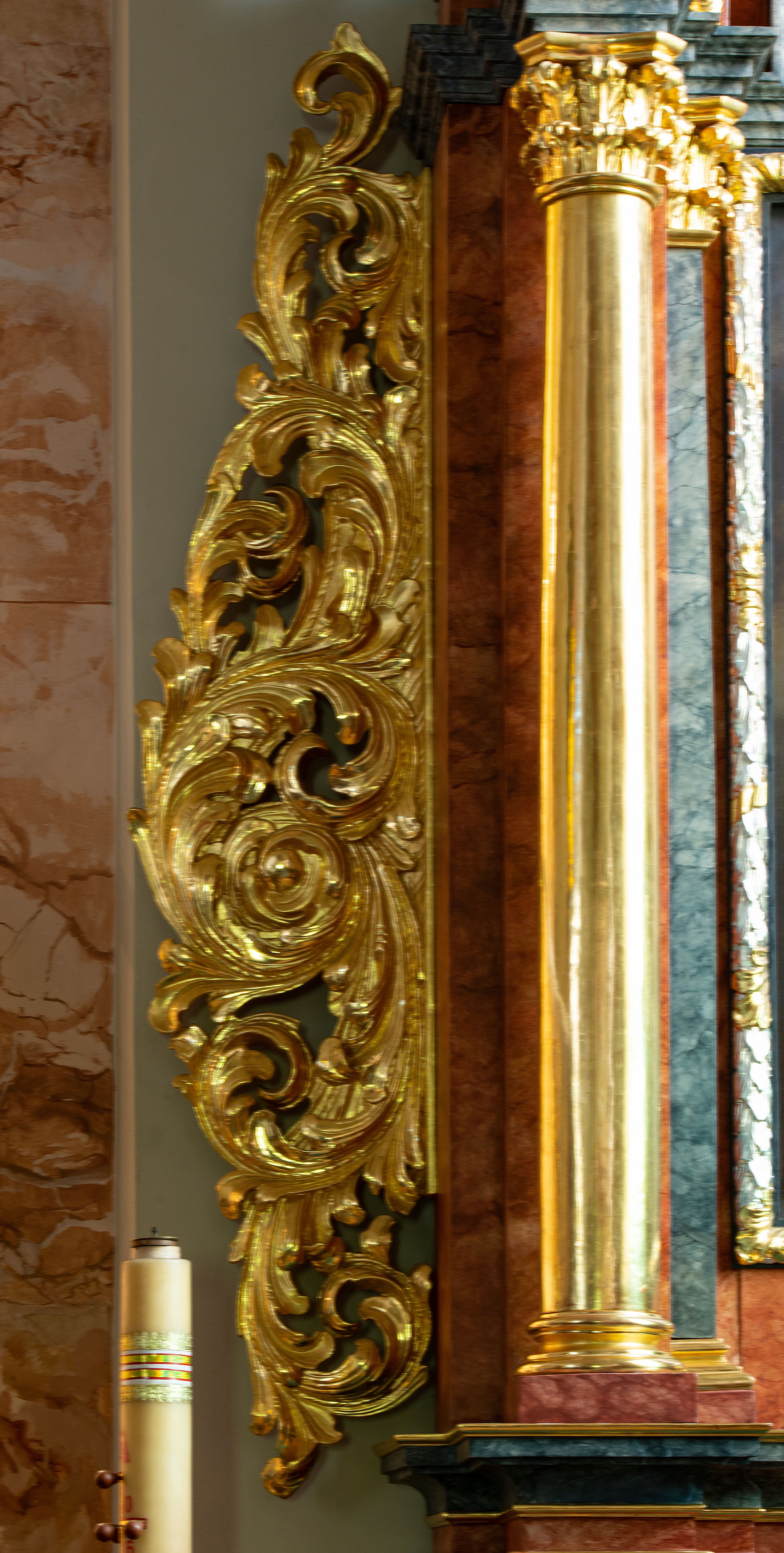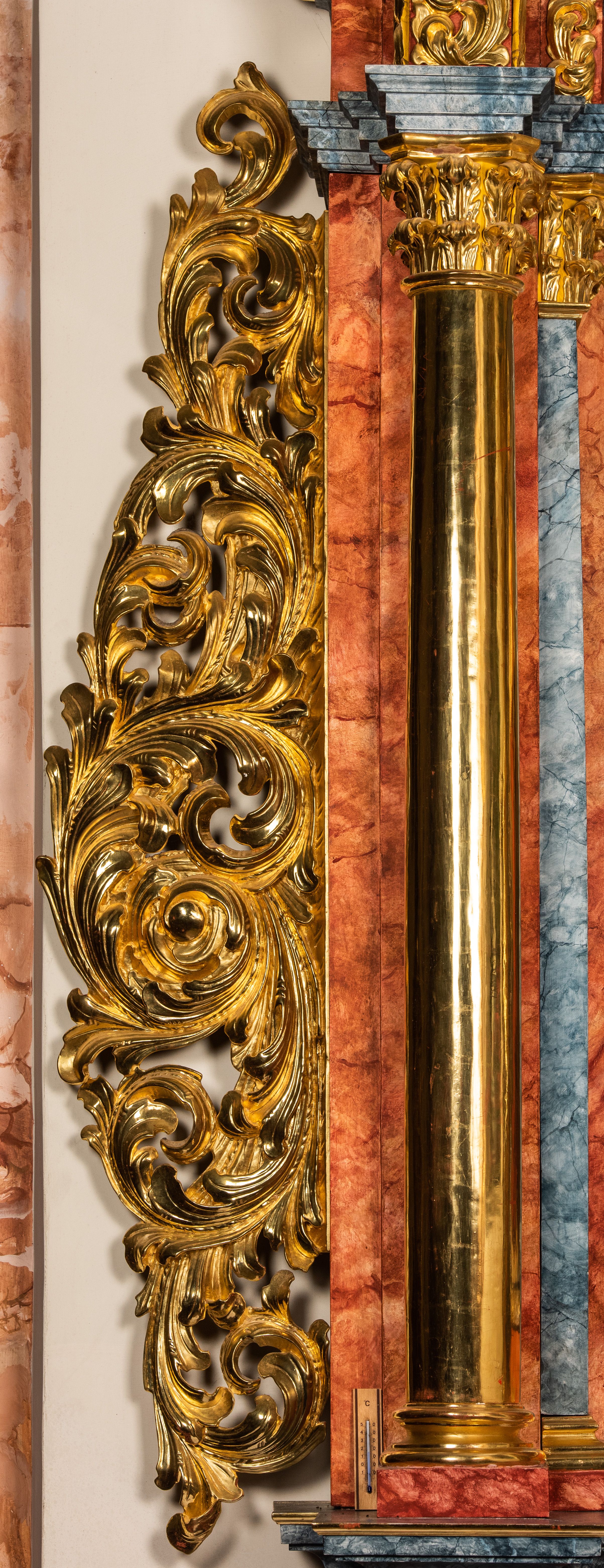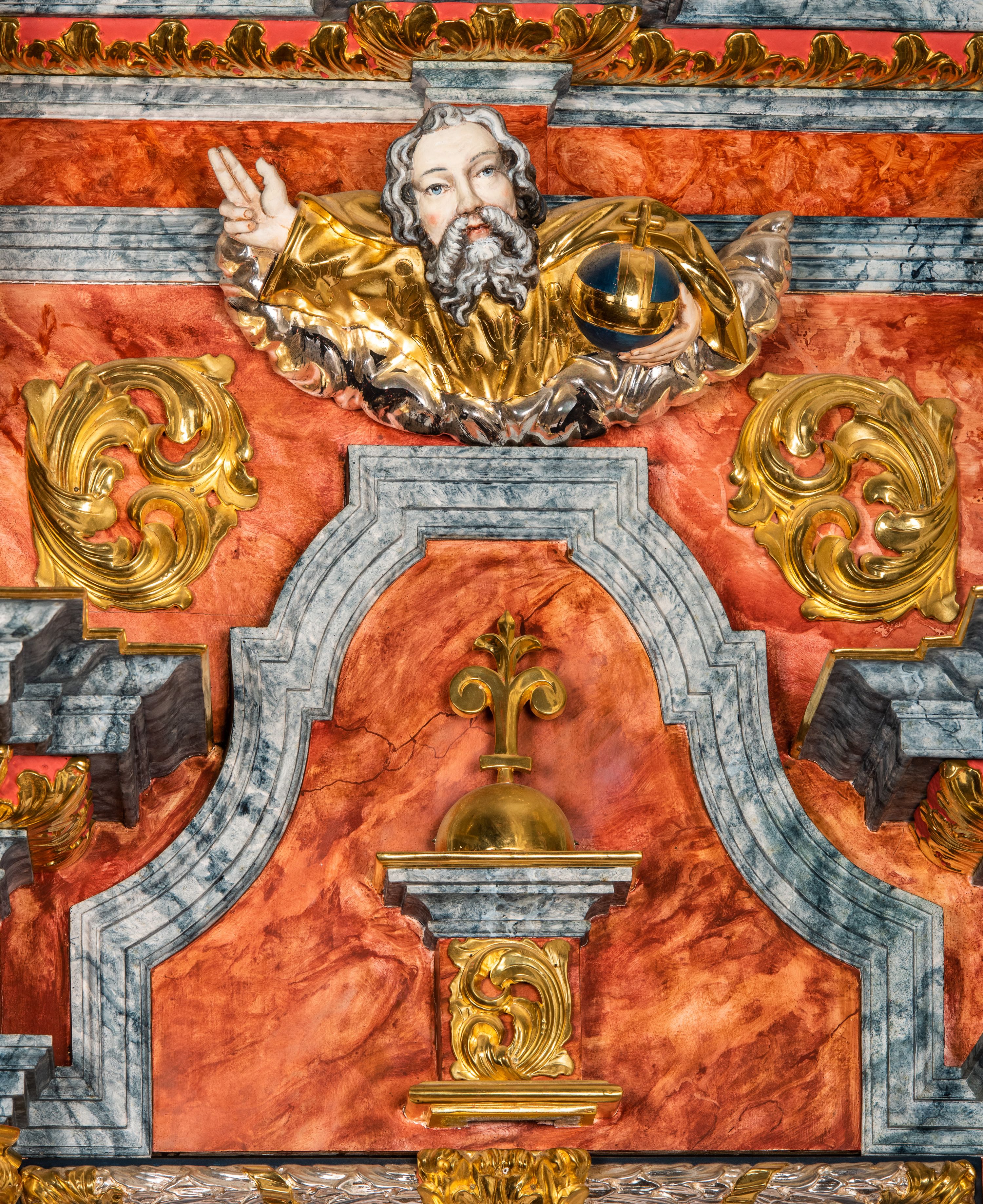 Struktura marmoryzowana w odcieniach brązów i szarości. Partie detalu architektonicznego i ornamentyka złocone i srebrzone.
