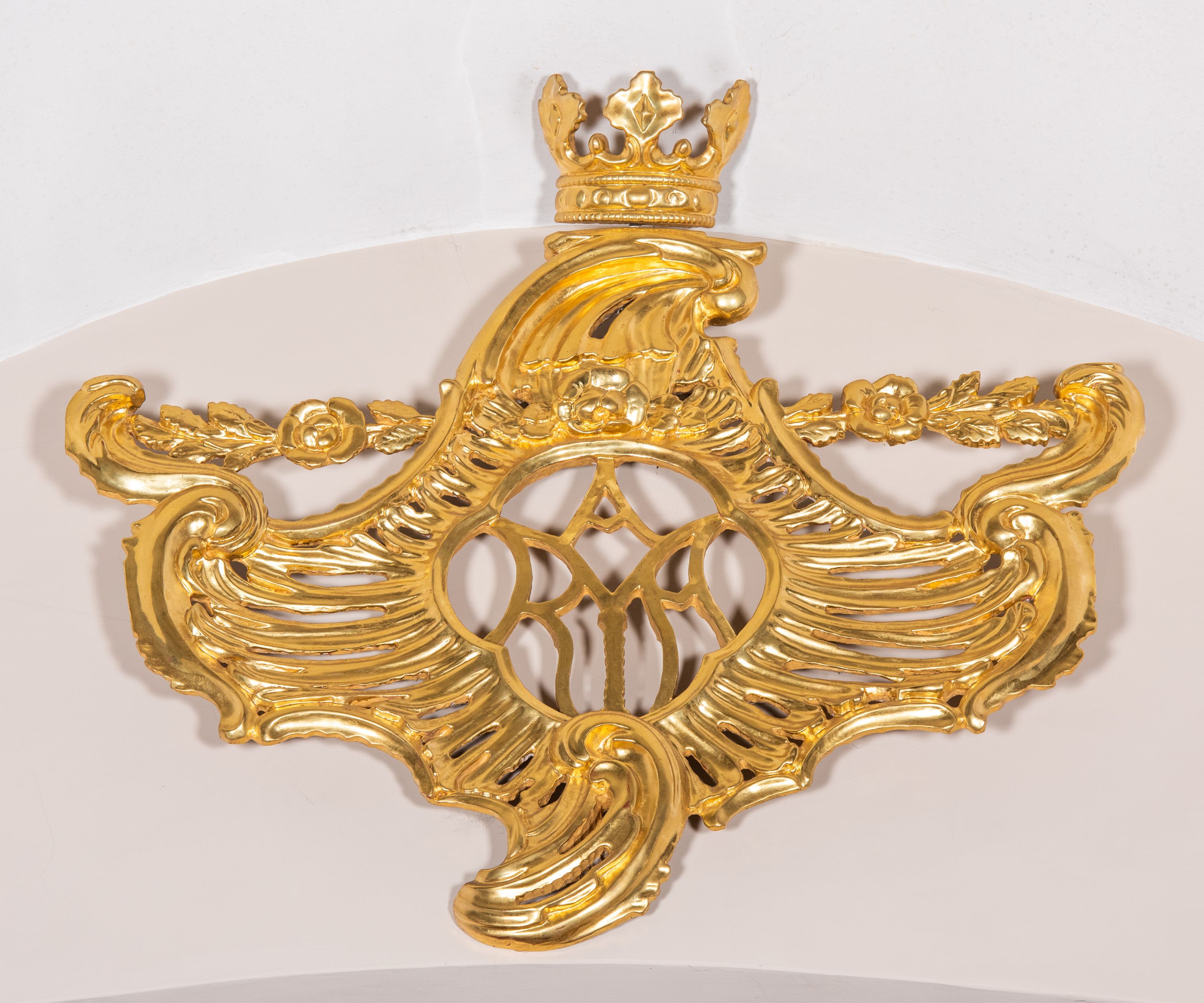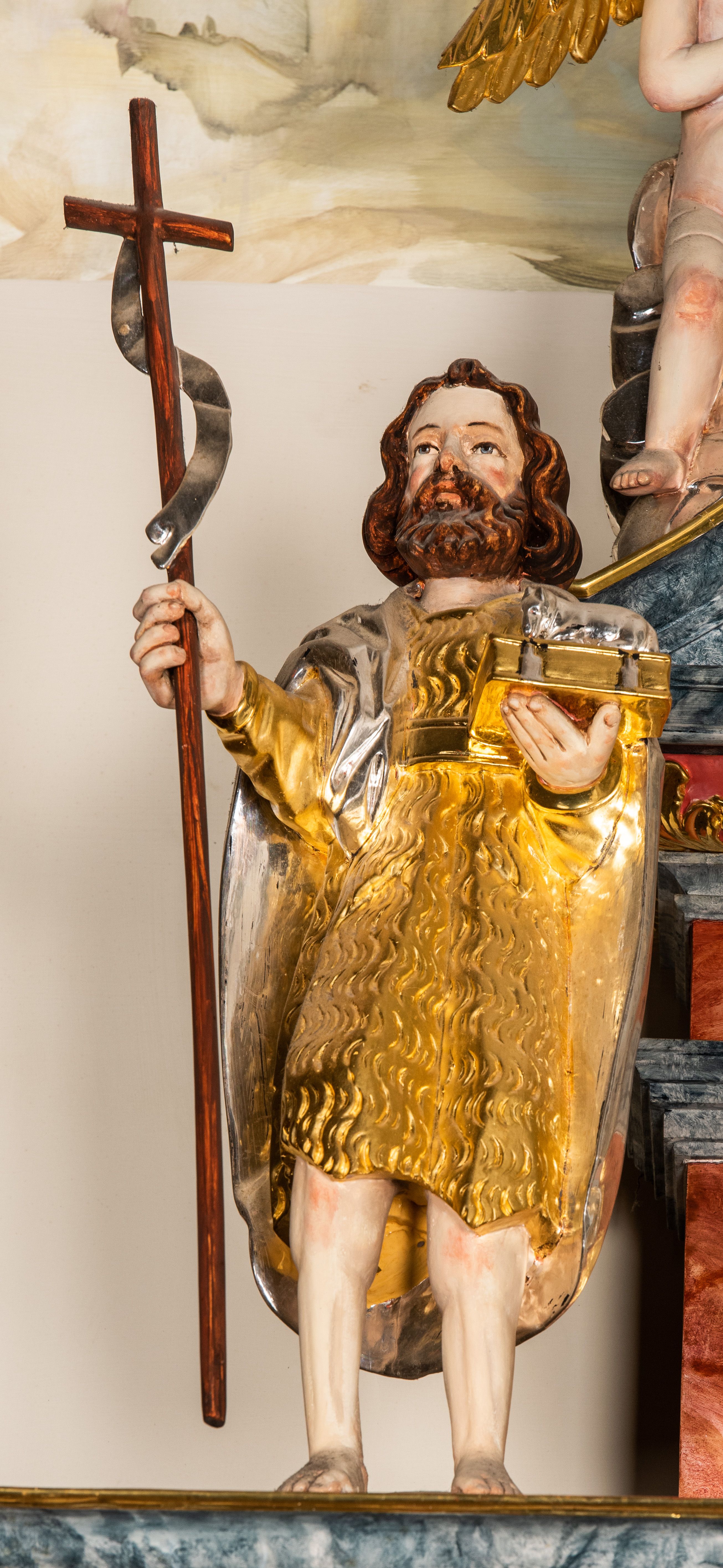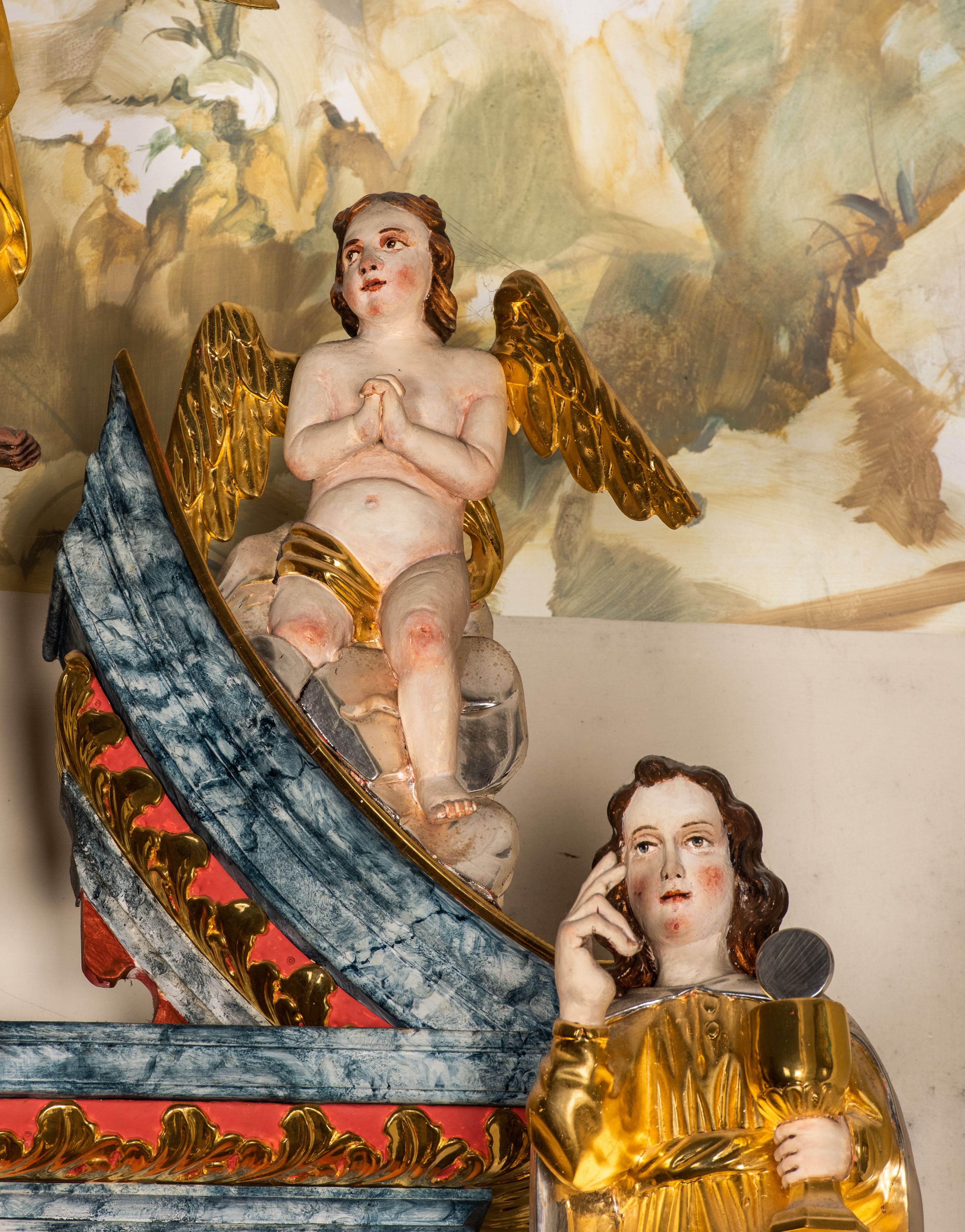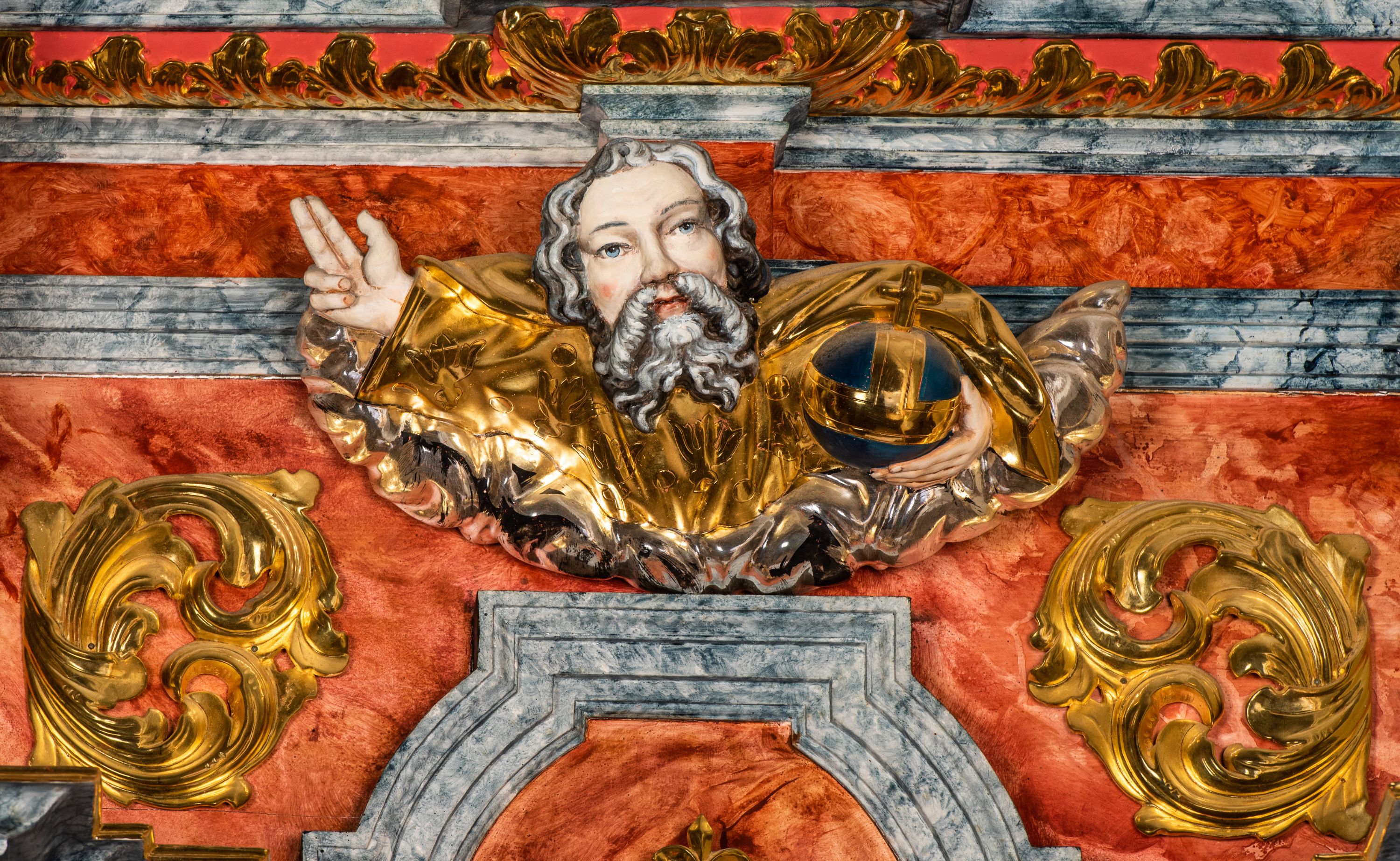 Struktura marmoryzowana w odcieniach brązów i szarości. Partie detalu architektonicznego i ornamentyka złocone i srebrzone.