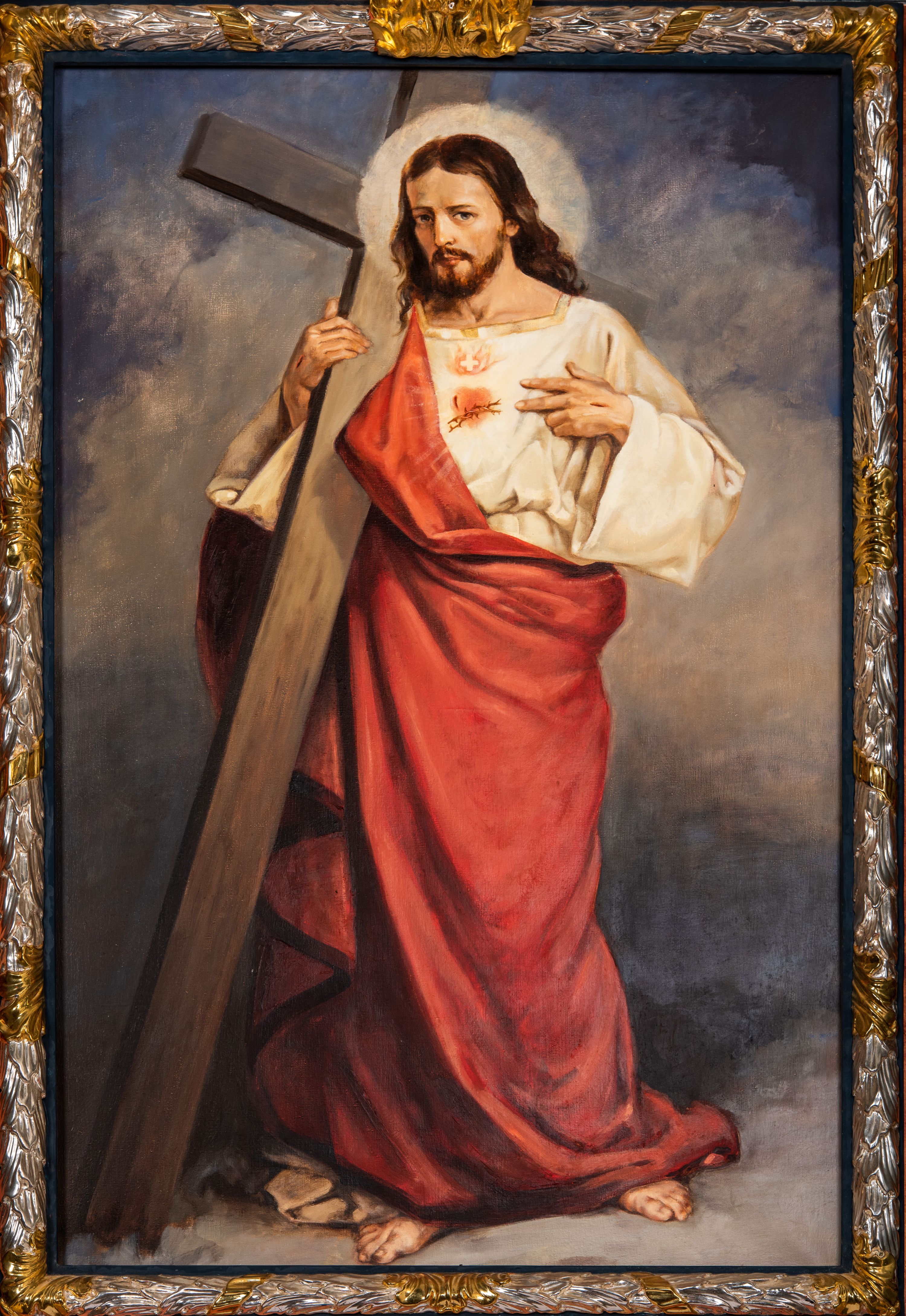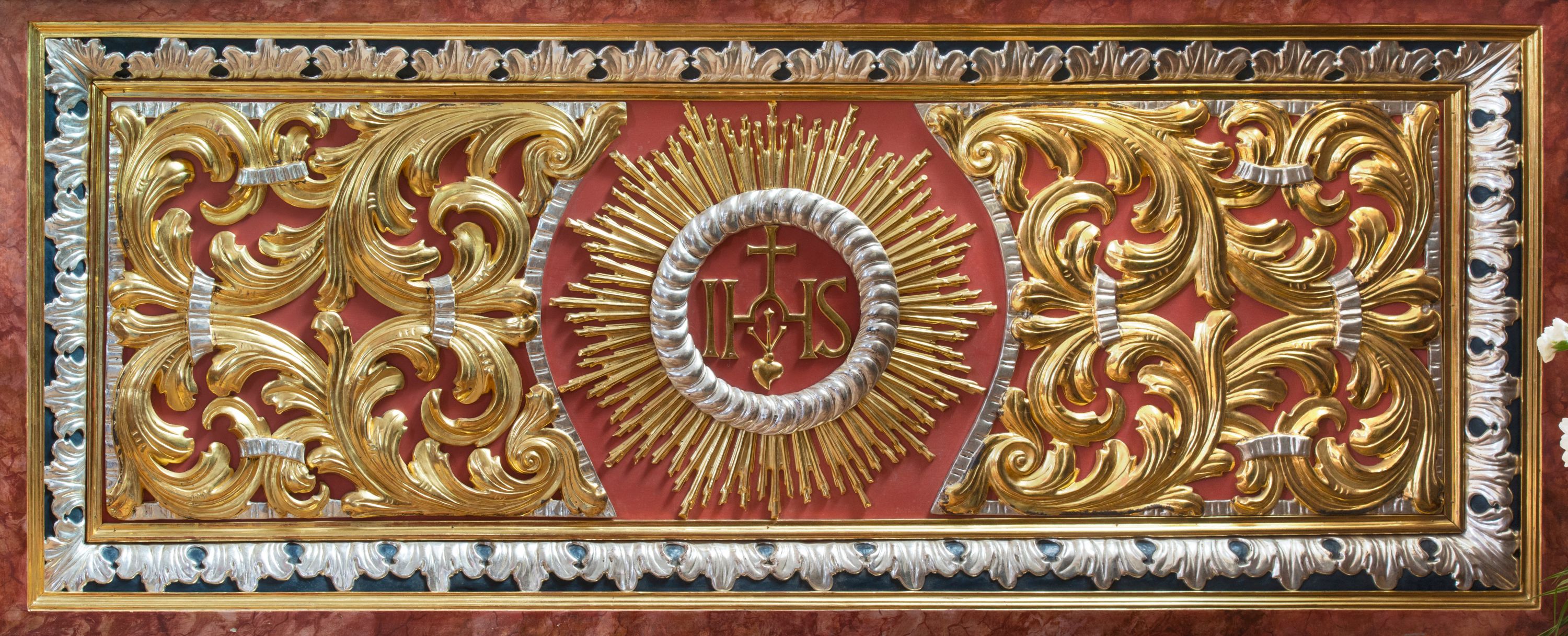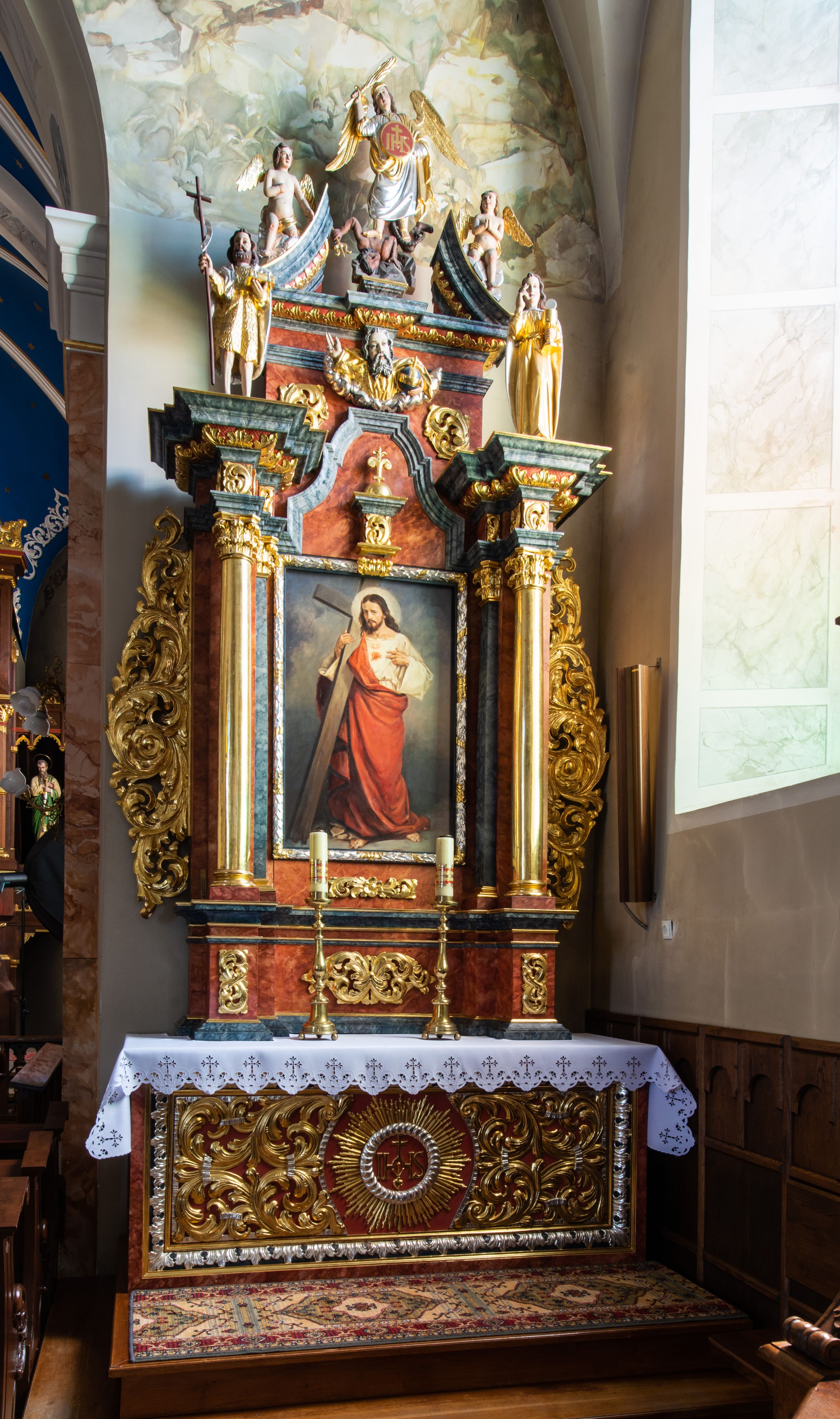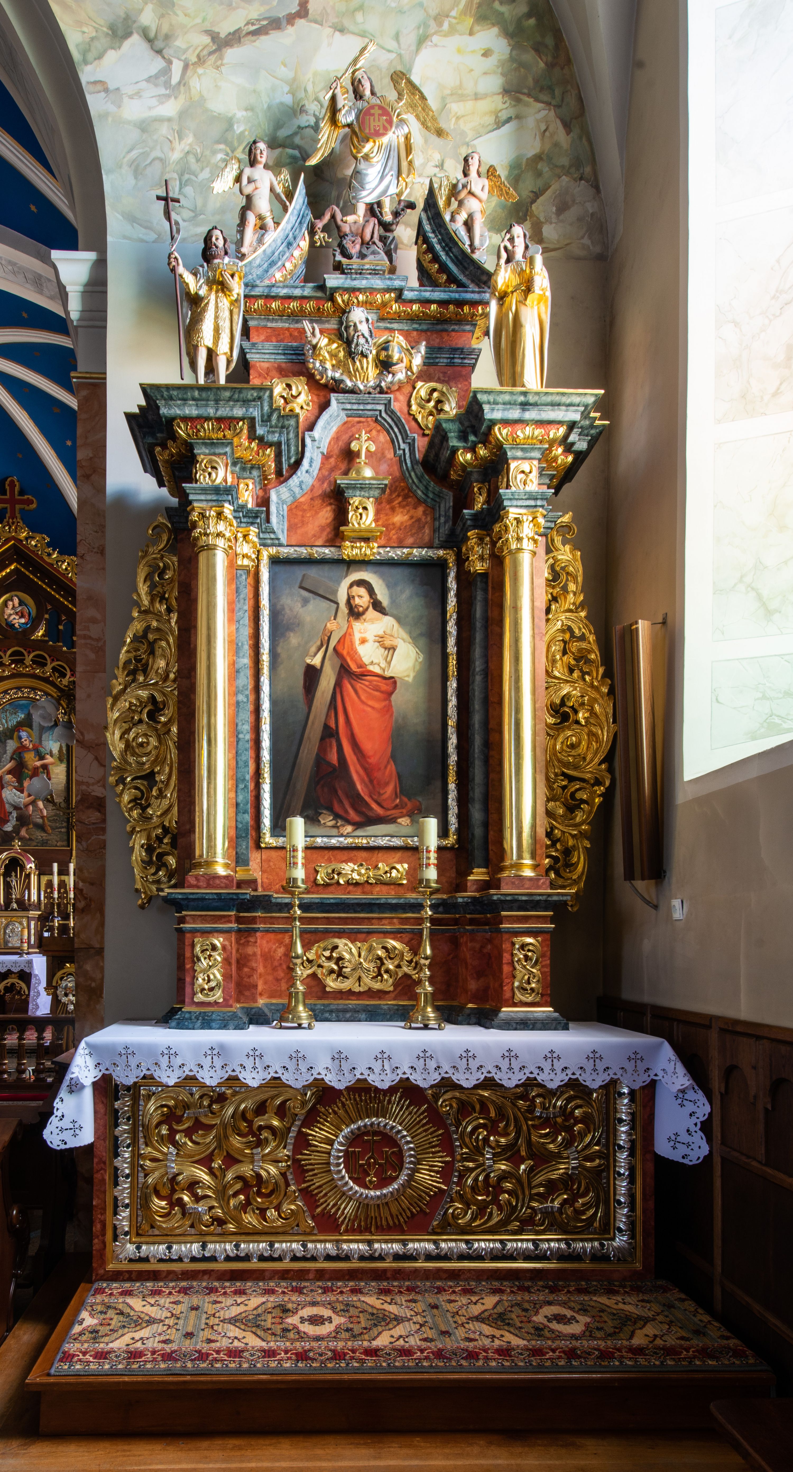 Antependium, pośrodku z motywem płaskorzeźbionego monogramu IHS i gorejącego Serca Jezusa ujętego wieńcem srebrzonych obłoków i promienistą glorią. Powierzchnia boków płyciny antependium pokryta wicią akantową. W polach cokołu dolnej kondygnacji retabulum i w dolnej partii części środkowej retabulum oraz w części belkowania ornamentyka akantowa. W górnej partii części środkowej, po środku niewielki cokolik zdobiony fragmentem wici akantowej zwieńczony półkulą z kwiatonem ujętym parą antytetycznych wolut. Dolna kondygnacja retabulum ujęta parą ażurowych, akantowych uszaków. Boki górnej kondygnacji zdobione motywem ornamentu akantowego. Partie gzymsu z ornamentyką roślinną. Pole części środkowej dolnej kondygnacji w kształcie stojącego prostokąta ujętego srebrzona i złoconą ramą w formie półwałka, zdobioną motywem liści laurowych. W środku obraz Serce Jezusa. W zwieńczeniu rzeźbione popiersie Boga Ojca. Kondygnacja ta ujęta parą rzeźb św. Jana Chrzciciela po lewej stronie i św. Jana Ewangelisty po prawej. Po środku zwieńczenia figura Archanioła Michała. Na krawędziach przerwanego przyczółka para aniołków przyklękających na srebrzonych obłokach.