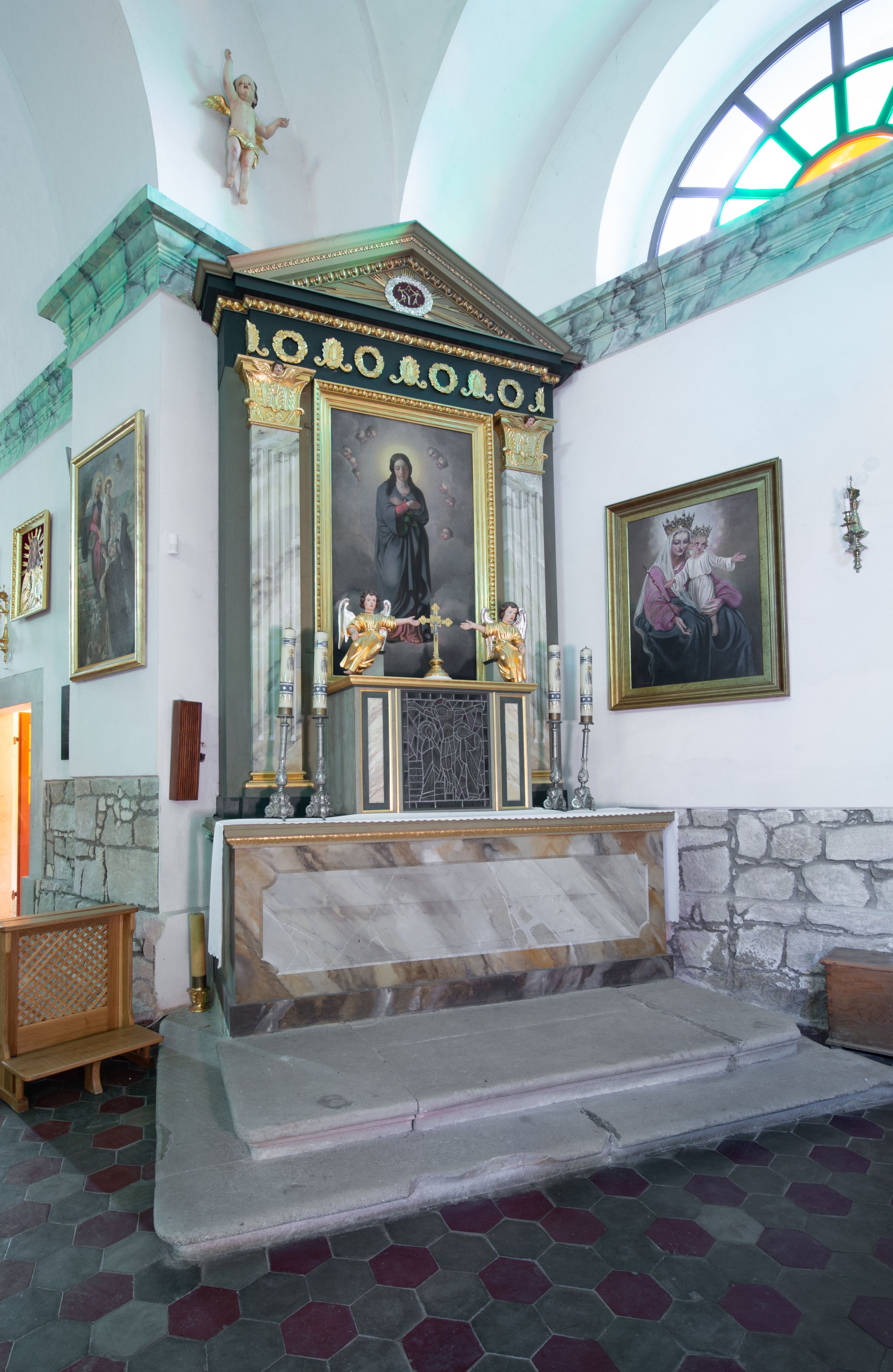 Nastawa architektoniczna, jednoosiowa, jednokondygnacyjna. Ołtarz drewniany, prostopadłościenny, na cokole, z malowaną płyciną na ściance przedniej w formie leżącego prostokąta o wklęsłych bokach, polichromowane na sposób imitujący marmoryzację w różnych odcieniach brązu. Zakończone profilowanym gzymsem, dekorowanym złoconym ornamentem roślinnym. Mensa drewniana. Na ołtarzu ustawione tabernakulum w formie drewnianej, prostopadłościennej skrzynki. Na przedniej ściance witraż z przedstawieniem sceny Ukrzyżowania, flankowany dwiema płycinami. Całość obwiedziona profilowanym, złoconym gzymsem. Na tabernakulum dwa cokoły z siedzącymi aniołami. Nastawa ujęta dwoma pilastrami o kanelowanych trzonach, dźwigających niepełne belkowanie i trójkątny przyczółek. Fryz dekorowany ustawionymi naprzemiennie anthemionami i wieńcami, belkowanie i przyczółek zdobione kimationem. W polu przyczółka owalny medalion z monogramem Marii, ujęty wieńcem, w glorii promienistej. W polu środkowym obraz w formie stojącego prostokąta z wizerunkiem Matki Boskiej, ujęty profilowaną ramą dekorowaną kimationem. Nastawa polichromowana jest w kolorze szarym, trzony pilastrów są marmoryzowane, belkowanie o barwie zielono-niebieskiej. Profile, kapitele i dekoracja złocone, wieniec srebrzony.