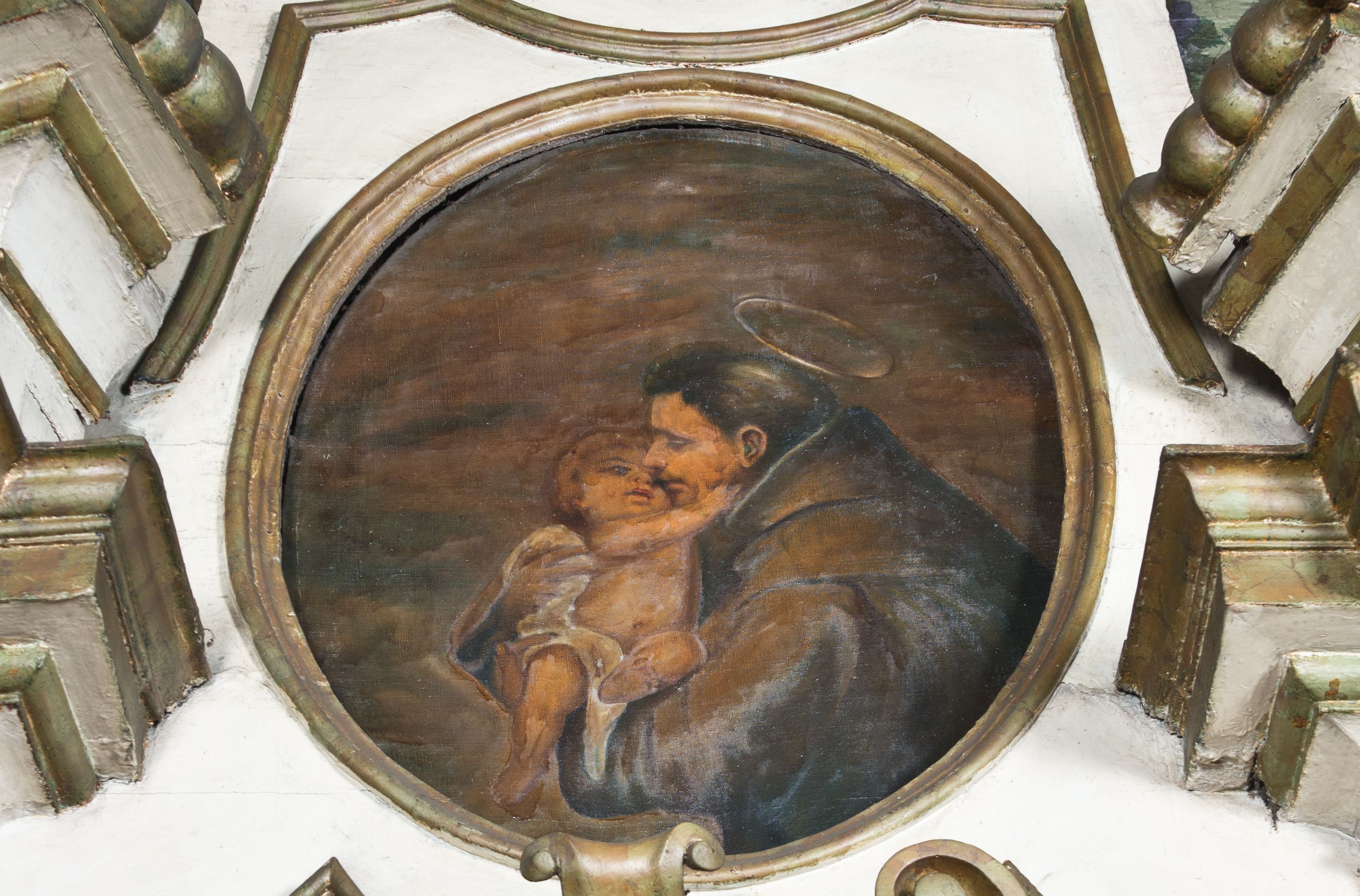 Przyścienne retabulum wznosi się nad sarkofagowym stipesie z drewnianą mensą z kamiennym portatylem, ustawowym na cokole, wspartym na drewnianym podeście. Stipes zwęża się ku dołowi. Od frontu zdobi go fantazyjne obramienie utworzone z profilowanej listwy przechodzącej na środku w płaskorzeźbiony ornament muszlowy. Ponad ołtarzem wznosi się jednoosiowe i jednokondygnacyjne retabulum ze zwieńczeniem ustawione na wysokim cokole. Nastawę artykułuje para zdwojonych pilastrów o korynckich głowicach z trzonami dekorowanymi zawieszonymi na wstęgach festonach owocowo-kwiatowych. Pilastry dźwigają imposty o wyłamanym wklęśle gzymsie, oraz przerwany półkolisty przyczółek. Imposty połączone zostały architrawem nad polem głównym, przyjmującym kształt odwróconego łuku odcinkowego, dekorowanego muszlowym kartuszem z napisem: „ORA PRO NOBIS / SANCTA DEI / GENITRIX”. W polu środkowym umieszczono obraz Matki Boskiej z Dzieciątkiem w formie stojącego prostokąta ujęty profilowaną ramą. Poniżej obrazu znalazła się ramka w formie leżącego prostokąta o wklęsłych bokach. Zwieńczenie uzyskało formę stojącego prostokąta o wklęsłych bokach zamknięty całującymi się wolutami i muszlą. W polu zwieńczenia umieszczono owalny obraz św. Antoniego Padewskiego, ujęty profilowaną ramą. Ponad nim znajdują się dekoracyjne, profilowane listewki układające się w fantazyjne kształty. Po bokach retabulum usytuowano zredukowane uszaki w formie wąskich, ażurowych wici roślinnych. Strukturę nastawy polichromowano na biało, ornamentyka i profile pierwotnie były złocone.