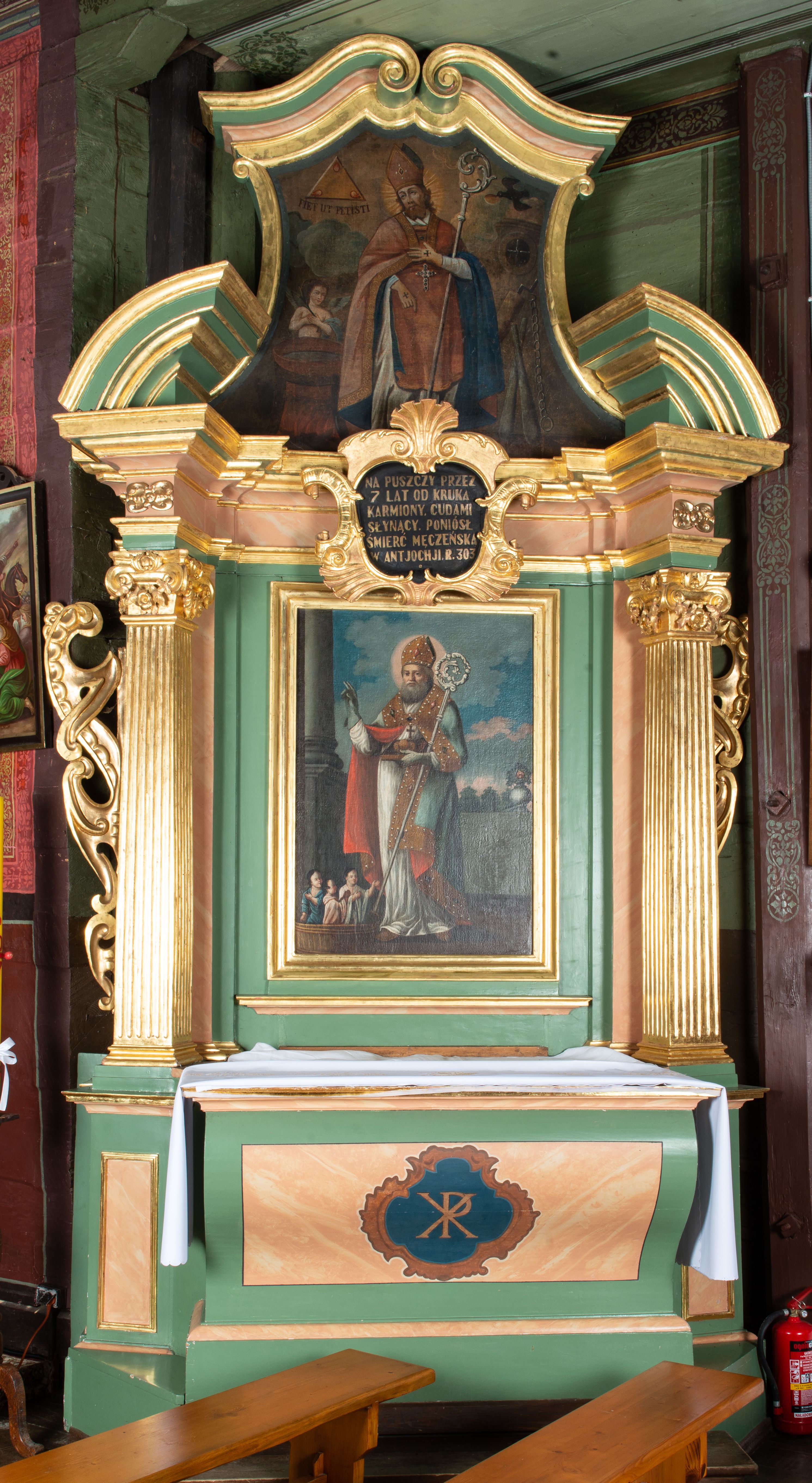 Ołtarz prostopadłościenny, górą wybrzuszony, z ukośnie dostawionymi cokołami, na których kanelowane wolnostojące filary z kompozytowymi kapitelami podtrzymujące wyłamane belkowanie z przerwanym przyczółkiem. Zwieńczenie z lekko wklęsłymi bokami ze spływami wolutowymi zakończone stykającymi się ze sobą wolutami. W partii belkowania kartusz ujęty karbowanymi wstęgami regencyjnymi, wolutami z listkami akantu i zwieńczony muszlą palmetową, w nim napis białą farbą na czarnym tle: „NA PUSZCZY PRZEZ / 7 LAT OD KRUKA / KARMIONY. CUDAMI / SŁYNĄCY. PONIÓSŁ / ŚMIERĆ MĘCZEŃSKĄ / W ANTJOCHJI R. 303”.