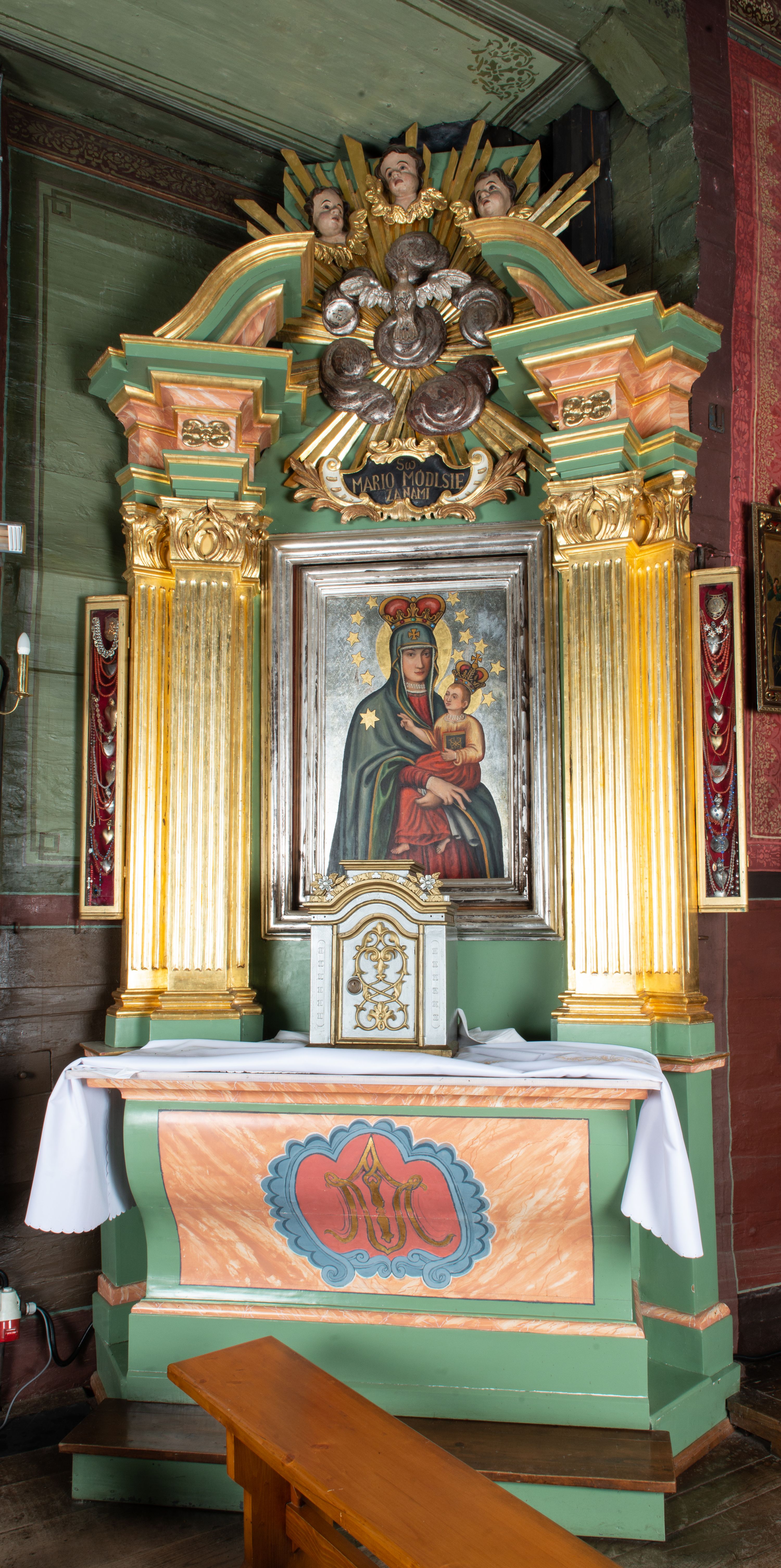 Ołtarz drewniany, ustawiony na jednostopniowej podstawie, jednokondygnacyjny, jednoosiowy ze zwieńczeniem. Ołtarz sarkofagowy z drewnianą mensą i marmurowym portatylem. Antepedium marmoryzowane, z prostokątnym polem z kartuszem i monogramem Marii.