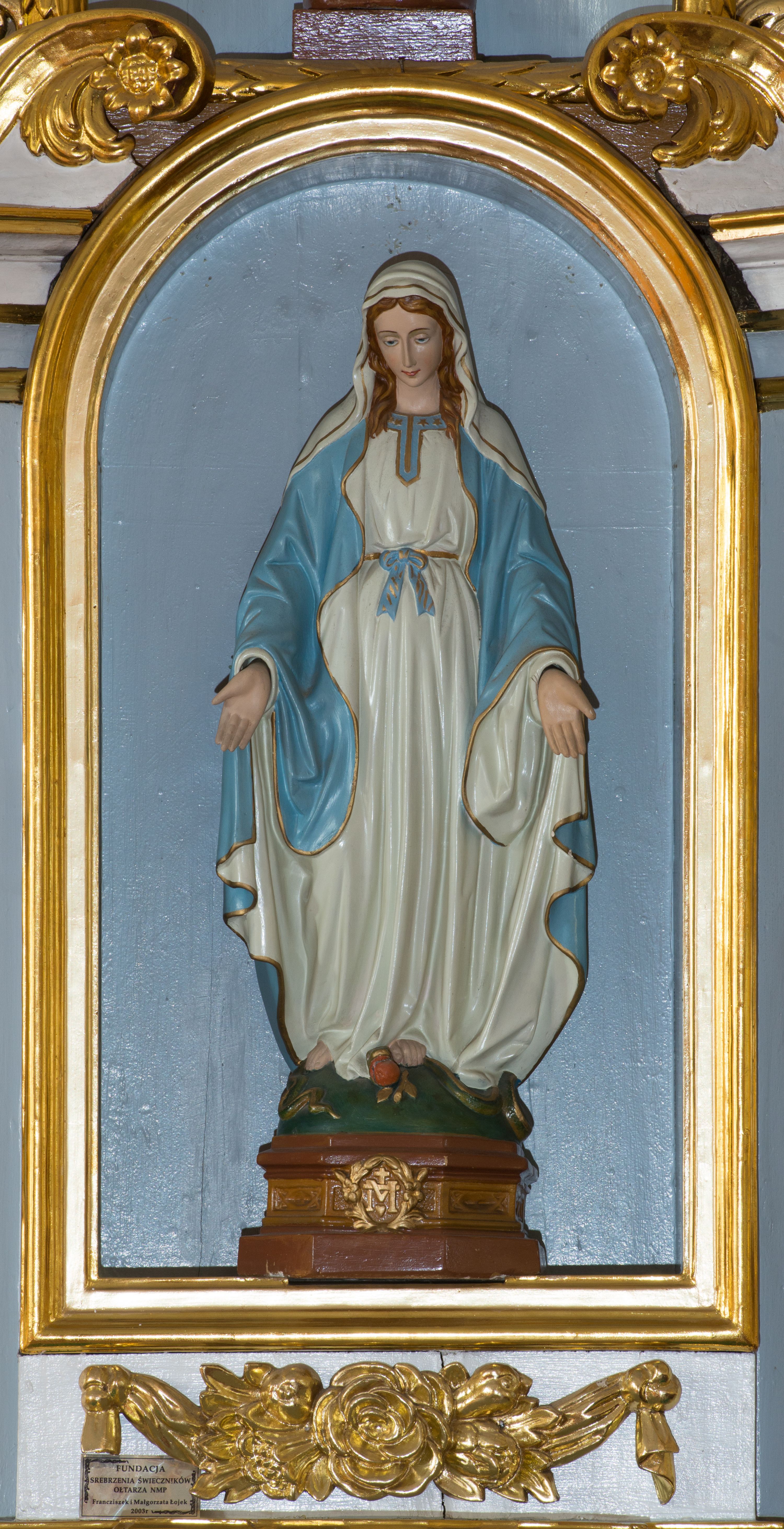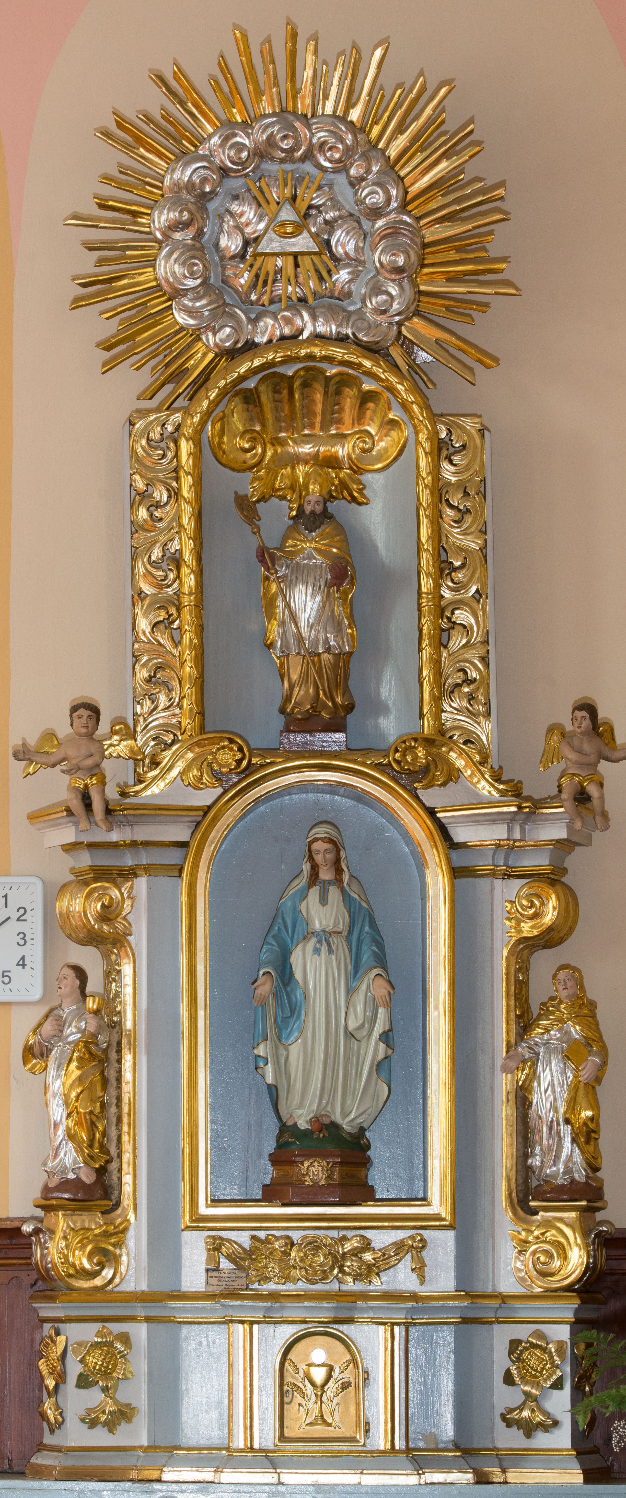 Nastawa na niewysokim, uskokowym cokole o ukośnie ustawionych bokach, zdobionych słonecznikami. W środkowej partii cokołu wkomponowane tabernakulum w formie prostopadłościennej szafki na profilowanym, uskokowym cokole z narożami ujętymi dwoma parami pilastrów z półwałkiem pośrodku trzonu, wspierających profilowany, uskokowy gzyms. Drzwiczki tabernakulum w kształcie prostokąta zamkniętego łukiem półkolistym, w polu płaskorzeźbiony kielich z Hostią oraz kłosami zbóż. Kondygnacja flankowana parą zdwojonych pilastrów oraz dostawionych, ustawionych pod kątem pilastrów z nałożonymi spływami wolutowymi. Podpory wspierają przerywane, niepełne belkowanie oraz przyczółek. Pole środkowe zajmuje wnęka w kształcie stojącego prostokąta, zamkniętego półkoliście. W polu figura Matki Boskiej Niepokalanie Poczętej. Pod wnęką podwieszona, rzeźbiona girlanda. Po lewej stronie kondygnacji, na cokole ułożonym na zakończeniu woluty ustawiona jest rzeźba św. Jana Ewangelisty, a po drugiej stronie figura nierozpoznanej świętej. Na belkowaniu usadzona jest para aniołków. Druga kondygnacja w formie wnęki w kształcie stojącego prostokąta, zamkniętego półkoliście, flankowana po bokach filarami, ozdobionymi liśćmi akantu. W polu umieszczona rzeźba św. Mikołaja. Nad rzeźbą stylizowana duża muszla palmetowa z podwieszonymi liśćmi akantu. Zwieńczenie w formie promienistej glorii z Okiem Opatrzności pośrodku, ujętej wieńcem srebrzonych obłoków. Struktura polichromowana na biało, detal architektoniczny i ornamentyka złocone oraz srebrzone. Na cokole tabliczka z napisem: „FUNDACJA / SREBRZENIE ŚWIECZNIKÓW / OŁTARZA NMP / Franciszek i Małgorzata Łojek / 2003”.