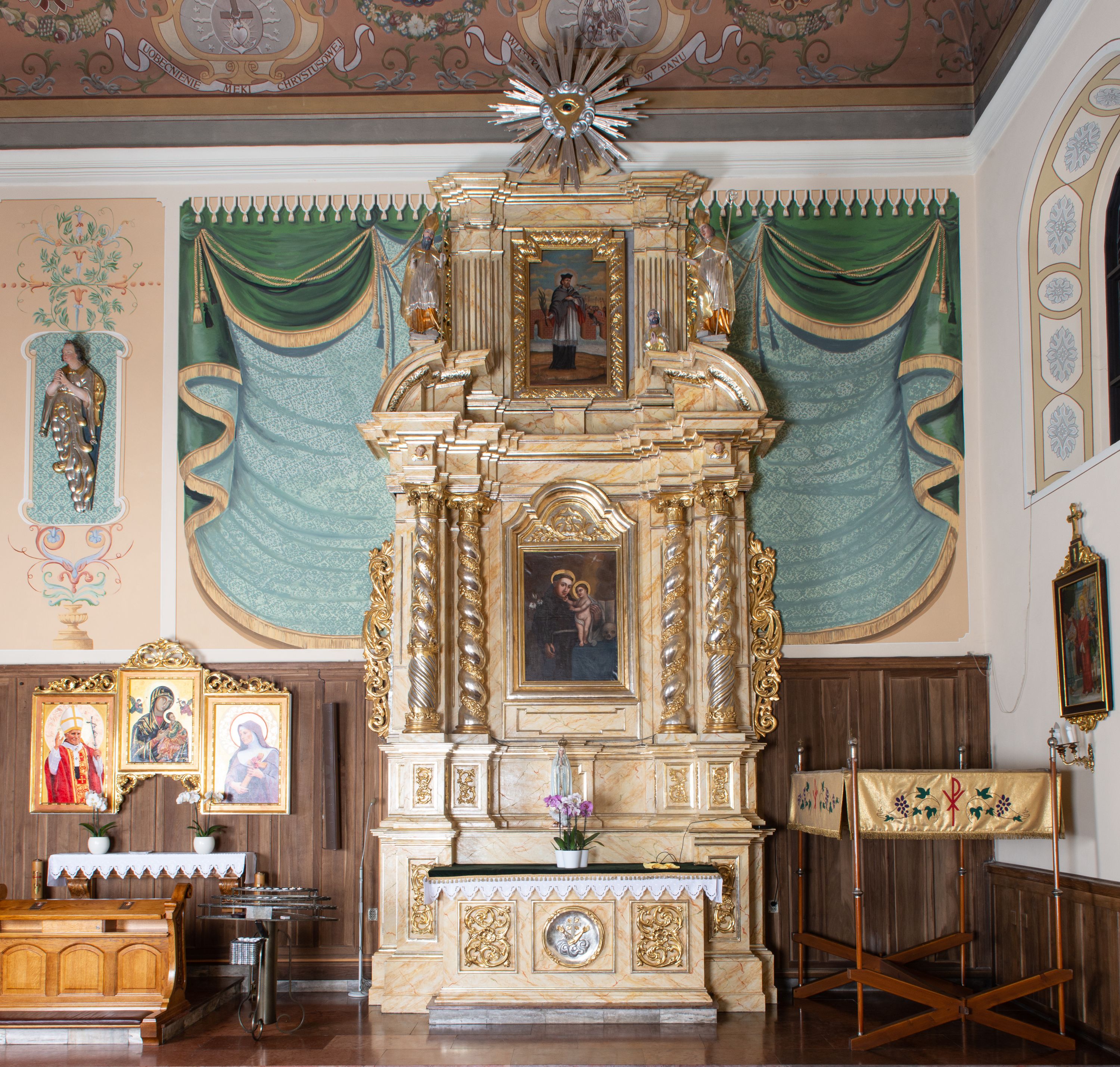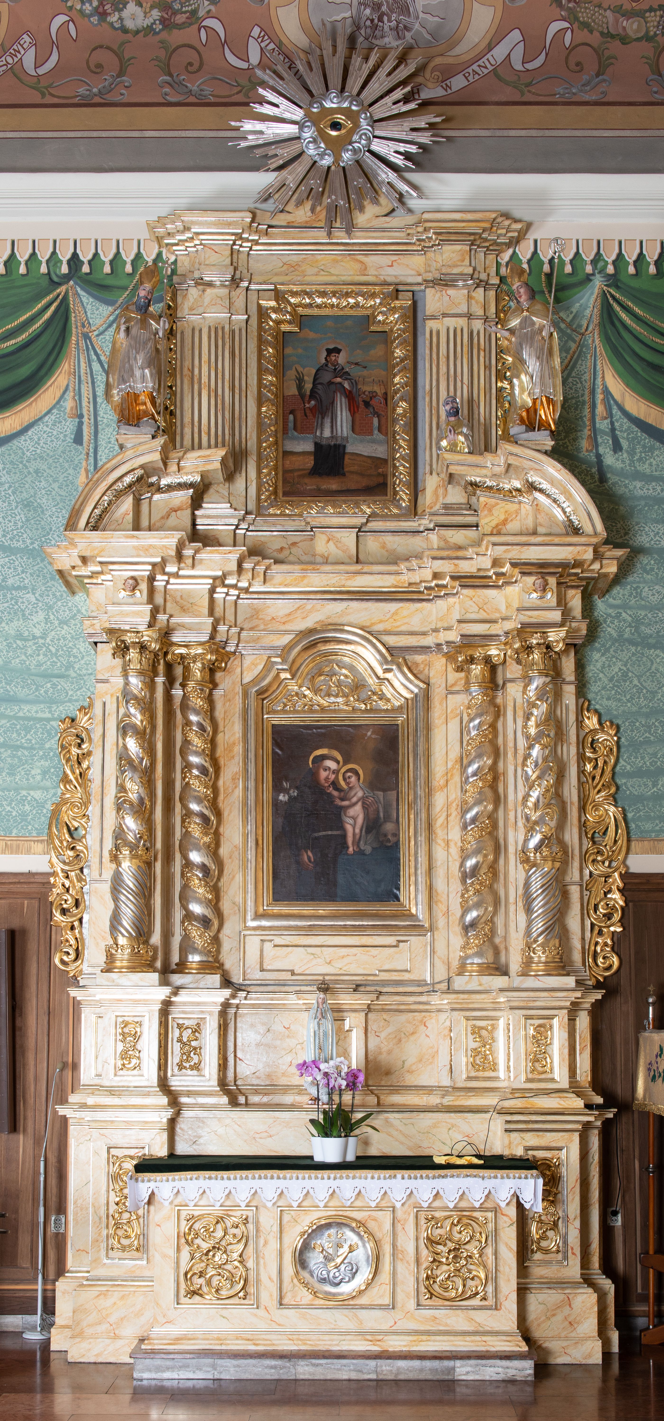 Nastawa ustawiona na zdwojonym cokole, dekorowanym płycinami, wypełnionymi liśćmi akantu. Pierwsza kondygnacja flankowana pilastrami oraz ustawionymi na skraju filarami, przed nimi dwie pary kolumn, z których zewnętrzna wysunięta jest do przodu. Podpory wspierają wyłamane belkowanie i przerywany przyczółek. Trzony pilastrów i filarów kanelowane, trzony kolumn skręcone i oplecione wicią roślinną, kapitele kolumn kompozytowe. W polu głównym umieszczony jest obraz św. Antoniego Dzieciątkiem w ramie w kształcie stojącego prostokąta, zamkniętego łukiem wklęsło-wypukłym z uskokami. Nad obrazem płaskorzeźbiony wieniec chwały, dwie gałązki i sygle „S[WIĘTY] A[NTONI]”. Druga kondygnacja ujęta parą zdwojonych pilastrów. Podpory wspierają wyłamane belkowanie. W polu głównym obraz w kształcie stojącego prostokąta z przedstawieniem św. Jana Nepomucena. Trzony pilastrów kanelowane. Na szczycie umieszczona jest promienista gloria Okiem Opatrzności na tle obłoków. Po bokach zwieńczenia na wysokich cokołach figury św. Wojciecha po lewej stroni i św. Stanisława po prawej. Boki obu kondygnacji zdobione są ażurowymi uszami z liśćmi akantu. Struktura marmoryzowana w odcieniu jasnobeżowym z brązowym i czerwonym żyłkowaniem; ornamentyka, kolumny i profilowania złocone, detale srebrzone.