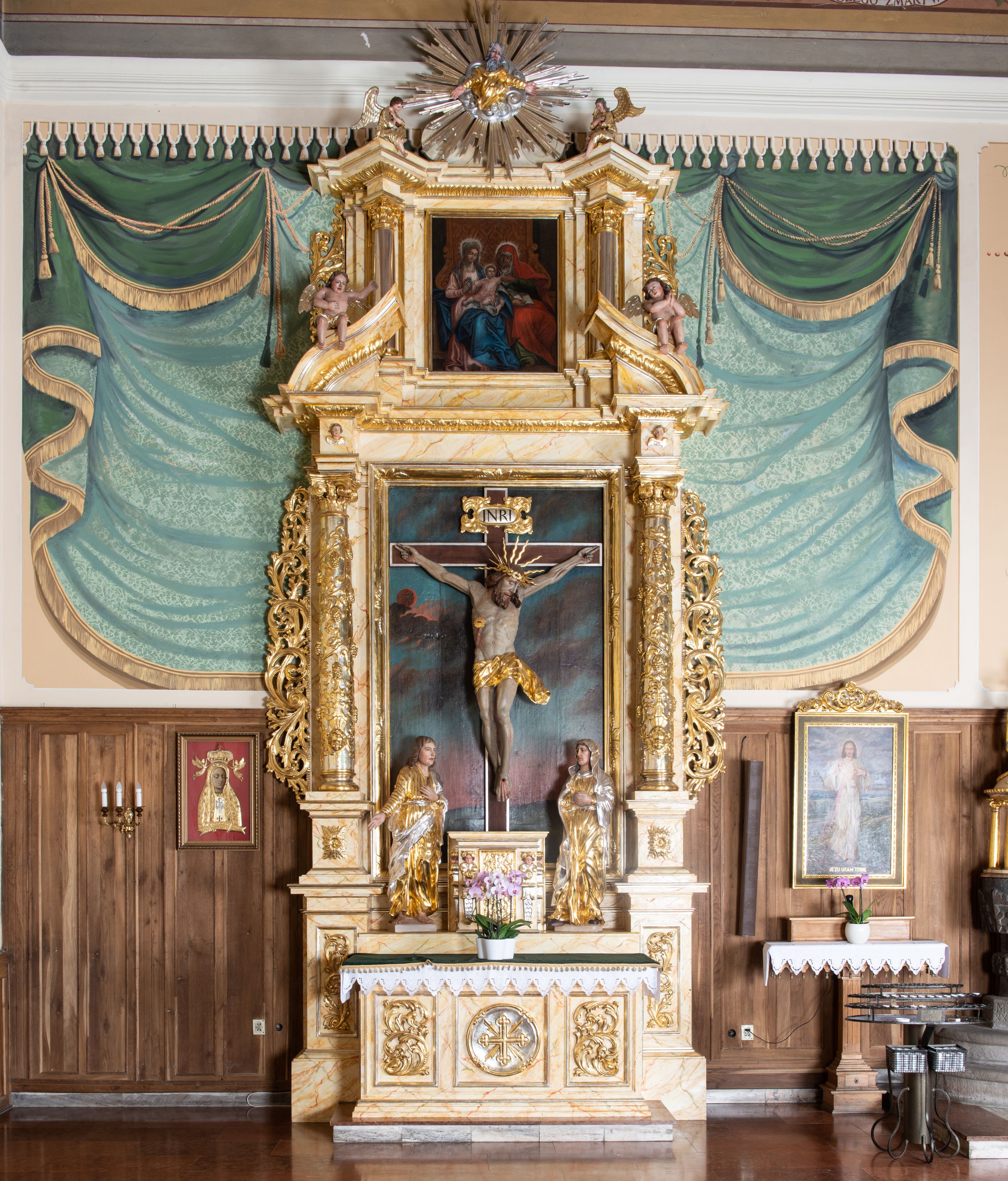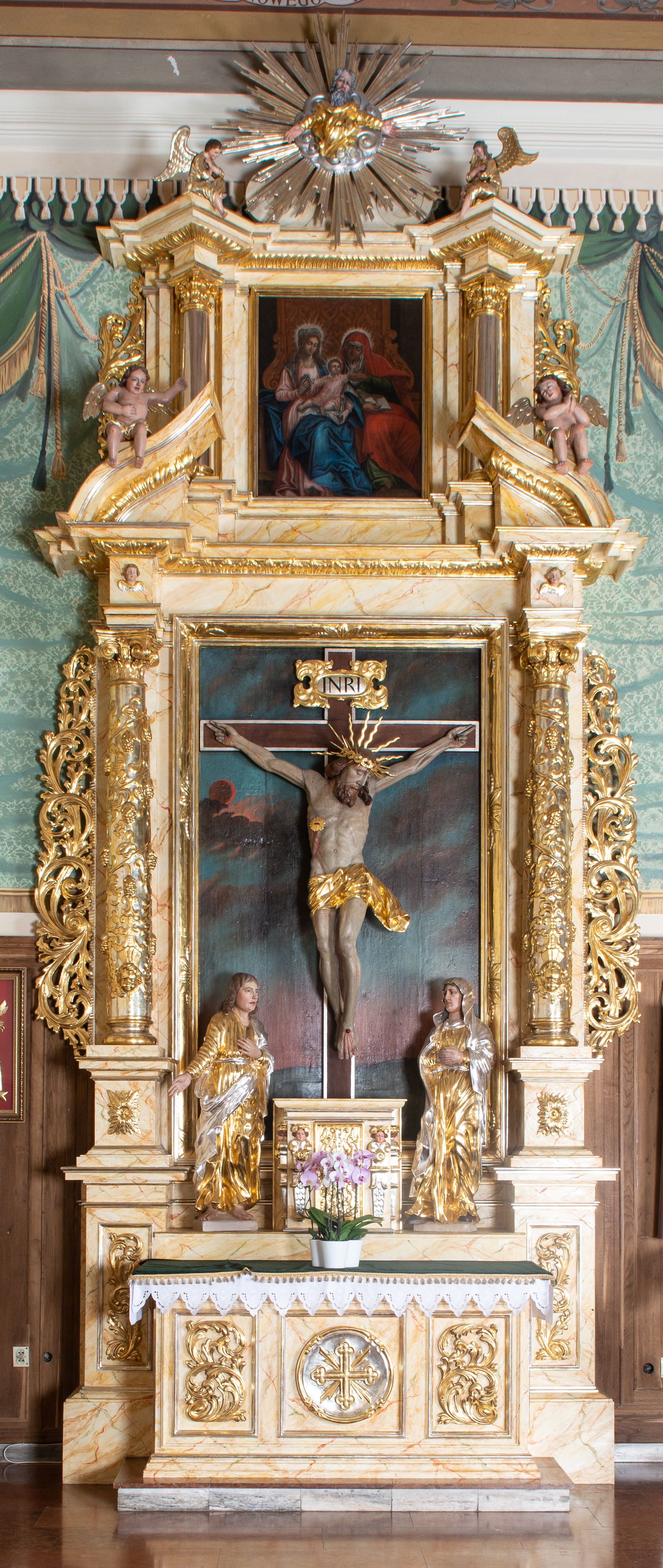 Ołtarz boczny został wykonany w drugiej połowie XVII wieku. W polu głównym znajduje się krucyfiks umieszczony na tle malowanej Golgoty, a po bokach rzeźby św. Jana Ewangelisty oraz Matki Boskiej Bolesnej. W drugiej kondygnacji ołtarza umieszczony jest obraz św. Anny Samotrzeć, a na szczycie późniejsza rzeźba Boga Ojca na tle promienistej glorii.