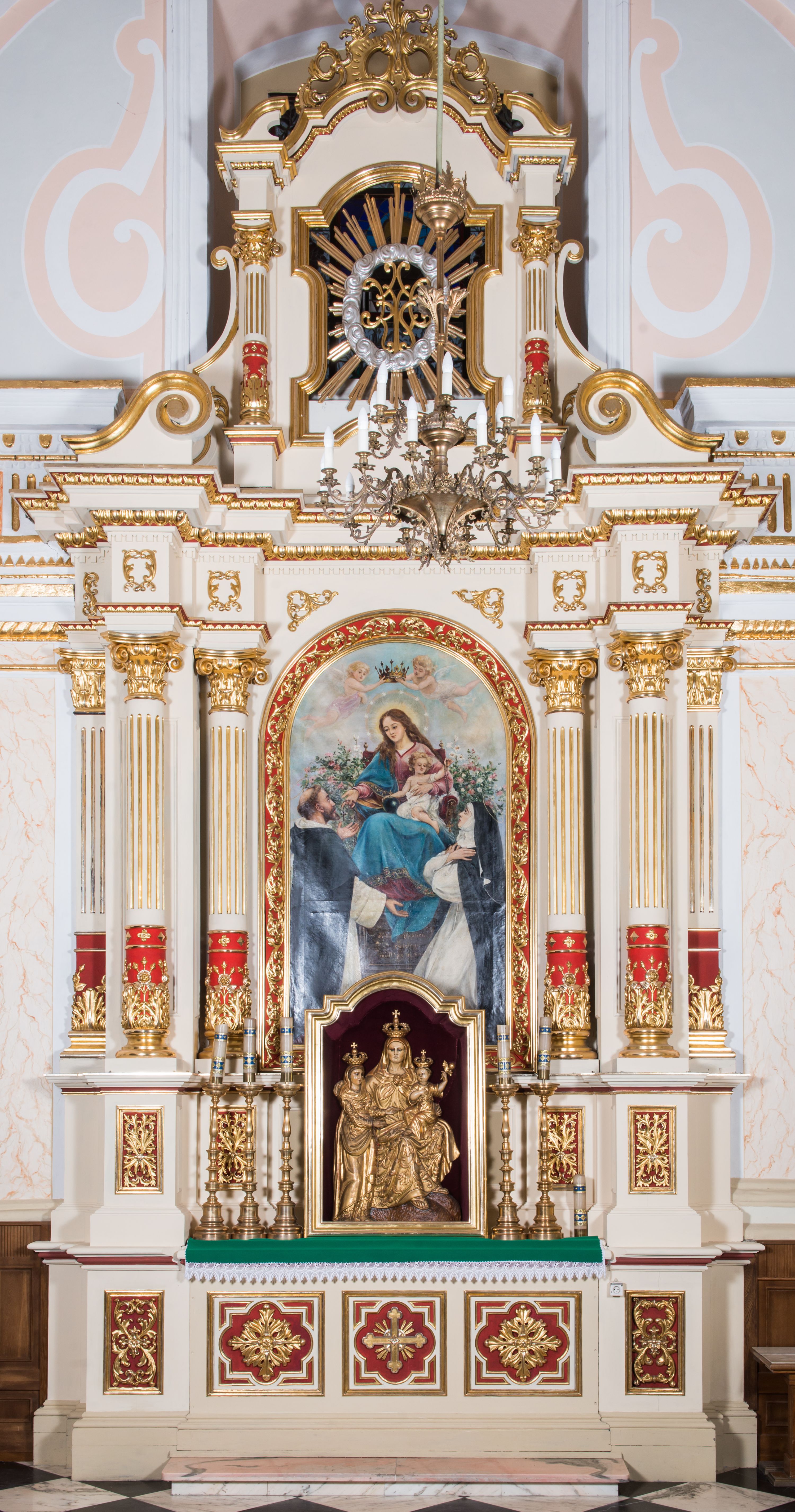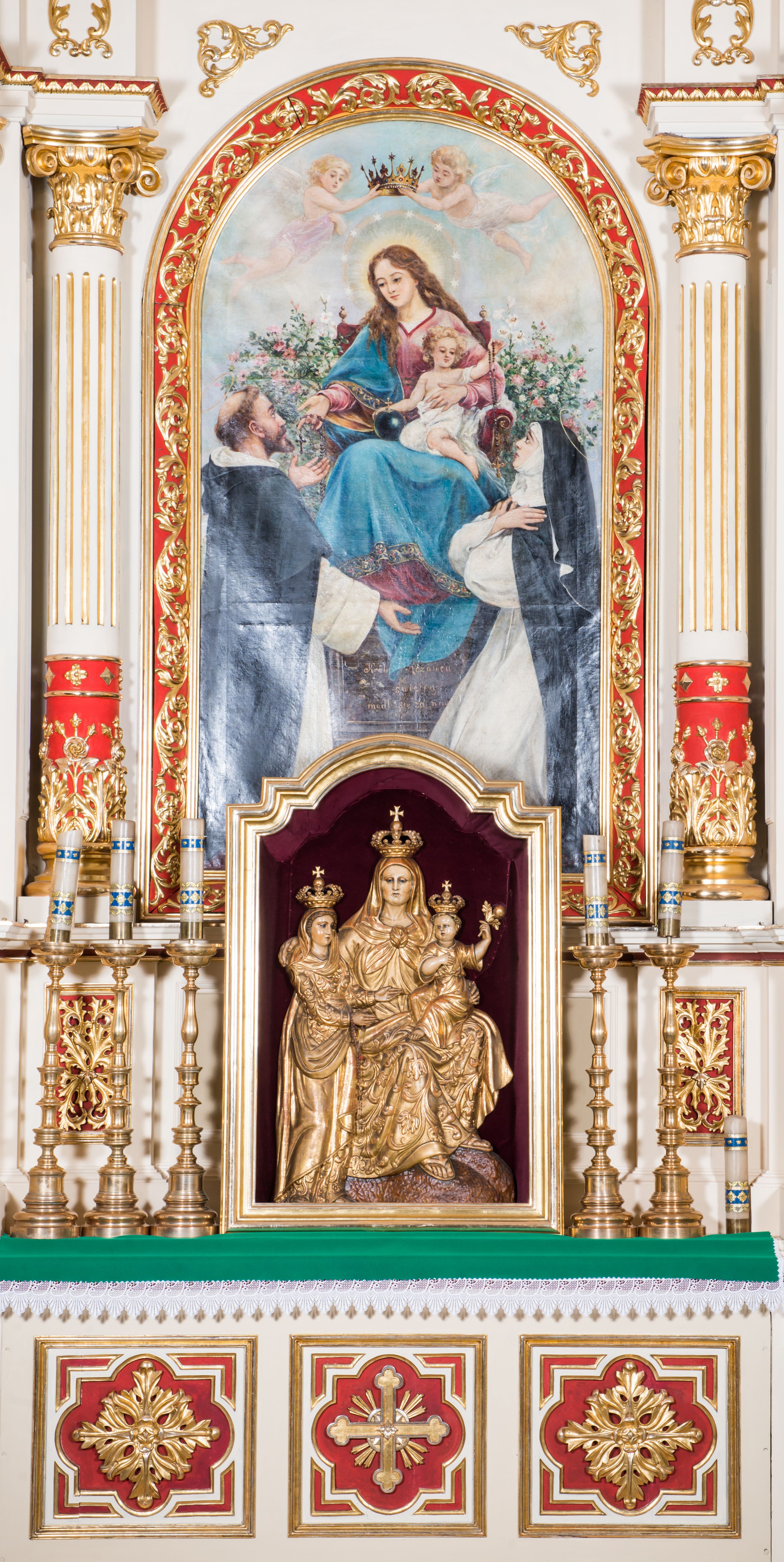 Ołtarz architektoniczny, jednokondygnacyjny, jednoosiowy, ze zwieńczeniem. Prostopadłościenny ołtarz, z antepedium artykułowanym 3 płycinami o dekoracyjnym wykroju, wtopiony jest z dolną partią, zryzalitowanego cokołu retabulum, której układ powtarza także górna partia cokołu. Część środkowa ujęta jest trzema parami kolumn korynckich, z których środkowe są wysunięte i ustawione na tle filarów. Podpory wspierają wyłamujące się ponad nimi, przerwane w partii architrawu i fryzu belkowanie. Druga kondygnacja jest w formie stojącego prostokąta ujętego parą ustawionych na cokołach kolumienek wspierających przerwane, wyłamujące się ponad nimi belkowanie. Dodatkowo ujmuje ją para spływów wolutowych oraz przerwany, wolutowy przyczółek. Zwieńczenie zamknięte jest parą stykających się wolut oraz ujęte przerwanym przyczółkiem wolutowym. Szczyt jest w formie ażurowej ornamentyki akantowo-rocaille’owej. W polu środkowym retabulum jest obraz w kształcie stojącego prostokąta zamkniętego półkoliście z przedstawieniem Matki Boskiej Różańcowej ze św. Dominikiem i św. Małgorzatą Alacoque. W polu zwieńczenia profilowana rama w kształcie prostokąta z uszakami w narożach, zamkniętego łukiem odcinkowym, z ażurowym monogramem maryjnym pośrodku, ujętym wieńcem obłoków i promienistą glorią. Retabulum zdobi stylizowana ornamentyka roślinna w postaci liści akantu i dziewięćsiłu w formie rozet w płycinach antepedium i górnej partii cokołu retabulum oraz we fryzie. Nasada trzonów kolumn ujęta liśćmi akantu i gałązkami róż. Gzyms belkowania zdobi motyw astragalu. Struktura ołtarza utrzymana jest odcieniu kremowym, detal architektoniczny i ornamentyka częściowo są polichromowane w kolorze czerwonym oraz złocone.