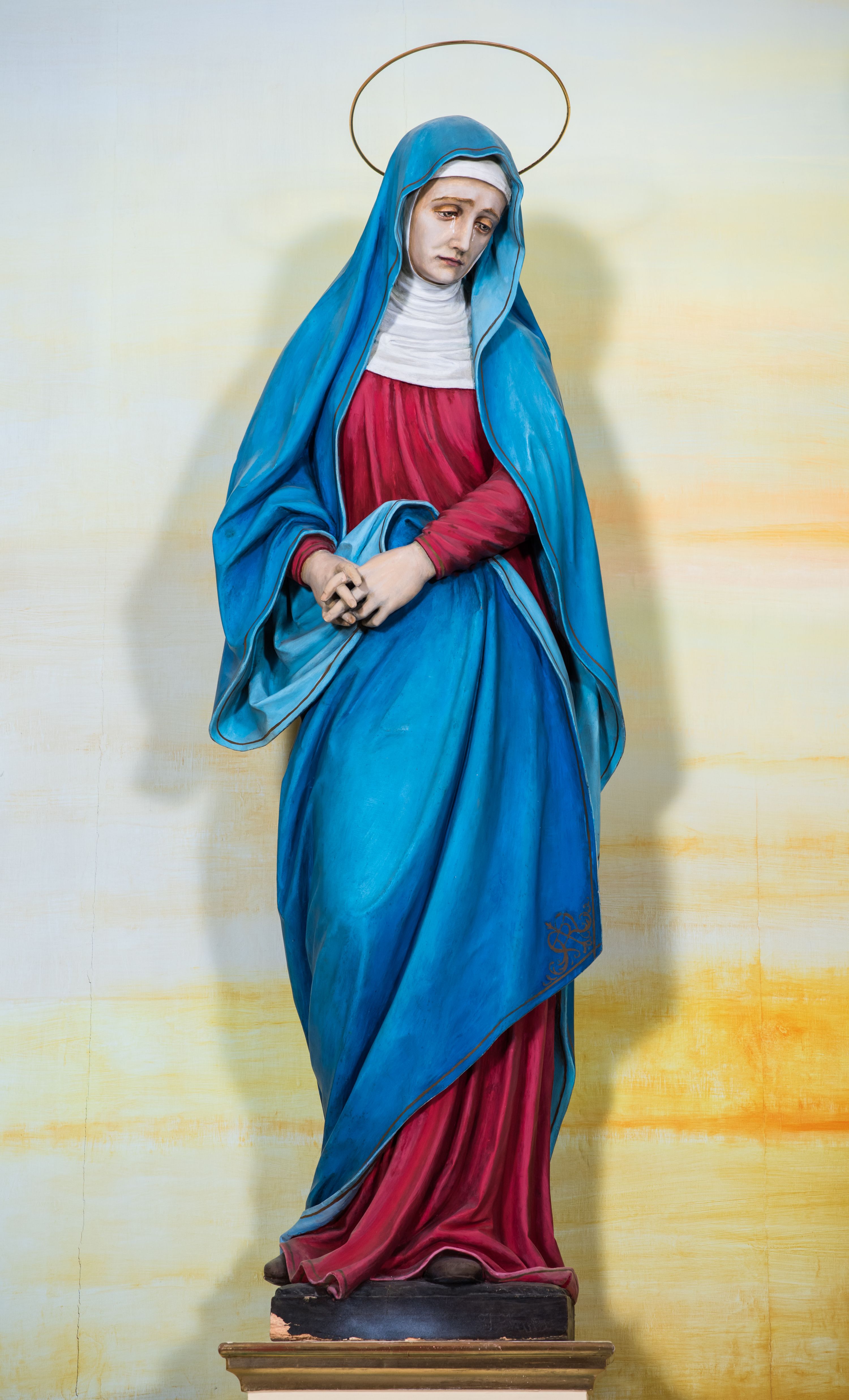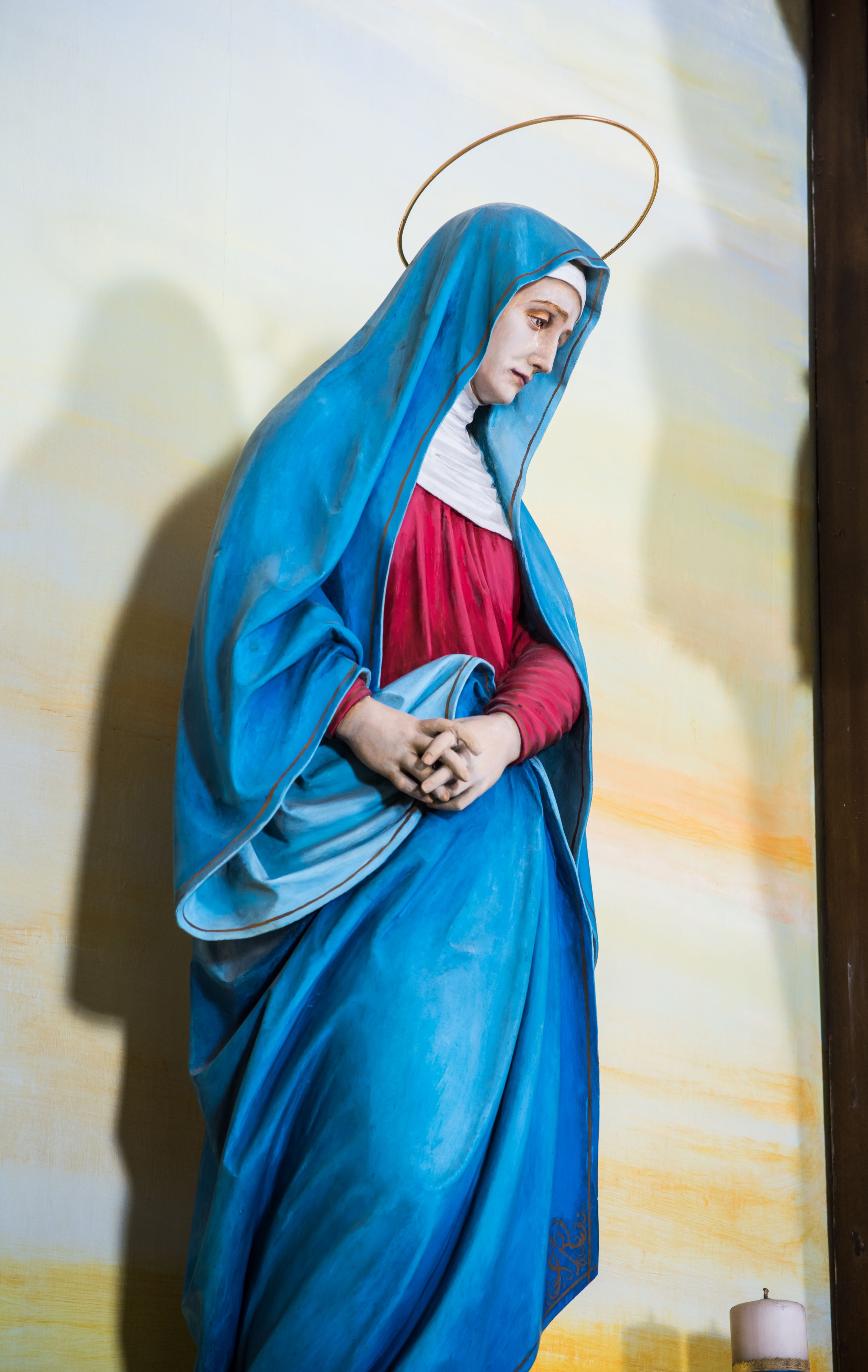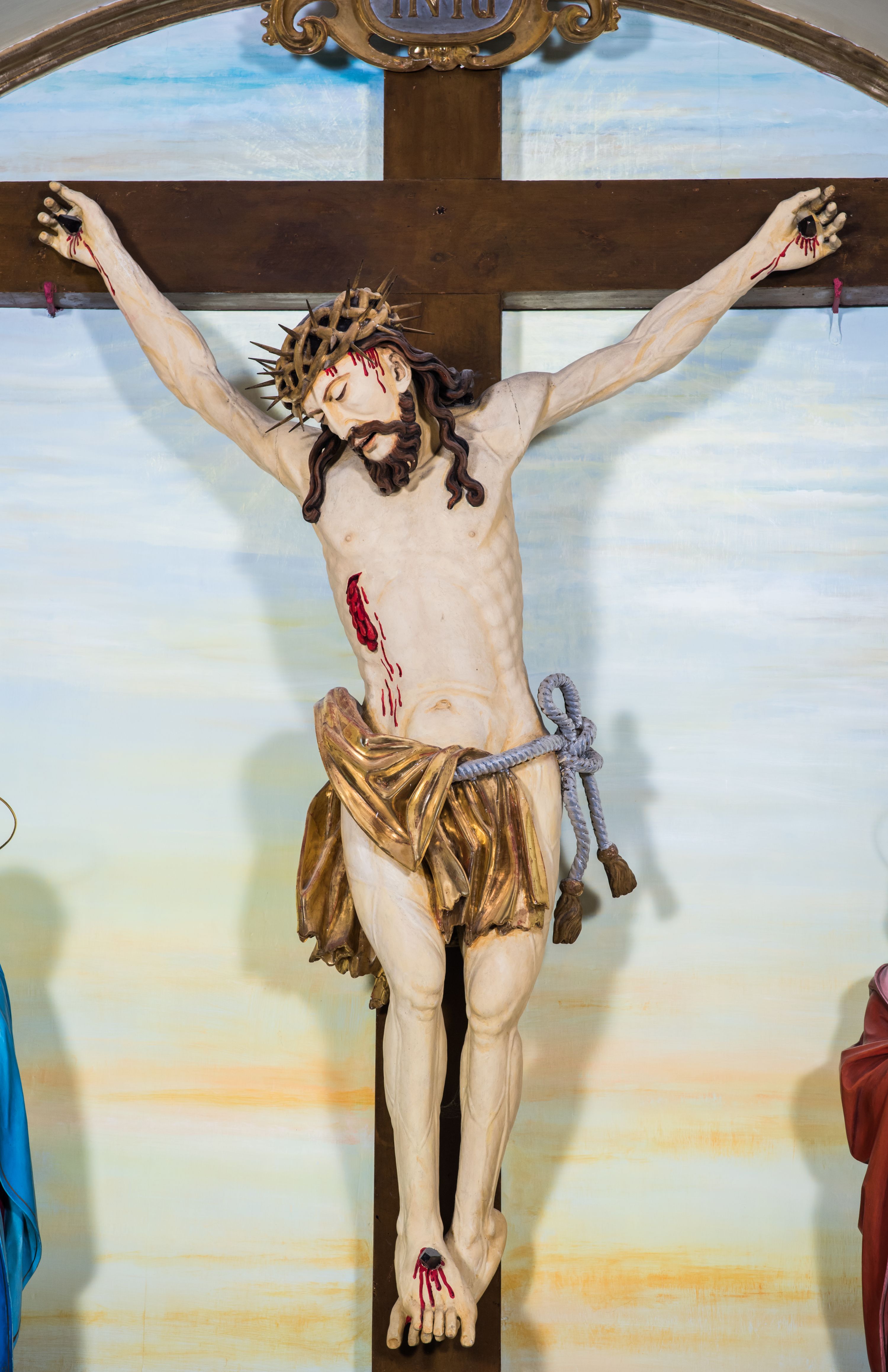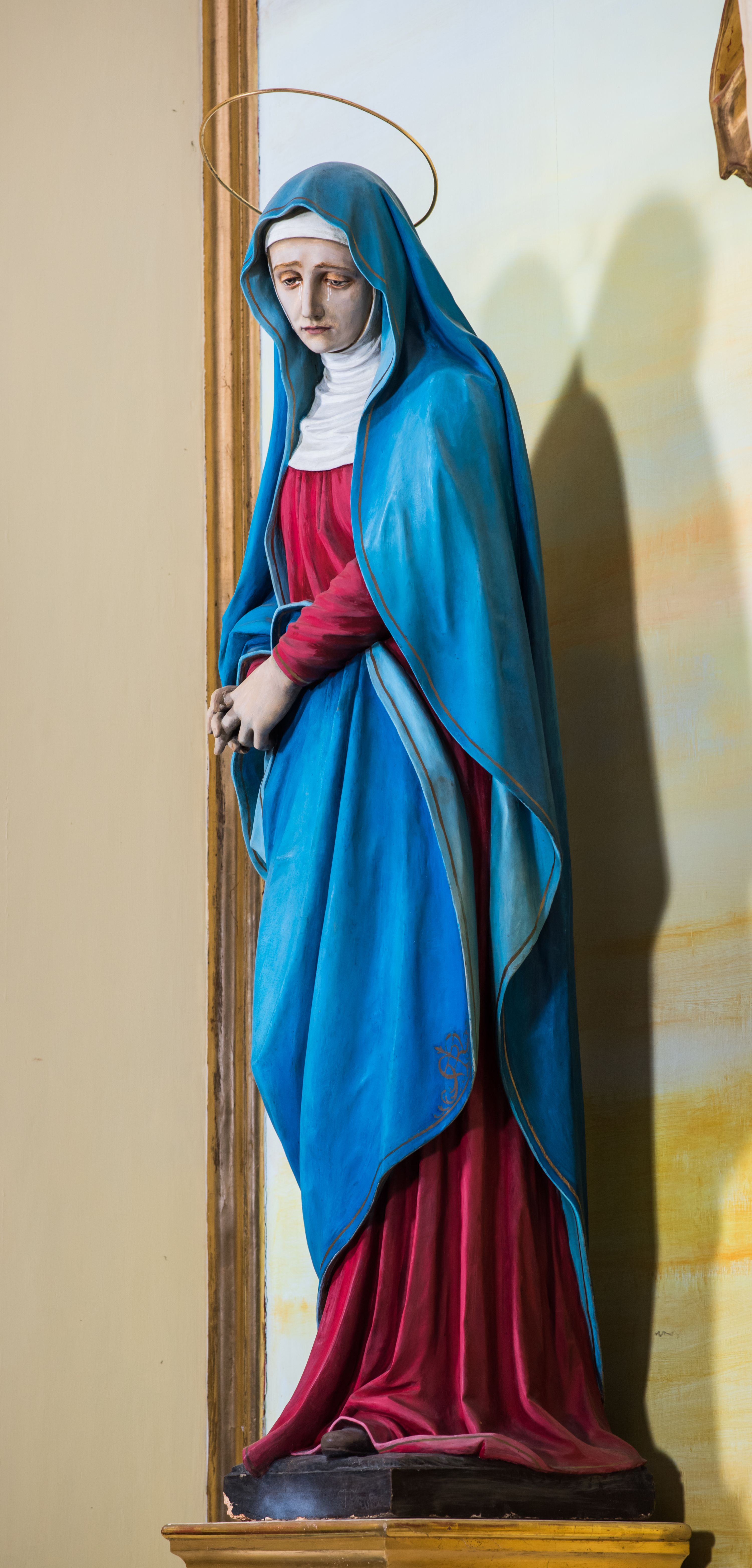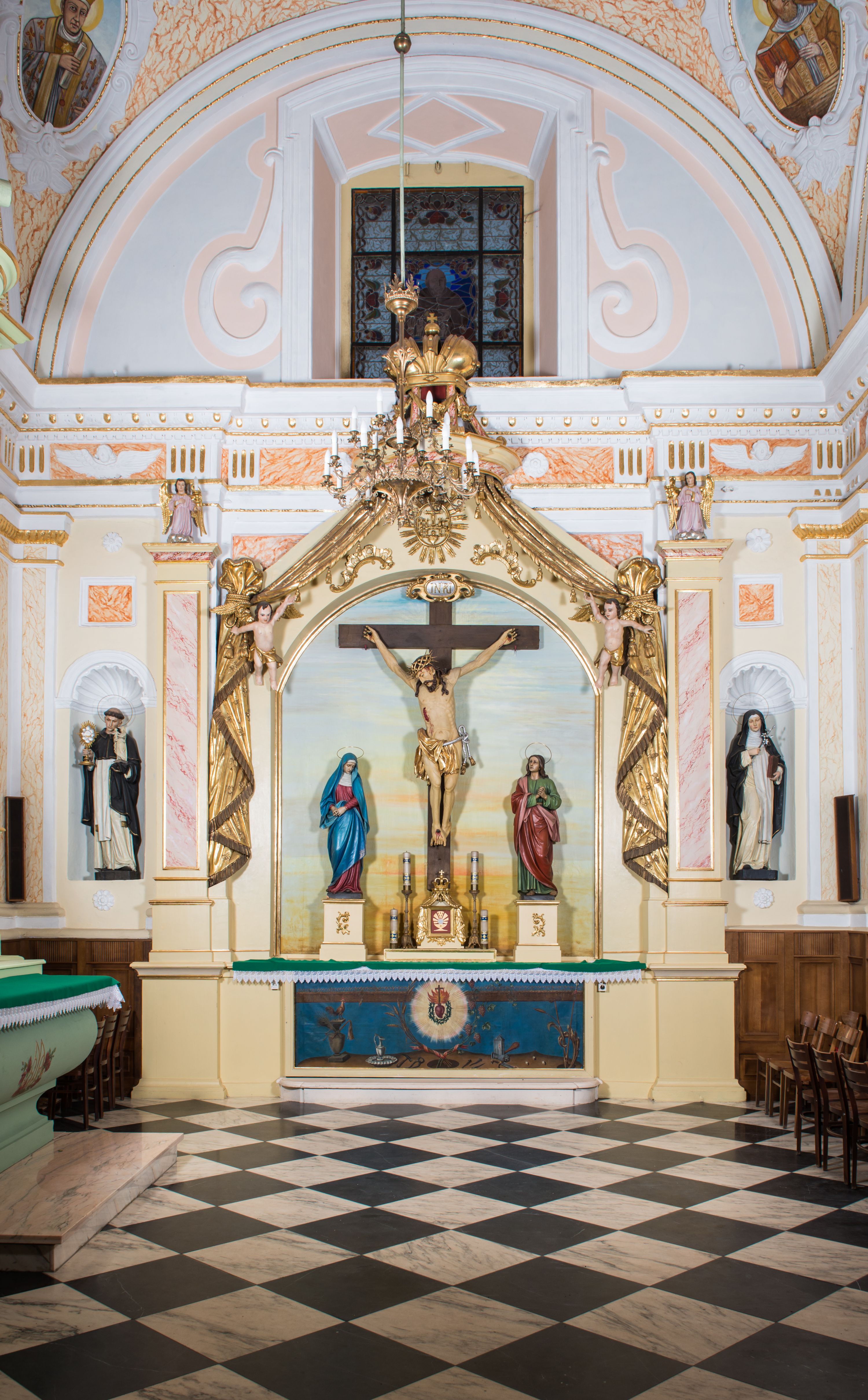 Struktura ołtarza jest utrzymana w odcieniu kremowym, partie detalu architektonicznego oraz ornamentyka są złocone i marmoryzowane w odcieniach brązu.