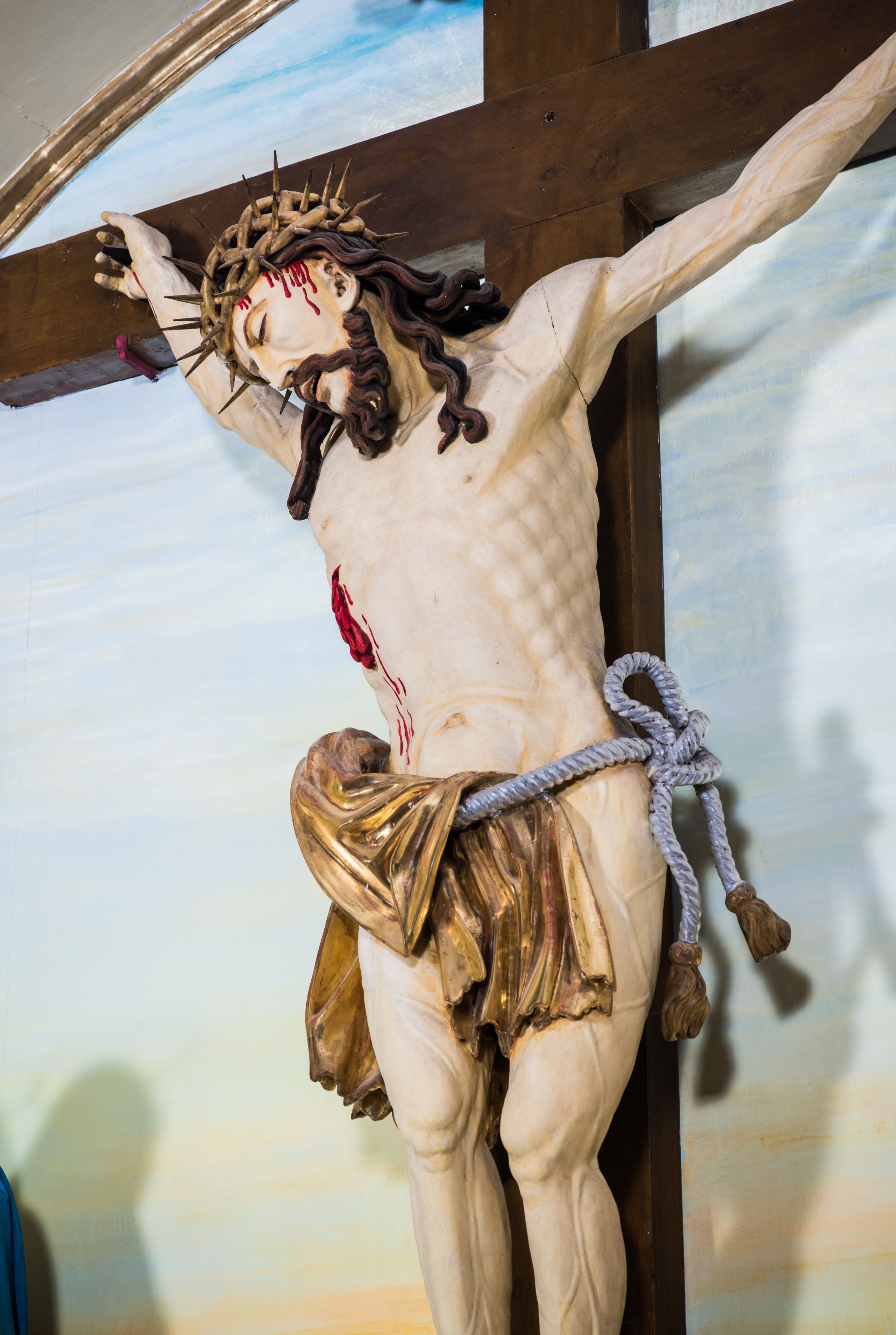 Przyścienny, architektoniczny ołtarz jednokondygnacyjny i jednoosiowy ze zwieńczeniem. Nastawa osadzona jest na cokole, w strukturze którego znajduje się prostopadłościenny ołtarz z drewnianą mensą i polichromowanym antepedium. Część środkowa retabulum, o kształcie zbliżonym do stojącego prostokąta zamkniętego trójkątnym szczytem, ujęta jest parą pilastrów osadzonych na cokołach. Zwieńczenie ołtarza przybiera formę ażurowej latarni na rzucie eliptycznym, ujętej dołem wyłamującym się gzymsem. Szczyt jest w kształcie zamkniętej, złoconej korony, wspartej na marmoryzowanych kolumienkach. Pod zwieńczenie ołtarza podwieszone jest złocone paludamentum podwiązane w górnych narożach części środkowej retabulum oraz podtrzymywane przez parę puttów i kaskadowo opadające wzdłuż pilastrów. Jego obrzeża zdobi frędzla oraz chwosty. Dodatkowo strukturę w górnej partii ołtarza zdobią: pośrodku motyw promienistej glorii z monogramem IHS z krzyżem i gorejącym sercem oraz motywy kogucich grzebieni po bokach. Pilastry zwieńczone są figurkami aniołów trzymających lichtarze, antepedium zdobi polichromowany motyw gorejącego serca Jezusa ujęty promienistą glorią oraz kłosami zbóż i gałązkami winnej latorośli, wraz z symbolami narzędzi męki Pańskiej (od lewej: kolumna biczowania i bicze, kogut, dzban z misą, młotek, obcęgi, gwoździe, lampa, rękawica, maczuga, miecz, kości do gry, trzciny, gąbka i włócznia). Pole środkowe, ujęte profilowaną, złoconą ramą, jest w kształcie leżącego prostokąta zamkniętego łukiem półkolistym. Zawiera rzeźbiarskie przedstawienie Ukrzyżowania z krucyfiksem ujętym po bokach parą figur asystencyjnych – Matki Boskiej i św. Jana Ewangelisty, ustawionych na cokołach.