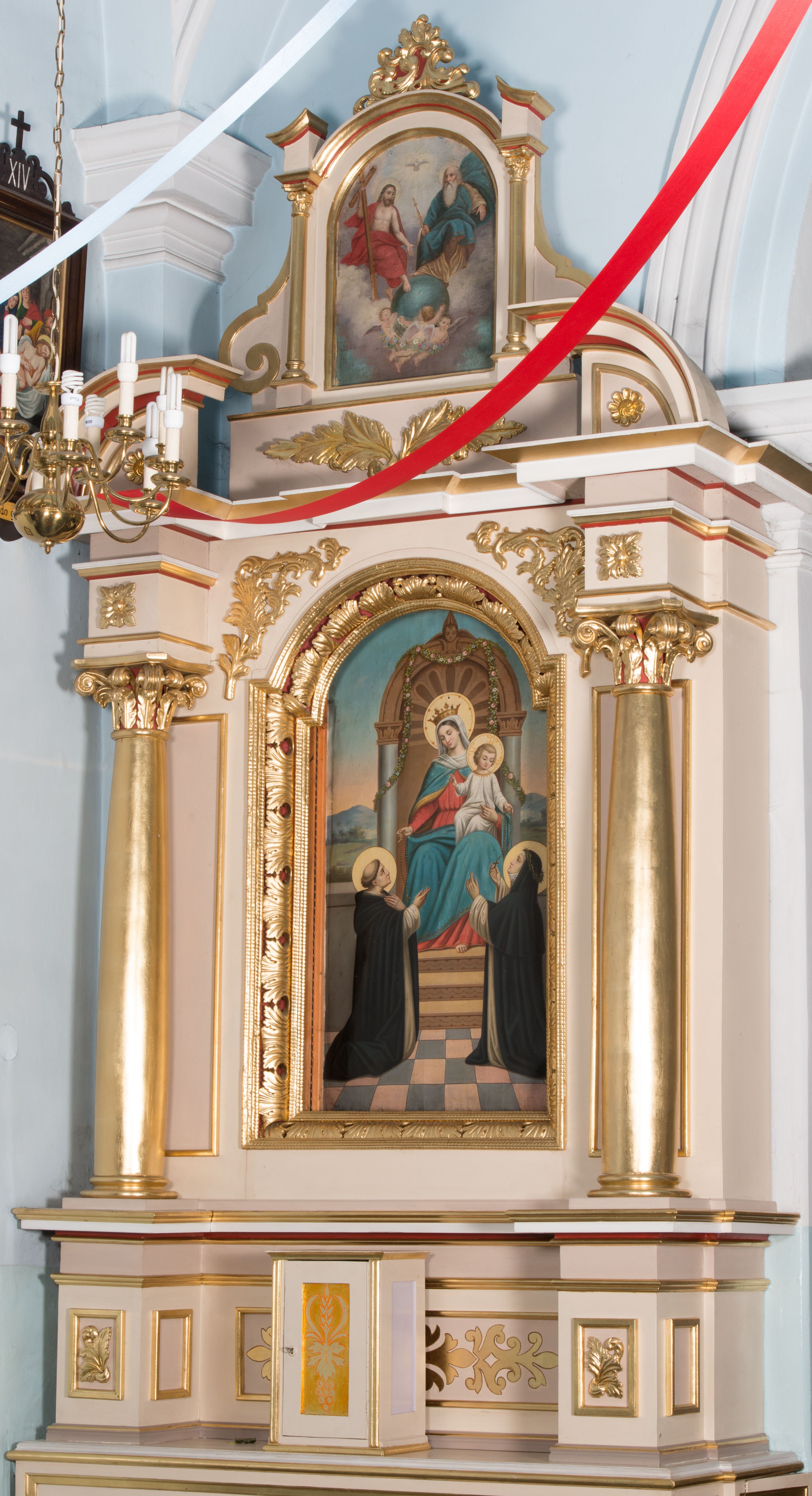 Nastawa ołtarzowa architektoniczna, jednoosiowa, jednokondygnacyjna ze zwieńczeniem. Ołtarz prostopadłościenny, drewniany; mensa drewniana. Antepedium w kształcie leżącego prostokąta ujętego profilowaną ramą; w polu płycina z malowaną i złoconą dekoracją roślinną. Tabernakulum w formie prostopadłościennej skrzynki. Drzwiczki o kształcie stojącego prostokąta z płyciną dekorowaną malowanym i złoconym przedstawieniem kiści i liścia winnego grona oraz symetrycznego kłosa. Predella dekorowana płyciną z malowaną i złoconą dekoracją stylizowanego akantu. Nastawa ołtarzowa ustawiona na wysokim cokole, ujęta parą kolumn o kapitelach kompozytowych i wybrzuszonych trzonach. Cokoły zdobione są prostokątnymi płycinami, z przodu wypełnione płaskorzeźbionym liściem. Podpory dźwigają niepełne belkowanie składające się z fryzu i silnie wysuniętego gzymsu, wyłamanego nad polem głównym i przerwany półkolisty przyczółek. W polu znajduje się ozdobna rama w kształcie stojącego prostokąta, zamkniętego łukiem nadwieszonym z obrazem Matki Boskiej Różańcowej ze świętymi dominikańskimi. Zwieńczenie w kształcie stojącego prostokąta, zamknięte łukiem półkolistym, ustawione na wysokim cokole, ujęte parą kolumn o kapitelach kompozytowych podtrzymujących przerwany przyczółek; po bokach flankowane spływami wolutowymi. U szczytu akroterion w formie neorokokowej dekoracji roślinnej. W polu obraz Trójcy Świętej w ramie powtarzającej kształt zwieńczenia. Struktura w całości polichromowana w kolorze jasnobeżowym; kolumny, ornamentyka i profile złocone.