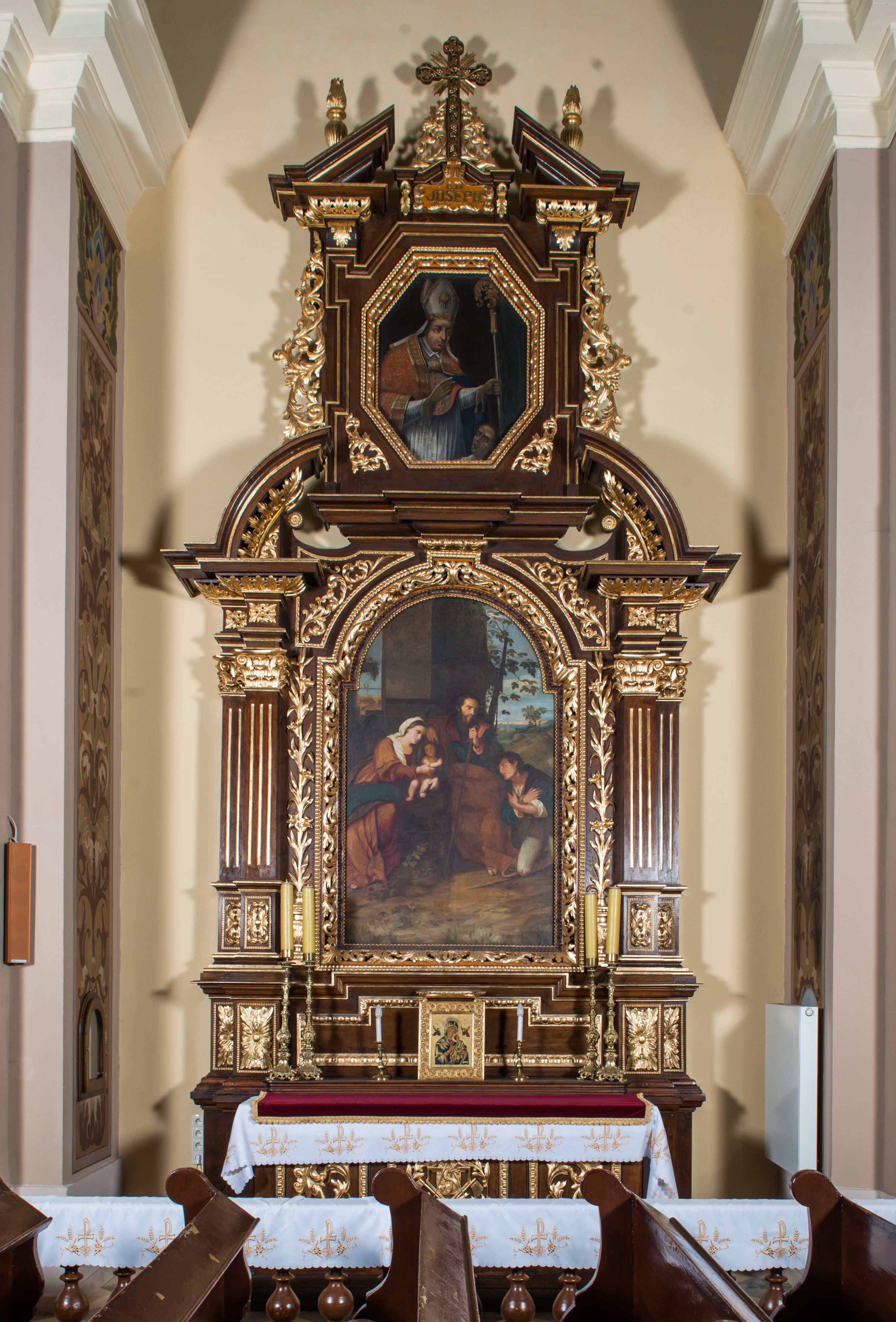 Ołtarz architektoniczny, jednokondygnacyjny, jednoosiowy, ze zwieńczeniem. Ołtarz prostopadłościenny z drewnianą mensą i drewnianym antepedium artykułowanym trzema prostokątnymi płycinami. Retabulum osadzone na nieznacznie zryzalitowanym cokole, lekko wstępującym pośrodku w kolejną partię retabulum. Część środkową ołtarza ujmuje para filarów o czworobocznym przekroju, ustawionych na tle pilastrów, osadzonych na wysokich cokołach i podtrzymujących przerwane belkowanie ze wspartym na nim przerwanym, półkolistym przyczółkiem. Część środkowa belkowania jest wyniesiona nieco wyżej. Pole części środkowej retabulum ma kształt stojącego prostokąta zamkniętego półkolistym łukiem nadwieszonym. Osadzone na wyłamującym się pośrodku gzymsie zwieńczenie ma postać stojącego prostokąta wypełnionego płyciną z uszakami w narożach, zamkniętą trójbocznie z ośmioboku. Pole środkowe w formie wydłużonego ośmioboku. Zwieńczenie domyka szczyt z formie przerwanego, trójkątnego przyczółka usytuowanego na przerwanym belkowaniu. Środkową płycinę antepedium zdobi płaskorzeźbiony monogram SJ na tle narzędzi ciesielskich (?), boczne ornamentyka roślinna. W partiach cokołu retabulum, cokołów filarów, fryzu oraz górnych naroży części środkowej nastawy są motywy stylizowanej dekoracji roślinnej. Obramienie obrazu głównego ujmuje para wazonów z kwiatami lilii, natomiast boki zwieńczenia ołtarza para ażurowych, akantowych uszaków. W szczycie, po bokach, na przerwanym przyczółku jest para płonących wazonów, pośrodku natomiast kartusz z napisem: „ITE AD JOSEPH” oraz krzyż zdobiony wicią winnej latorośli. W polu części środkowej znajduje się przedstawienie „Pokłonu pasterzy”, w zwieńczeniu natomiast wizerunek św. Stanisława biskupa. Struktura retabulum utrzymana jest w kolorystyce pokostowanego drewna, partie detalu architektonicznego i ornamentyka są złocone. Na mensie napis „MEMENTO - FUNDATORIS / JOSEPHI".