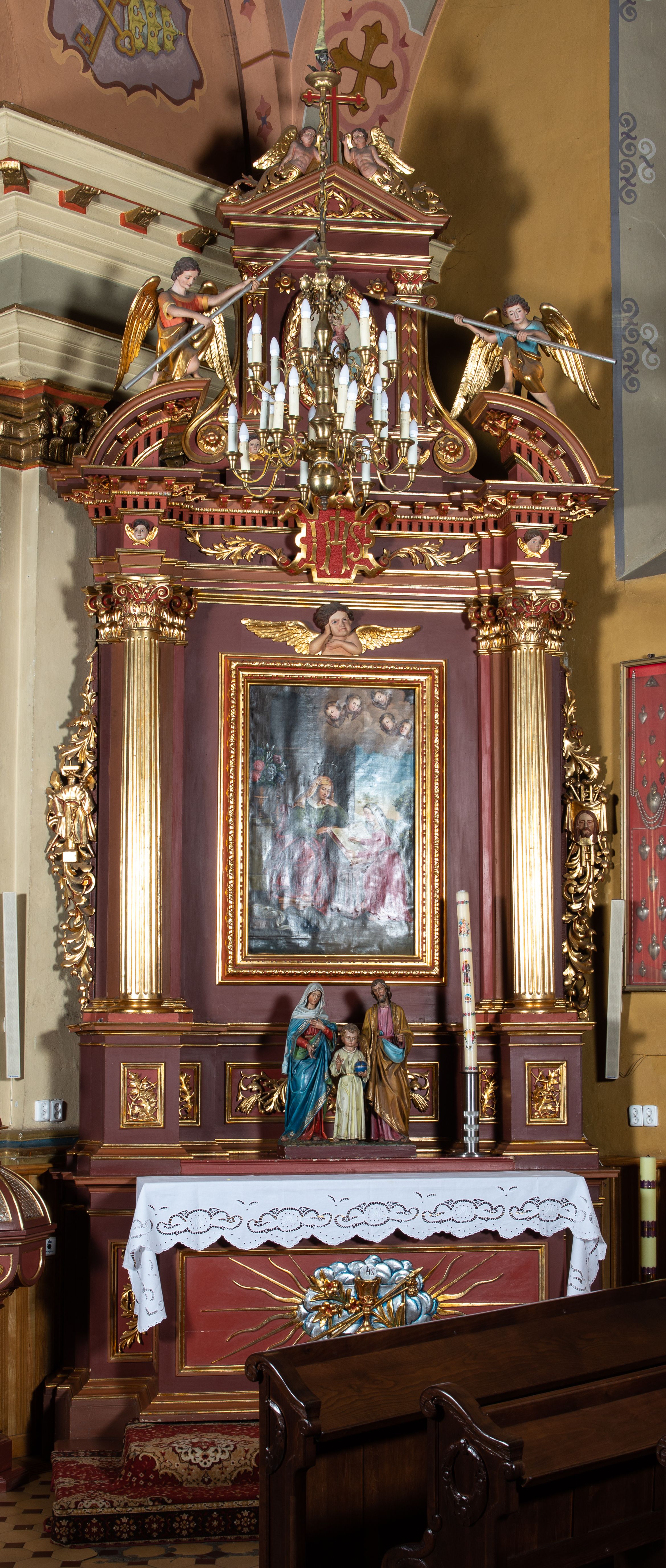Ołtarz architektoniczny, jednoosiowy, jednokondygnacyjny ze zwieńczeniem. Retabulum osadzone jest na wysokim, zdwojonym, zryzalitowanym uskokowo cokole. Ołtarz jest prostopadłościenny z drewnianą mensą. Część środkową ujmuje para kolumn o żłobkowanych trzonach i korynckich kapitelach, ustawionych na tle zdwojonych pilastrów. Podpory dźwigają wyłamujące się ponad nimi belkowanie o silnie wysuniętym gzymsie. Zwieńczenie ma formę aediculi ujętej parą pilastrów i spływów wolutowych, zamkniętej trójkątnym przyczółkiem. Dodatkowo ujęta jest ona przerwanym, półkolistym przyczółkiem. Płycina antepedium jest w kształcie leżącego prostokąta z płaskorzeźbionym motywem złoconego kielicha eucharystycznego oraz kwiatów lilii skrzyżowanych z włócznią oraz trzciną z gąbką na tle srebrzonych obłoków ujętych promienistą glorią. Płyciny górnego cokołu (predelli) zdobi motyw ostów i cierni. Część środkową ujmuje para ażurowych, akantowych uszaków z motywem tuniki, kolumny biczowania oraz trzciny po lewej stronie i chusty św. Weroniki, drabiny, włóczni i trzciny z gąbką po prawej. U góry, pośrodku znajduje się uskrzydlona główka anielska. Powyżej, w partii belkowania, którego gzyms zdobi kostkowanie, jest umieszczony kartusz herbowy z monogramem IHS. Fryz zdobi stylizowana wić roślinna oraz para uskrzydlonych główek anielskich, natomiast zwieńczenie retabulum m.in. motywy roślinne, rozetki i kampanulle. Szczyt tworzy podtrzymująca krzyż para aniołów o sylwetkach od pasa w dół w formie liści akantu. Na przerwanym przyczółku znajduje się para przyklękających aniołów, ubranych w suknie w kolorach jasnoczerwonym i niebieskim oraz złocone płaszcze, trzymających w dłoniach włócznię i trzcinę z gąbką. Pole w części środkowej ma kształt stojącego prostokąta ujętego profilowaną, złoconą ramą. W środku znajduje się przedstawienie św. Anny nauczającej małą Marię. Pole w zwieńczeniu ma kształt stojącego owalu ujętego złoconą ramą w formie wieńca laurowego. Zawiera wizerunek św. Józefa.