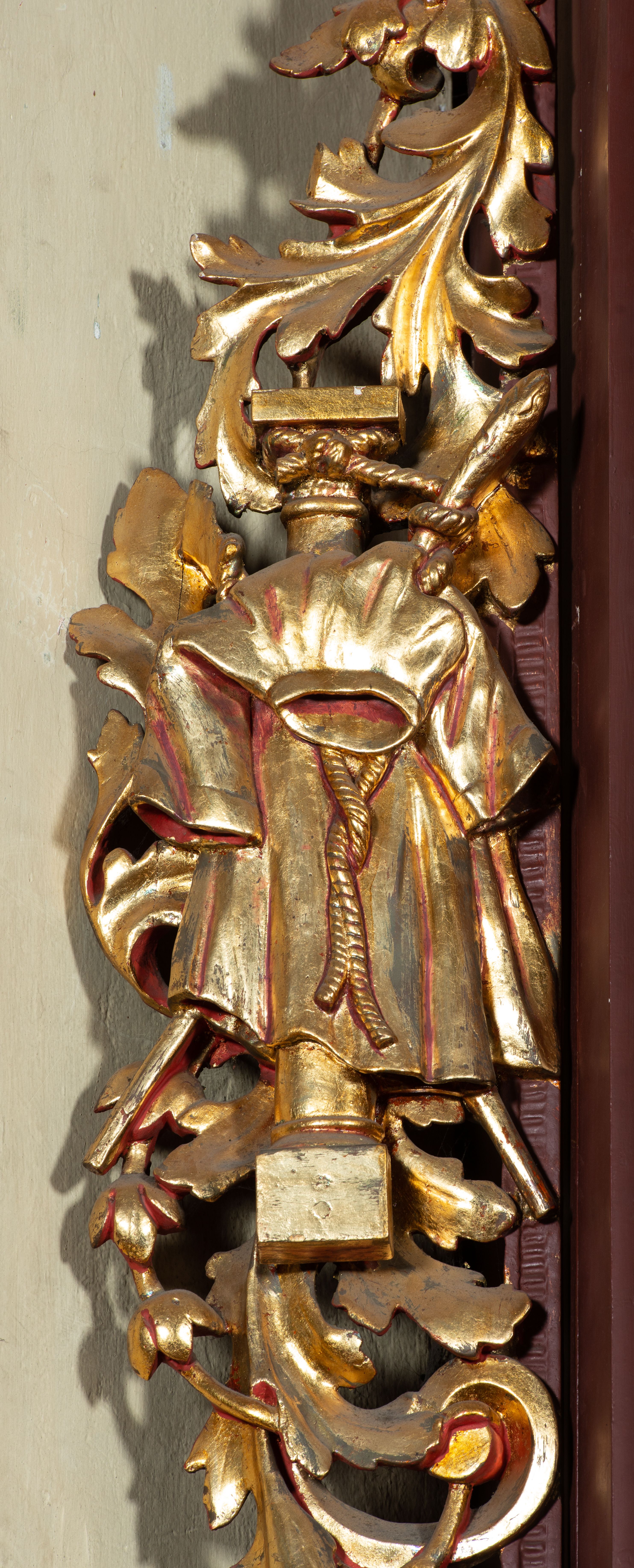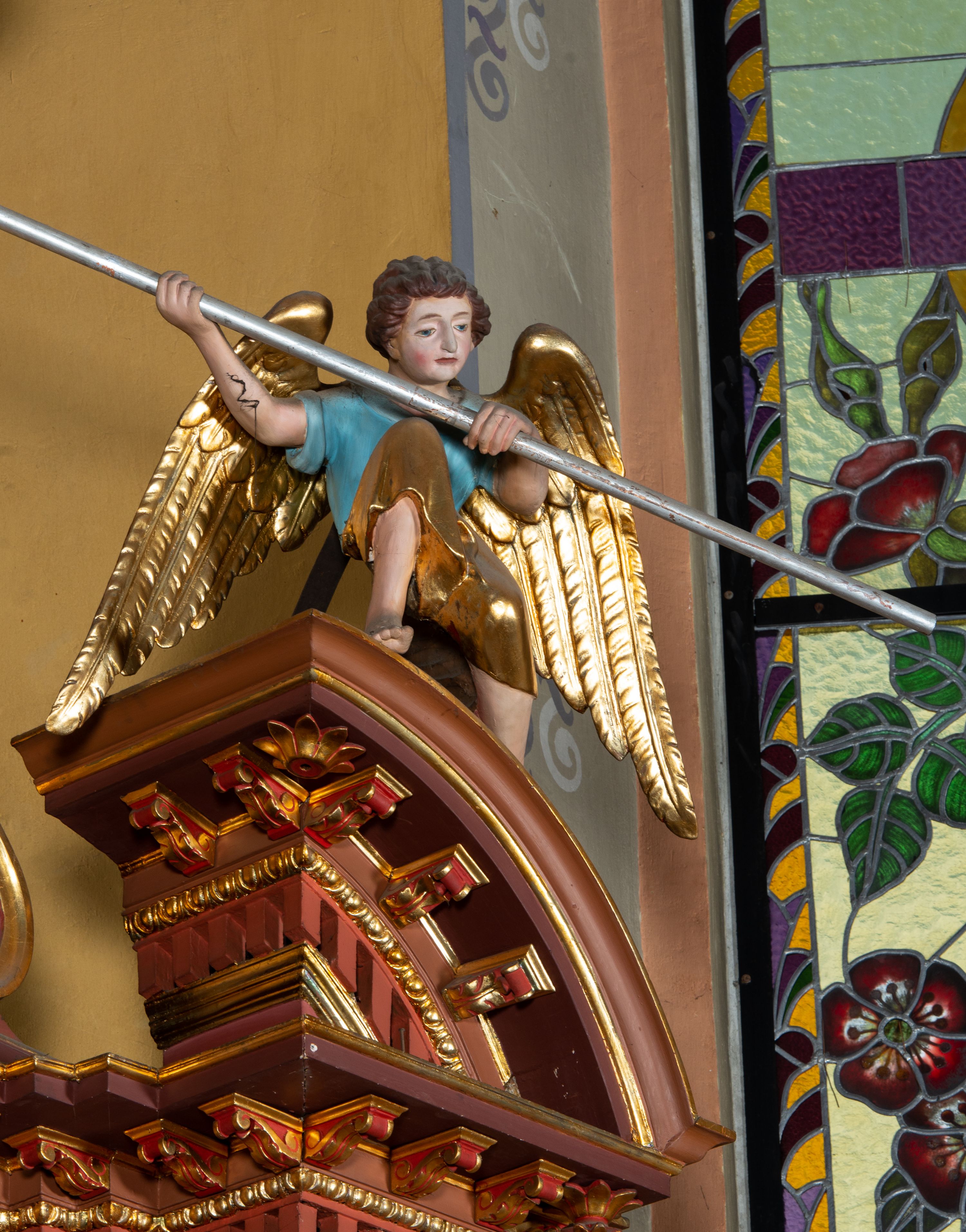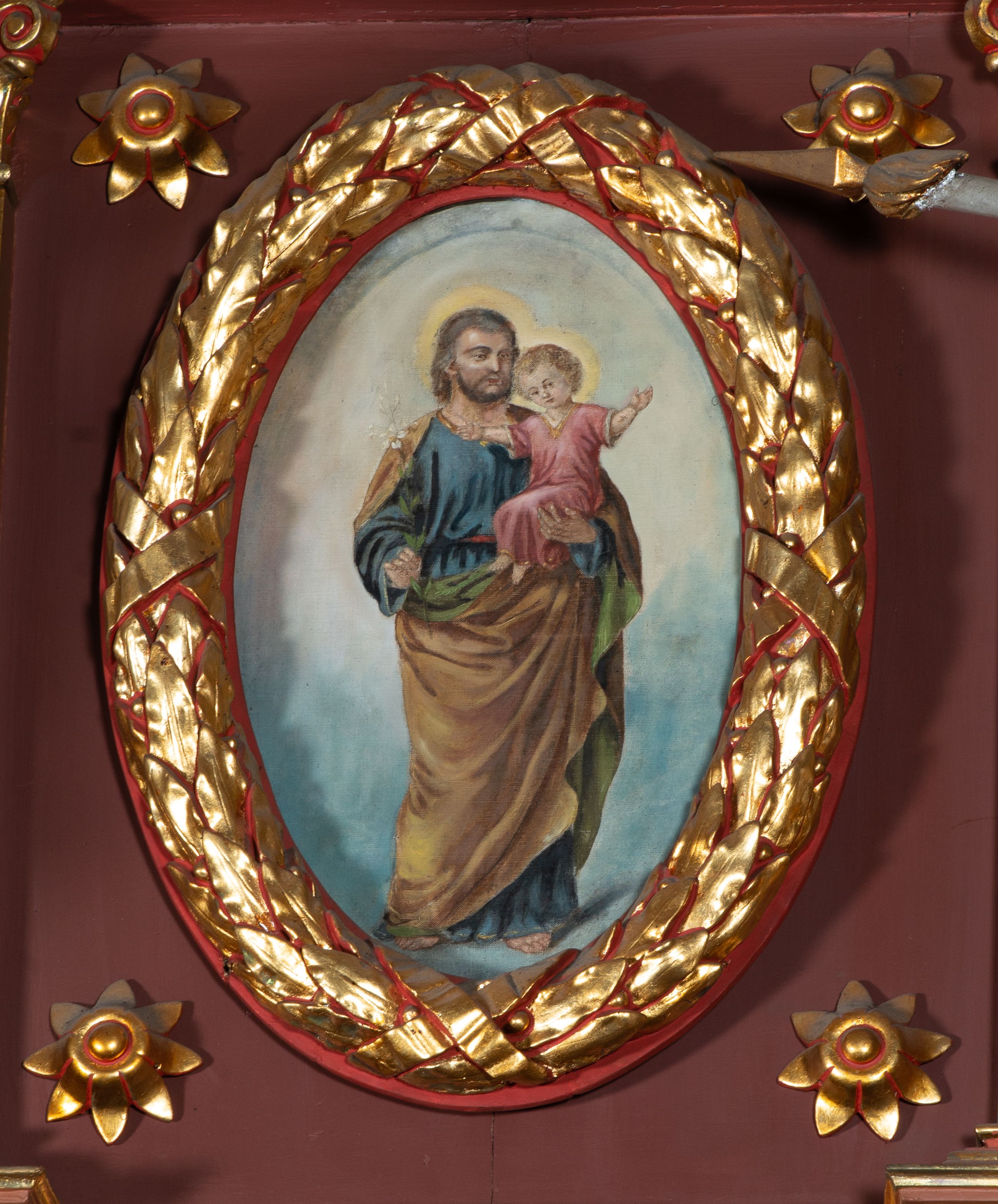 Struktura retabulum utrzymana jest w odcieniach brązu, partie detalu architektonicznego i ornamentyka są złocone.