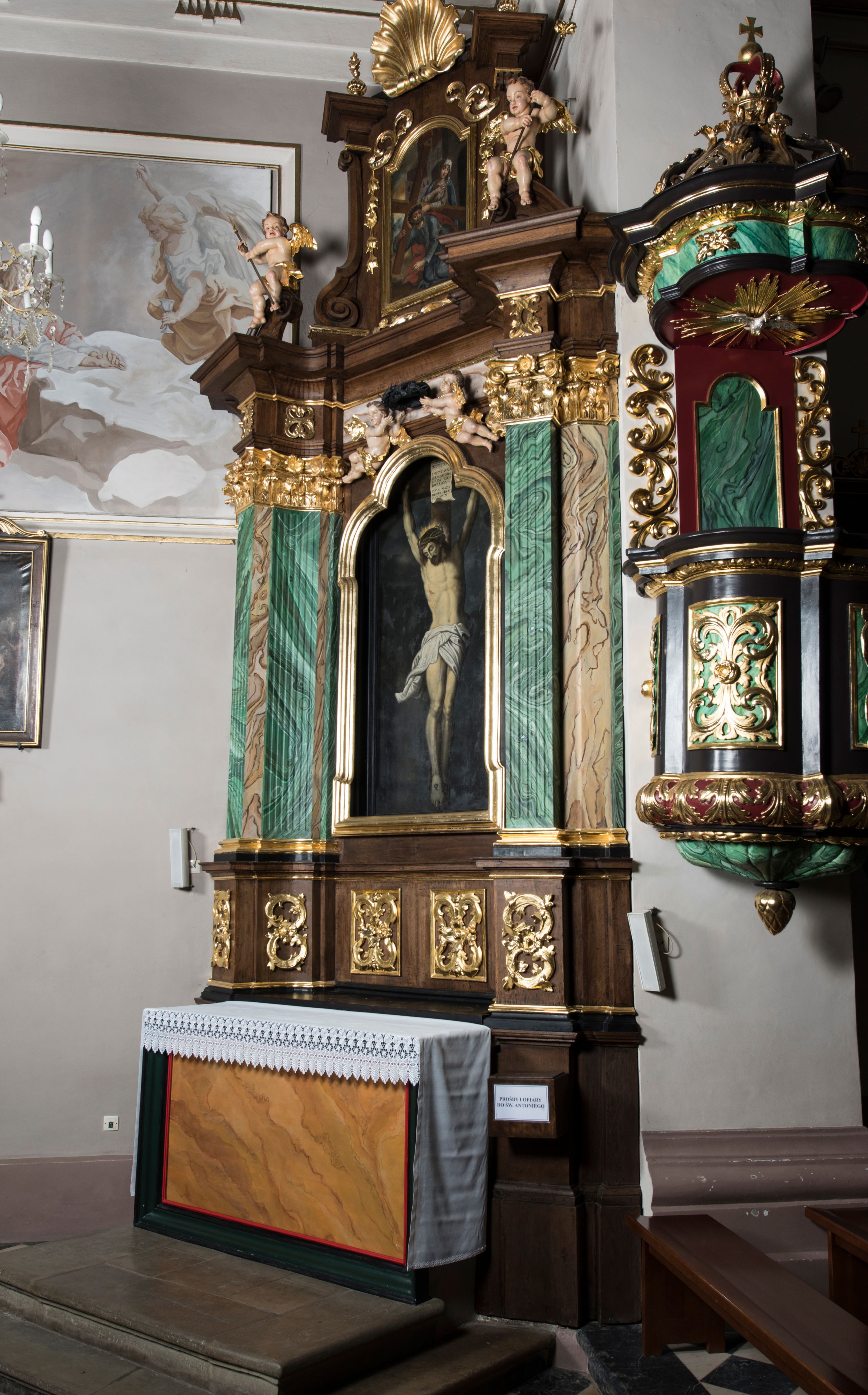 Ołtarz boczny, ustawiony w północno-wschodnim narożu korpus, jest architektoniczny, jednokondygnacyjny, jednoosiowy ze zwieńczeniem. Sam ołtarz z prostą mensą jest prostopadłościenny. Retabulum zostało zbudowane na zdwojonym cokole, ustawionym ukośnie, z filarami opiętymi z trzech stron pilastrami kompozytowymi podtrzymującymi belkowanie o znacznie wysuniętym gzymsie. Zwieńczenie jest w kształcie stojącego prostokąta ujętego ukośnie dostawionymi spływami wolutowymi dźwigającymi odcinki belkowania z silnie wyłamanym ku przodowi gzymsem z muszlą palmetową pośrodku. Na cokołach i w partii fryzu znajdują się wstęgi ornamentu regencyjnego z listkami i rozetami, a w zwieńczeniu kampanule podwieszone pod listkami akantu. W części środkowej wnęka ujęta w profilowaną ramę, prostokątną, z uszkami u dołu, zakończoną trójliściem, w której jest umieszczony obraz Chrystusa na krzyżu (na zasuwie obraz św. Antoniego Padewskiego); nad ramą para uskrzydlonych aniołków podtrzymujących koronę cierniową. Na belkowaniu siedzą uskrzydlone aniołki, przepasane opaską na biodrach, z narzędziami Męki Pańskiej w rękach. W zwieńczeniu o formie prostokąta zamkniętego łukiem półkolistym, nadwieszonym, w profilowanej ramie, znajduje się obraz ukazujący scenę z drogi krzyżowej – klęczącego Chrystusa pod krzyżem z Marią. Ołtarz polichromowany na ciemny brąz, z filarami i pilastrami imitującymi marmoryzację, ze złoconymi ornamentami i profilami; figury aniołów z naturalną karnacją, ze złoconymi skrzydłami. Polichromia ołtarza w tonacji brązowej i zielonej ze złoceniami.