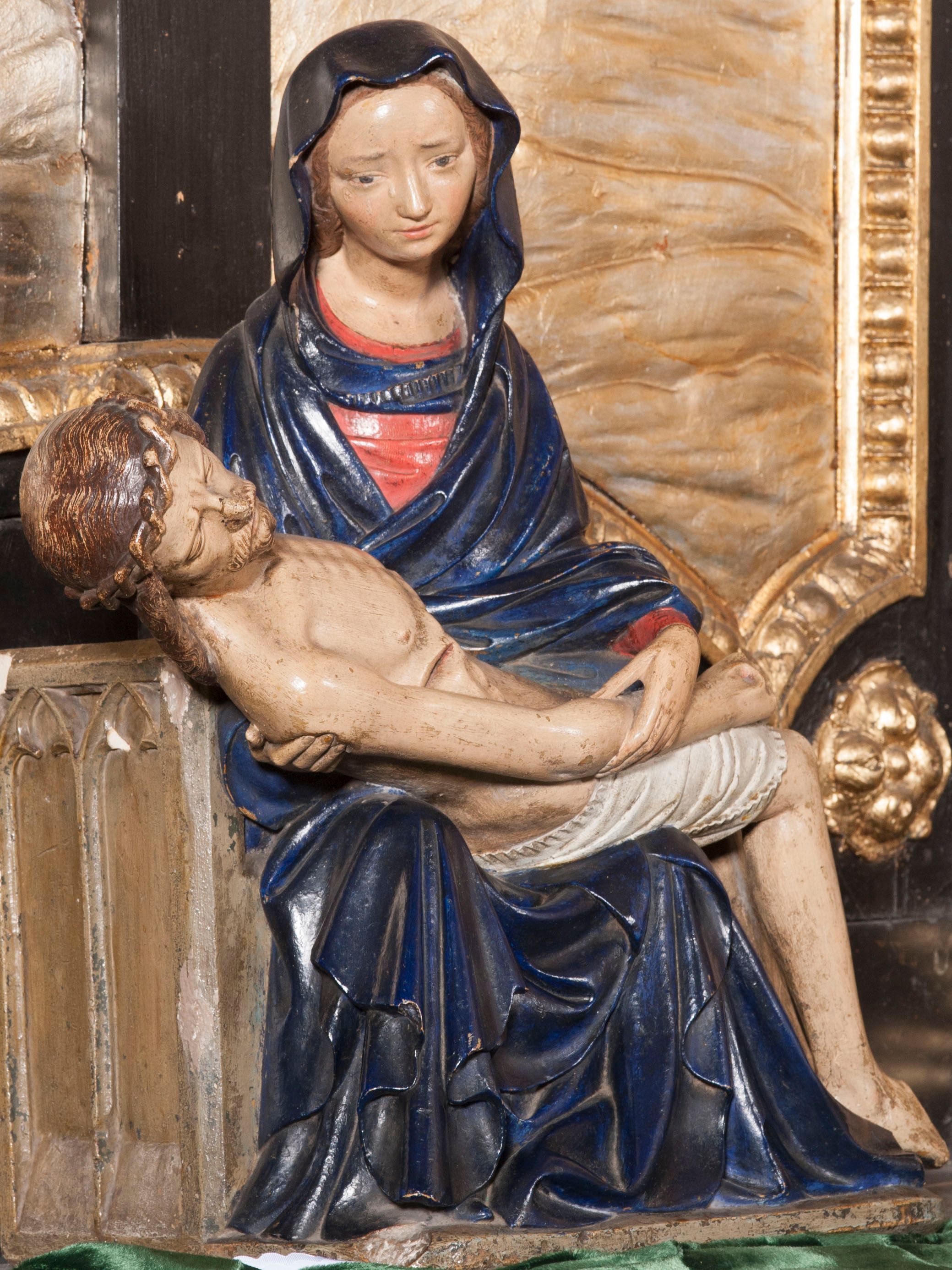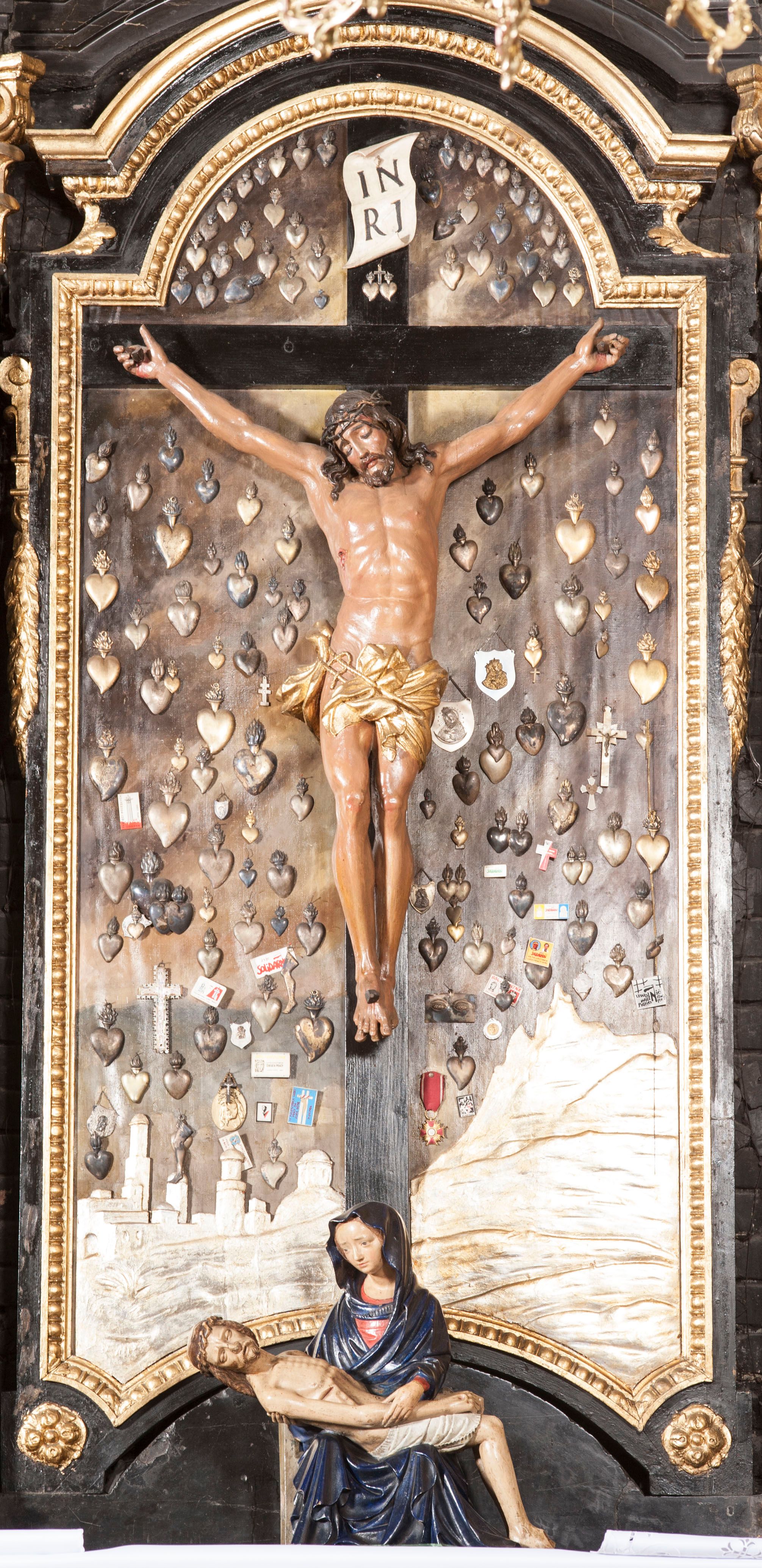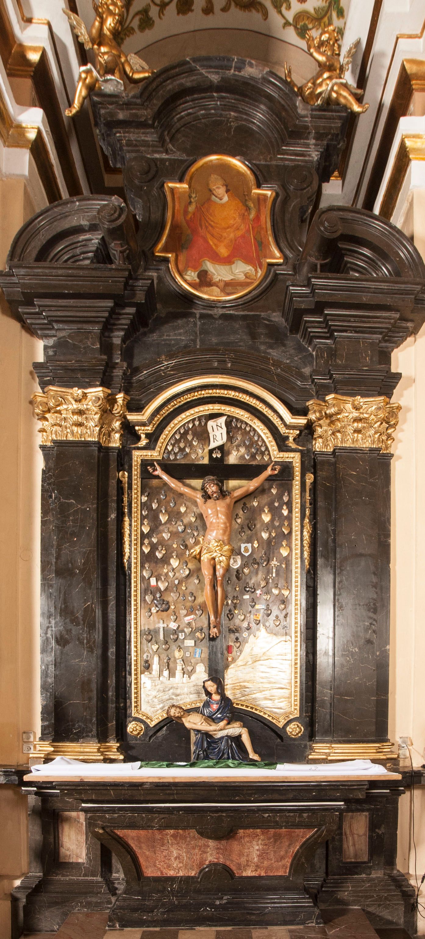Ołtarz architektoniczny, jednoosiowy, jednokondygnacyjny ze zwieńczeniem. Jego mensa jest w typie tumbowym, antepedium w kształcie płyciny wypełnionej różowym marmurem paczółtowickim, z półkolistymi wcięciami na dłuższych bokach. Nastawa jest ujęta zwielokrotnionymi pilastrami o kompozytowych kapitelach, złoconych, podtrzymujących odcinki belkowania z ćwierćkolistymi naczółkami. Belkowanie połączone w partii architrawu, wygiętego łukowato. Zwieńczenie ujęte spływami wolutowymi, podtrzymującymi gzyms o formie łuku nadwieszonego. W polu środkowym rzeźba Chrystusa na krzyżu, na tle płaskorzeźbionego widoku Jerozolimy, ujętego drewnianą, złoconą ramą w formie stojącego prostokąta, z wyciętą łukowato dolną krawędzią i ściętymi ćwierćkoliście narożami, zwieńczonego podwójnym łukiem półkolistym, nadwieszonym. Na całej powierzchni widoku Jerozolimy ulokowane liczne wota. W zwieńczeniu obraz ze sceną Wskrzeszenia Piotrowina, w fantazyjnie wyciętej ramie o bokach krótszych wybrzuszonych a długich wklęsłych.