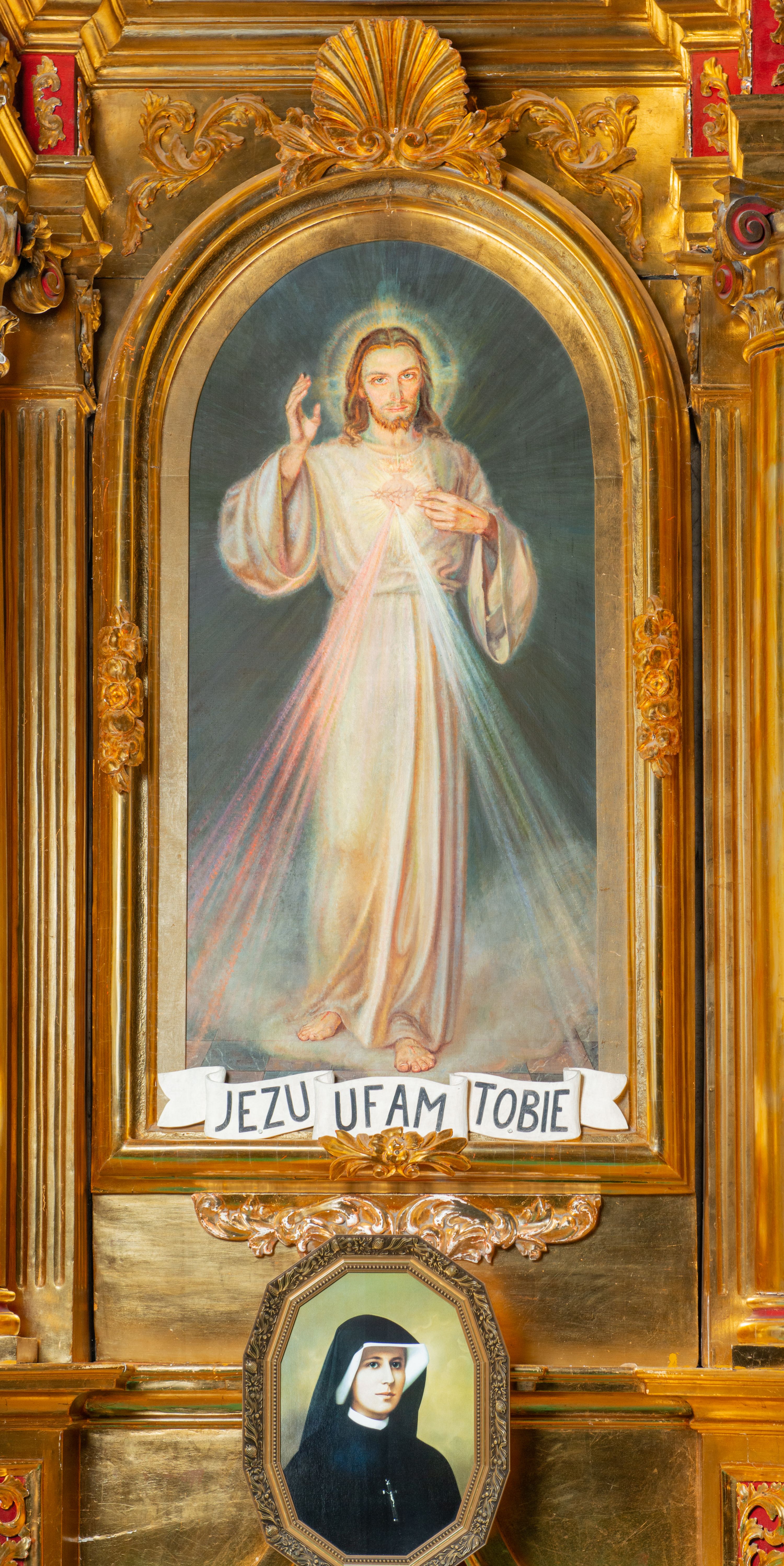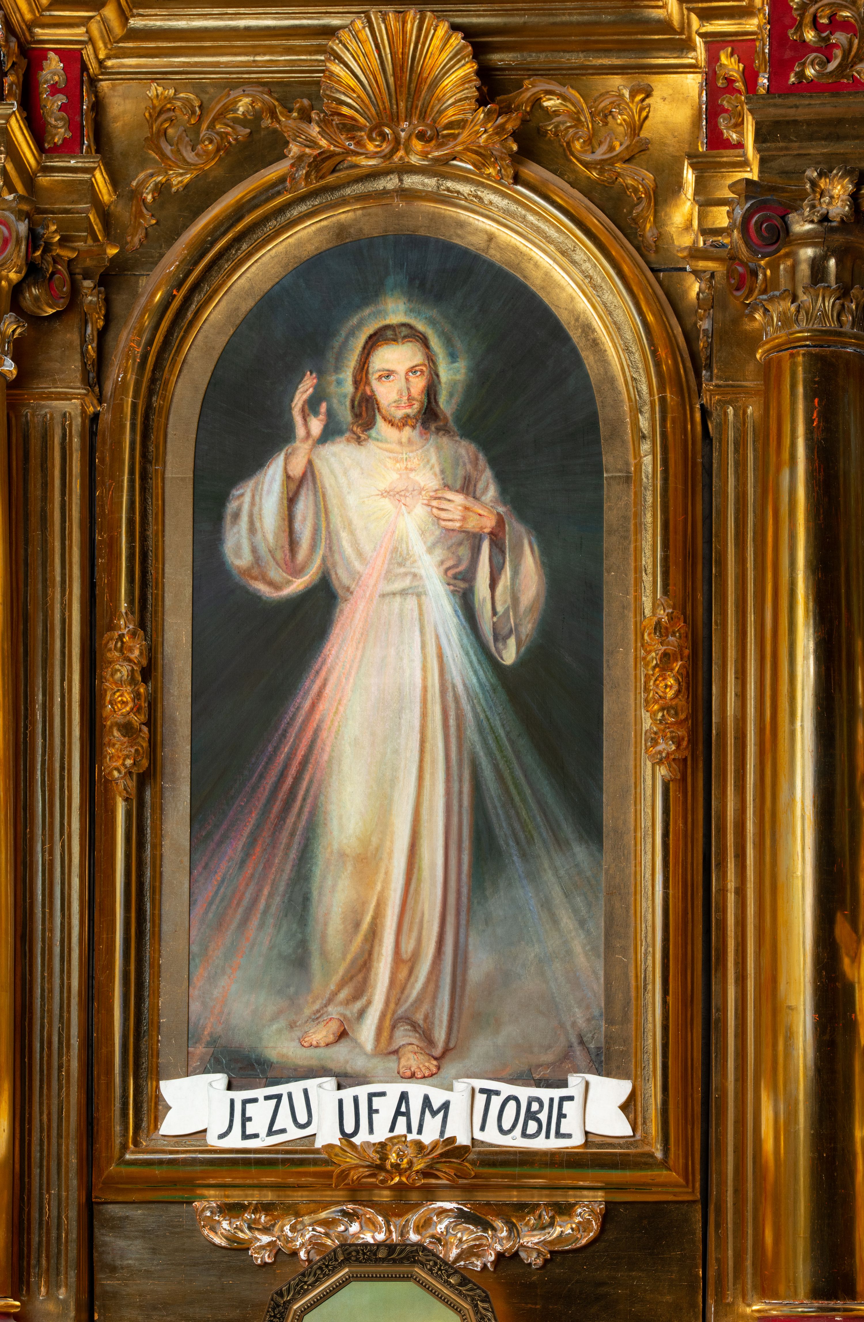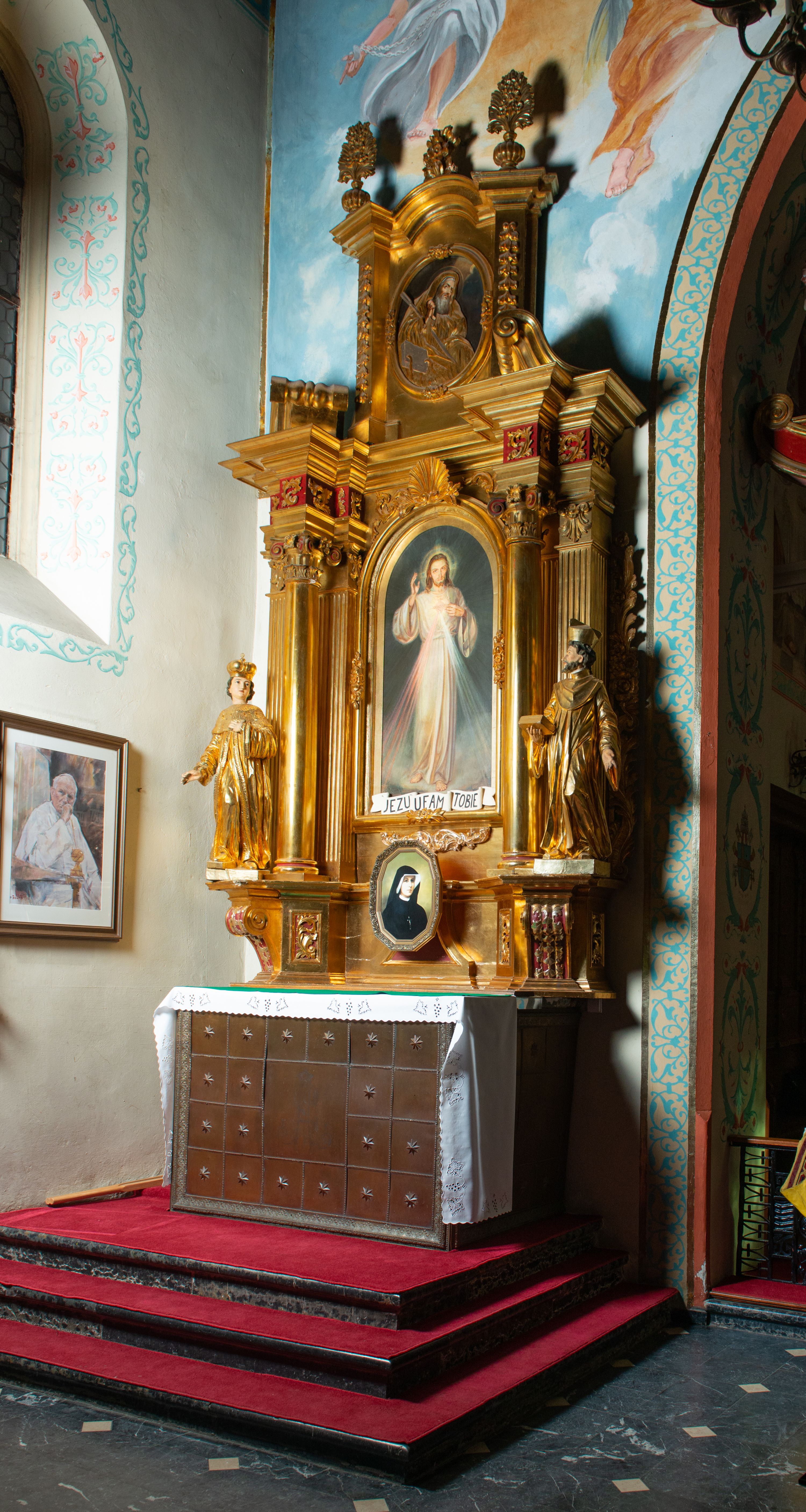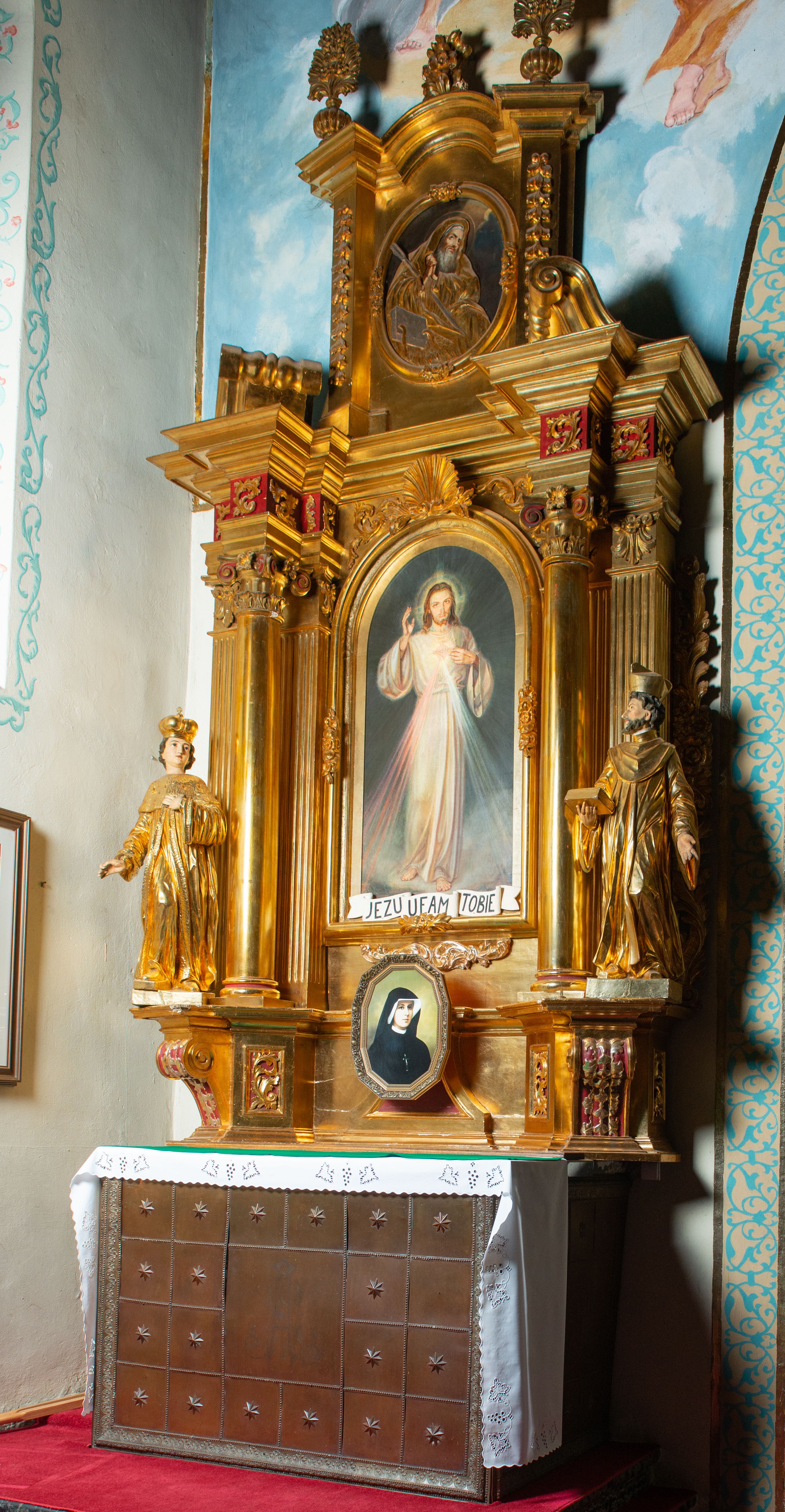 Nastawa architektoniczna, jednoosiowa, dwukondygnacyjna. Ołtarz murowany, prostopadłościenny, obity metalową blachą, zdobioną trybowaną kratownicą i gwiazdkami. Wewnątrz grób Chrystusa ze współczesną rzeźbą. Nastawa na niskim cokole, z wyodrębnionymi dwoma, ukośnie ustawionymi prostopadłościanami, z konsolami, dekorowanymi akantem i kampanulami. Pośrodku cokołu zamontowany obraz św. Faustyny w kształcie wieloboku. Kondygnacja flankowana dwiema parami pilastrów o kanelowanych trzonach oraz ustawioną przed nimi parą kolumn o kapitelach kompozytowych. Podpory dźwigają pełne belkowanie, wyłamane na ich osi, z silnie wysuniętym gzymsem, z przerwanym architrawem i fryzem nad polem środkowym. Na belkowaniu fragmenty przerwanego, wolutowego przyczółka, zwrócone pod kątem, do wewnątrz. W polu środkowym wnęka w formie stojącego prostokąta zamkniętego łukiem półkolistym, ujęta profilowaną ramą dekorowaną na bokach kwiatami, zwieńczoną muszlą. We wnęce obraz „Jezu Ufam Tobie”. Na konsolach, po bokach nastawy ustawione figury św. Kazimierza i św. Jana Kantego. Nastawa flankowana uszami utworzonymi z karbowanej wstęgi i ornamentu roślinnego. Druga kondygnacja węższa, flankowana ustawionymi pod kątem pilastrami, o trzonach dekorowanych kampanulami. Pilastry podtrzymują gzyms wyłamany na ich osi, nad polem przyjmujący kształt łuku półkolistego nadwieszonego. Na nim ustawione dwa wazony z kwiatami i bukiet kwiatów. W polu obraz św. Joachima w formie stojącego owalu, ujęty ramą, dekorowaną ornamentem roślinnym. Struktura niemal w całości złocona, elementy cokołu i fryzu polichromowane w kolorze czerwonym, ornamentyka złocona.