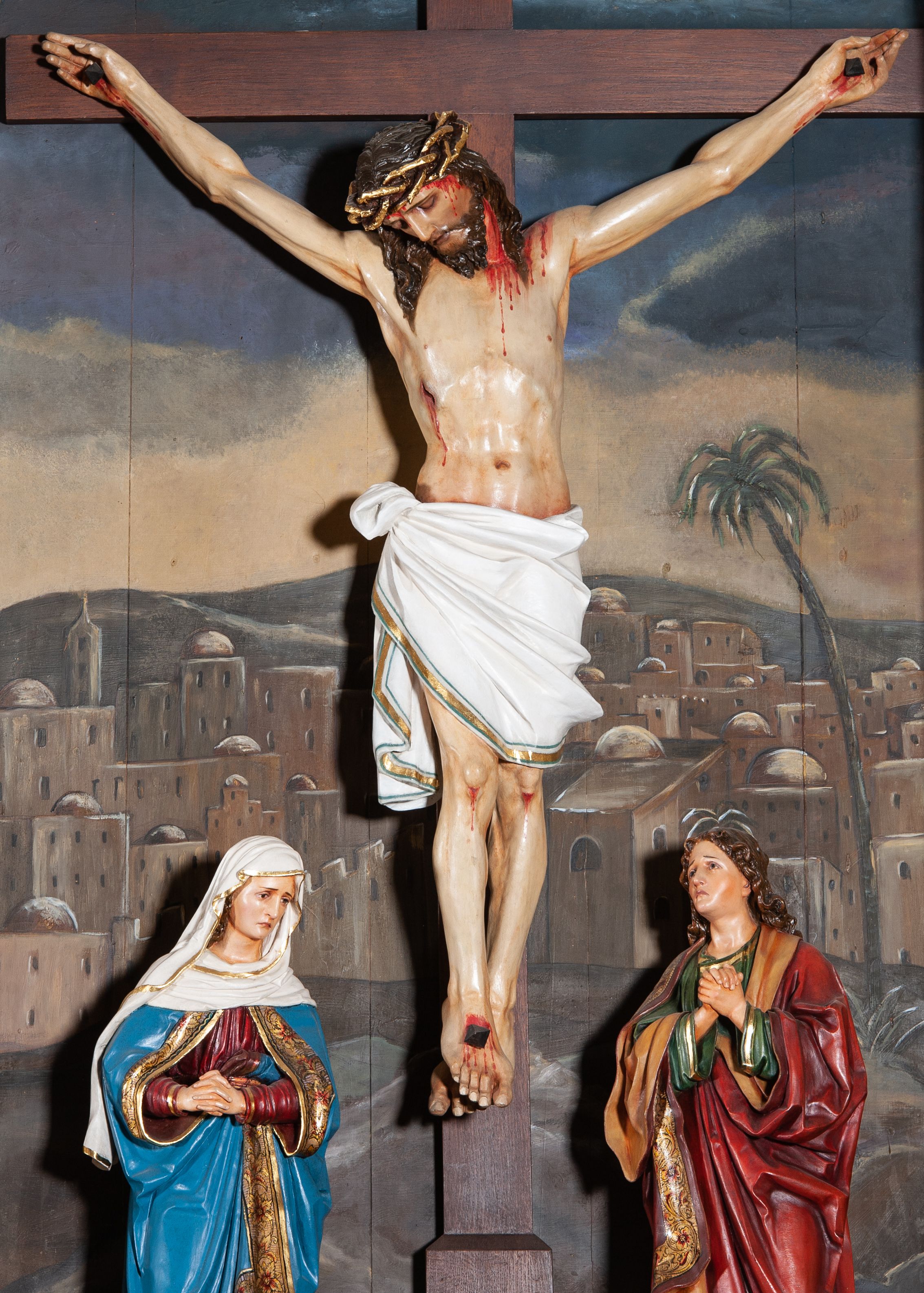 Ołtarz został wykonany w stylu klasycystycznym w XIX wieku. Reprezentuje typ jednokondygnacyjnej, jednoosiowej struktury ujętej parą podpór dźwigających belkowanie z profilowanym gzymsem. Niestety źródła archiwalne nie ujawniły twórcy tego retabulum. Nastawa została wykonana w stylu klasycystycznym i wykorzystuje szereg motywów pochodzących z architektury starożytnej, a także cechuje się dążeniem do harmonii, zrównoważonej kompozycji, zastosowaniem symetrii, przewagą linii prostych bez wygięć i skrętów w przeciwieństwie do ołtarzy barokowych oraz oszczędne stosowanie ornamentyki. Ikonografia ołtarza poświęcona jest Grupie Ukrzyżowania z Matką Boską i św. Janem Ewangelistą, która ilustruje scenę z Ewangelii św. Jana: „Kiedy więc Jezus ujrzał Matkę i stojącego obok Niej ucznia, którego miłował, rzekł do Matki: «Niewiasto, oto syn Twój». Następnie rzekł do ucznia: «Oto Matka twoja». I od tej godziny uczeń wziął Ją do siebie.” (J 19, 26-27). Święty Jan został ukazany w typowym dla niego ujęciu ikonograficznym, jako młody mężczyzna, bez zarostu. Rzeźby zostały wykonane wraz z całą nastawą ołtarzową w XIX wieku.
