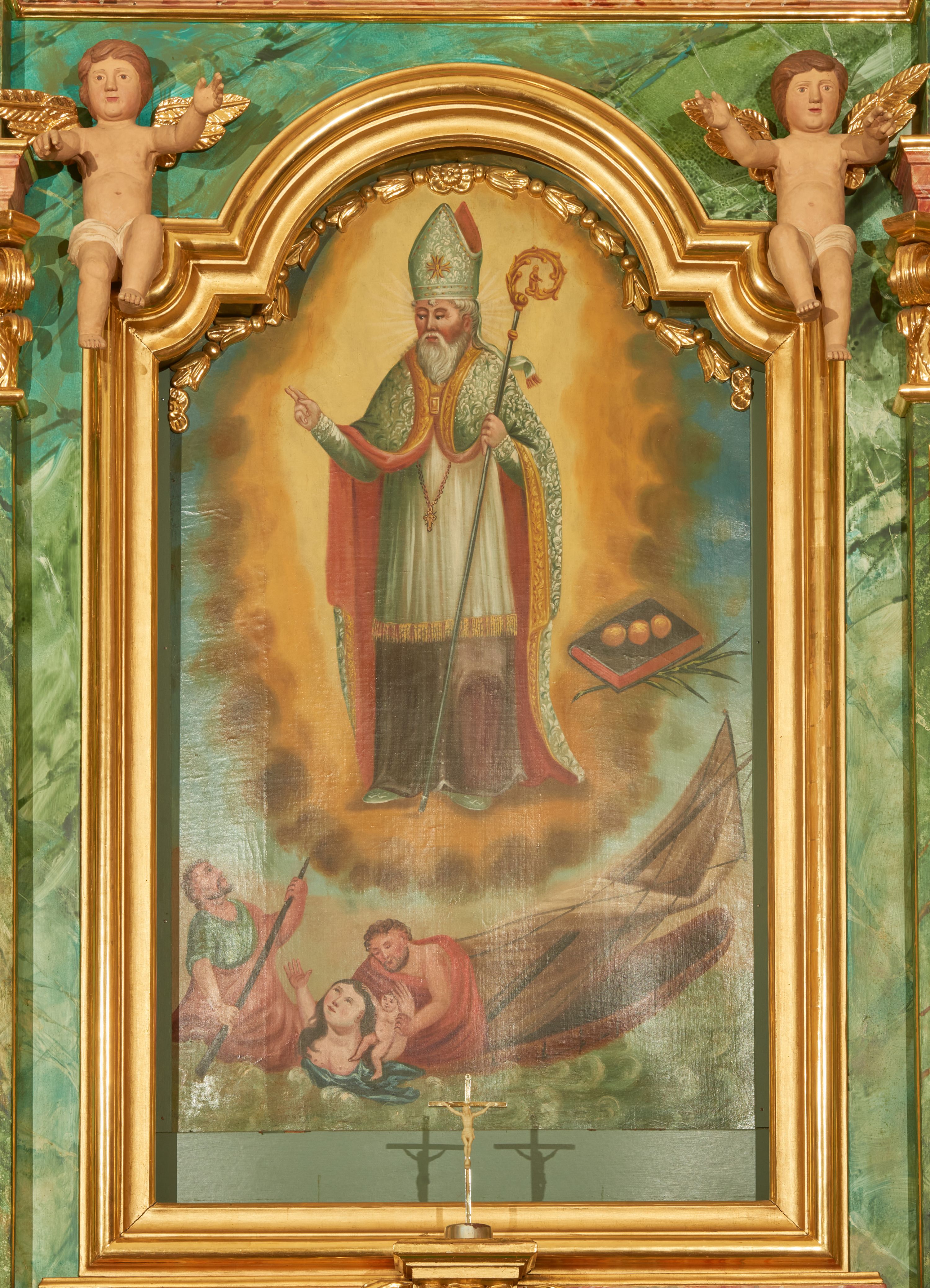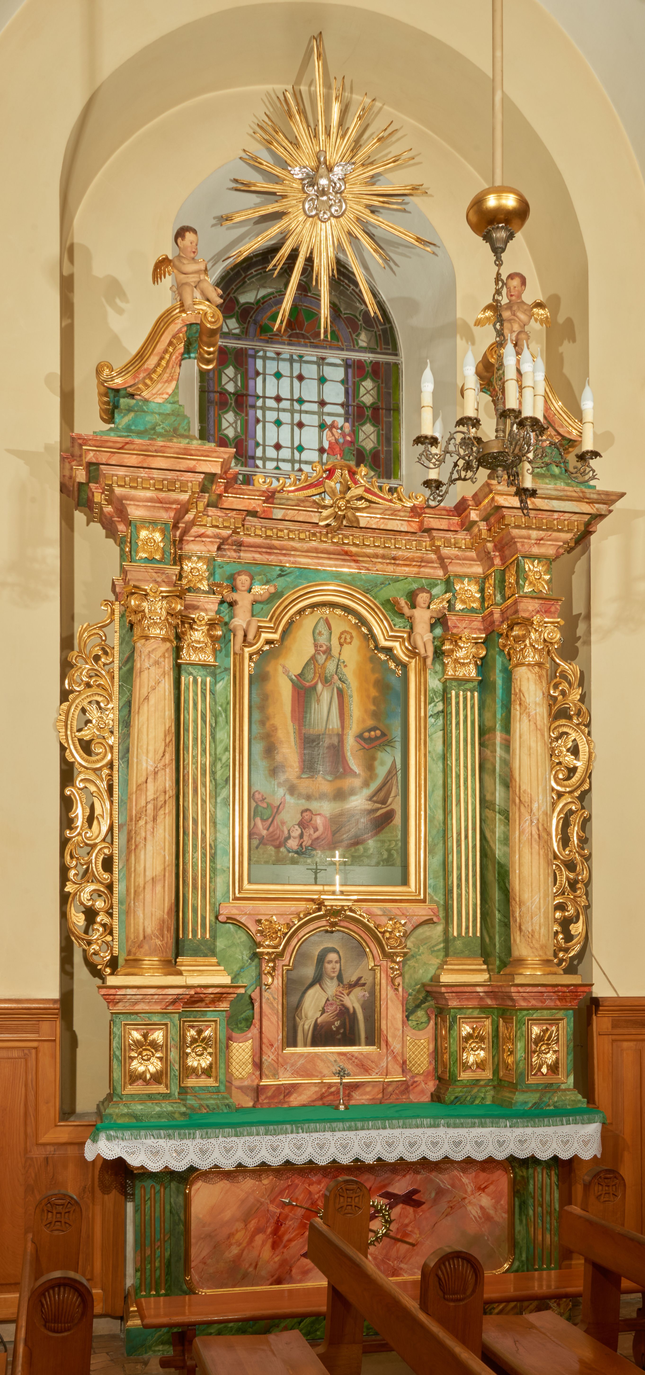 Ołtarz boczny został wykonany w XIX wieku. W polu głównym znajduje się obraz św. Mikołaja, a na zasuwie obraz św. Barbary, oba z XIX wieku. W dolnej partii retabulum umieszczony jest wizerunek św. Teresy z Lisieux z 1932 roku.