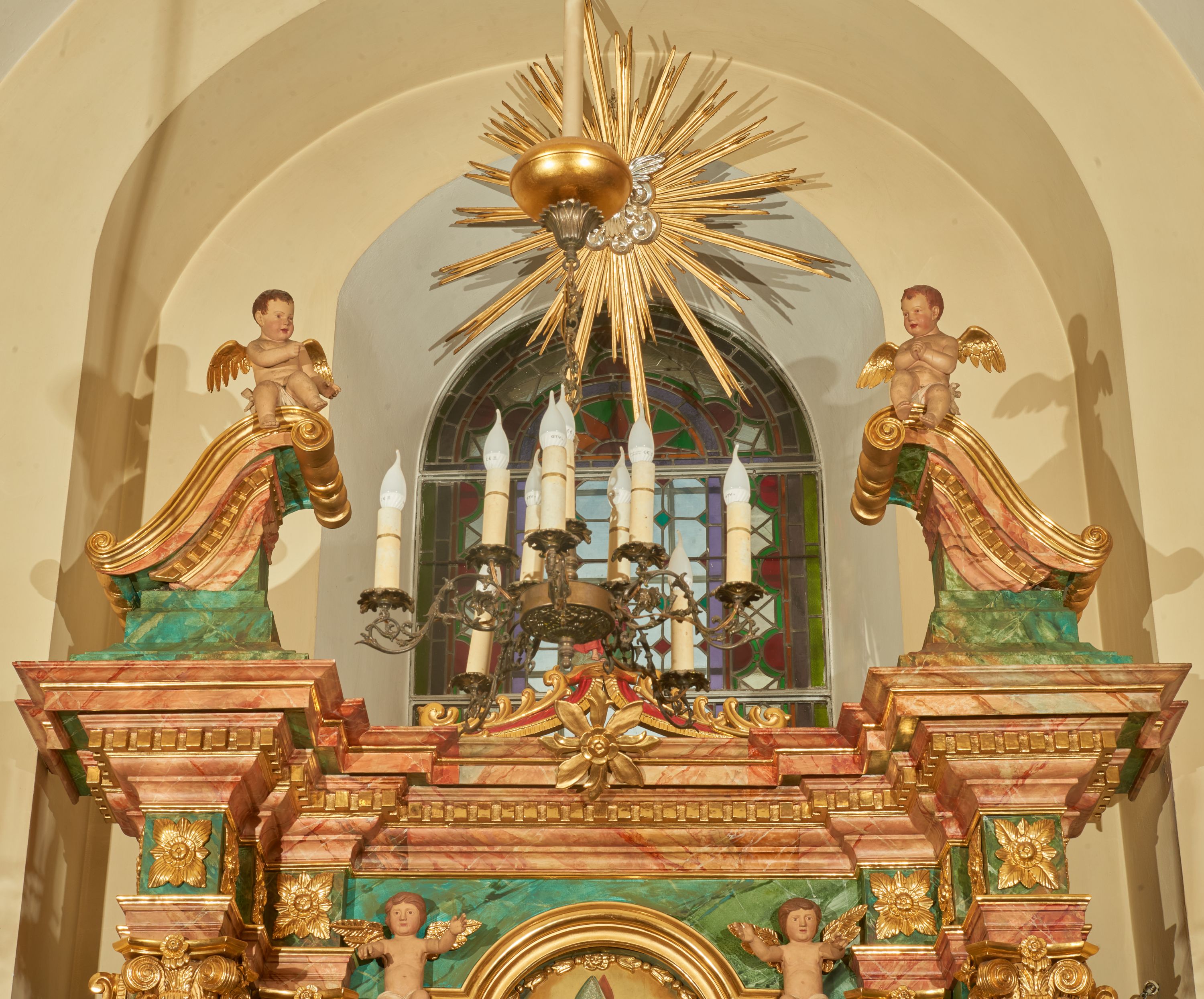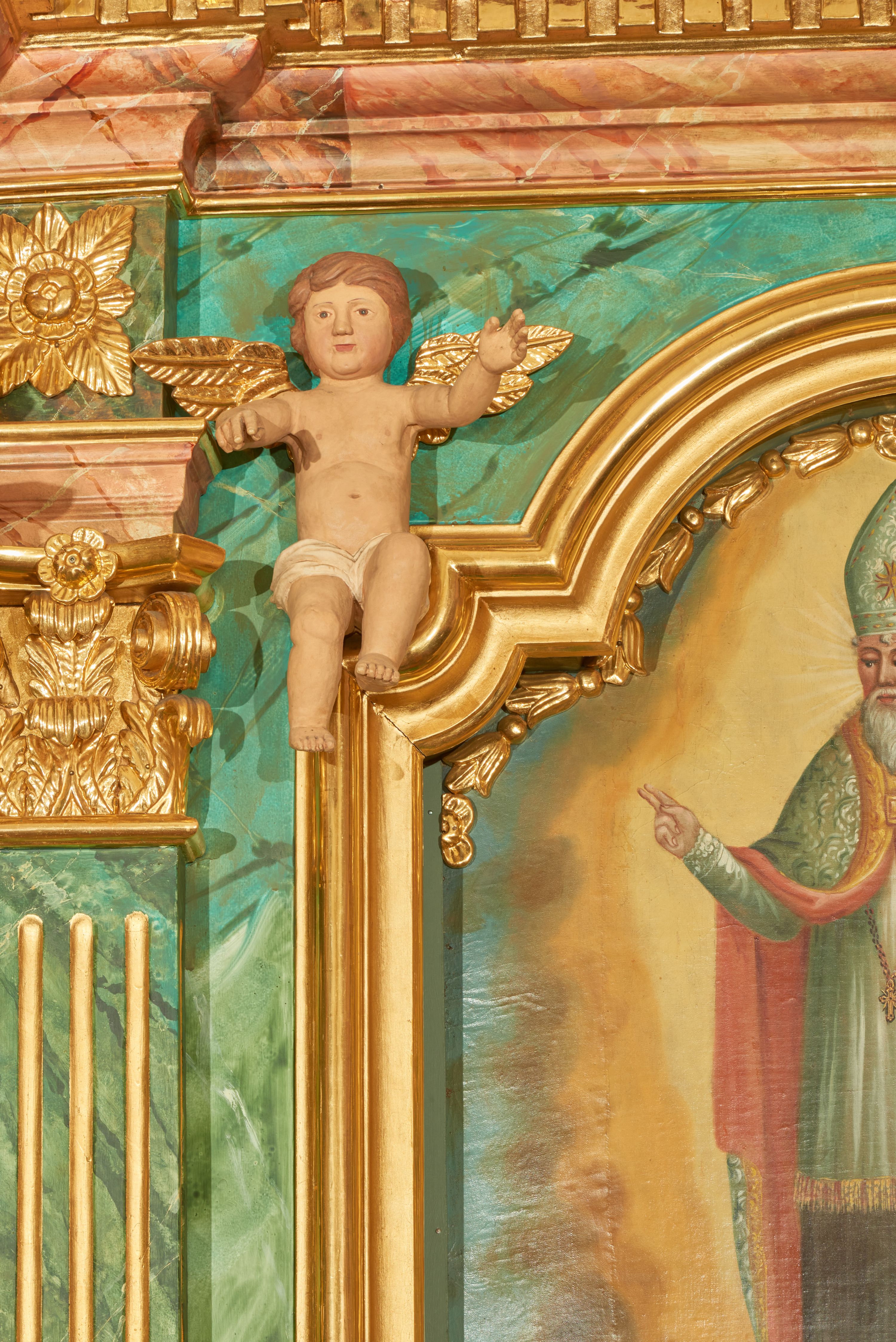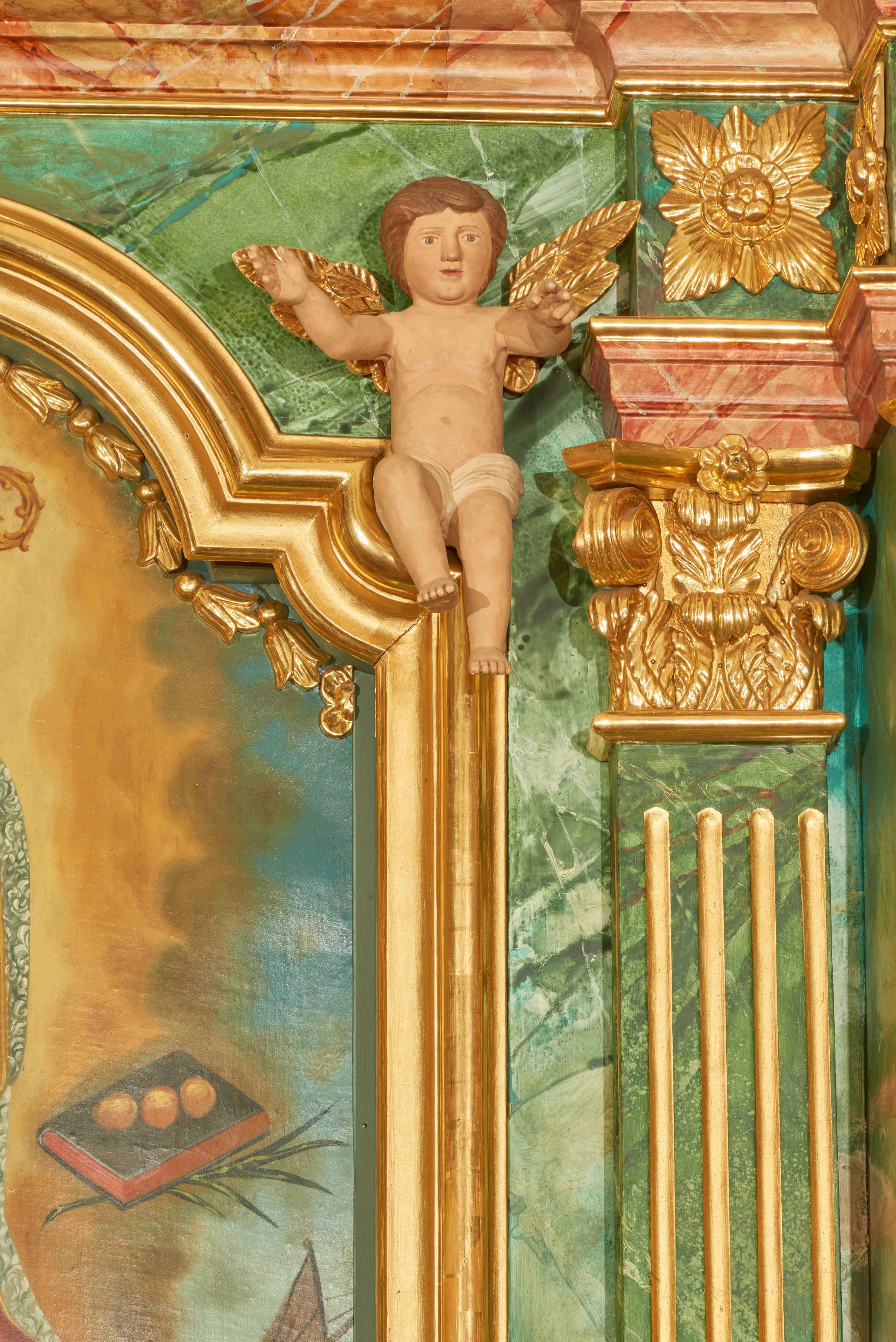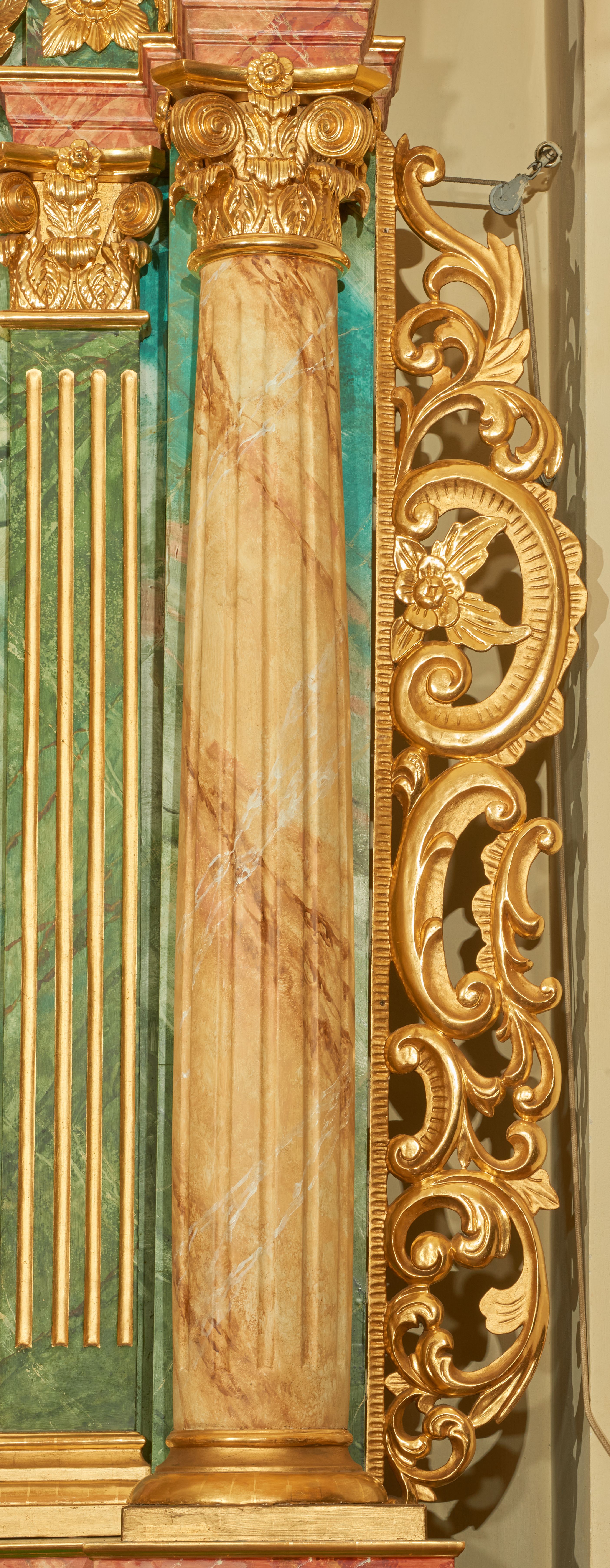 Struktura marmoryzowana jest w odcieniu niebieskim i jasnoróżowym; ornamentyka, profile, ramy i kanelury na pilastrach są złocone.