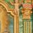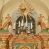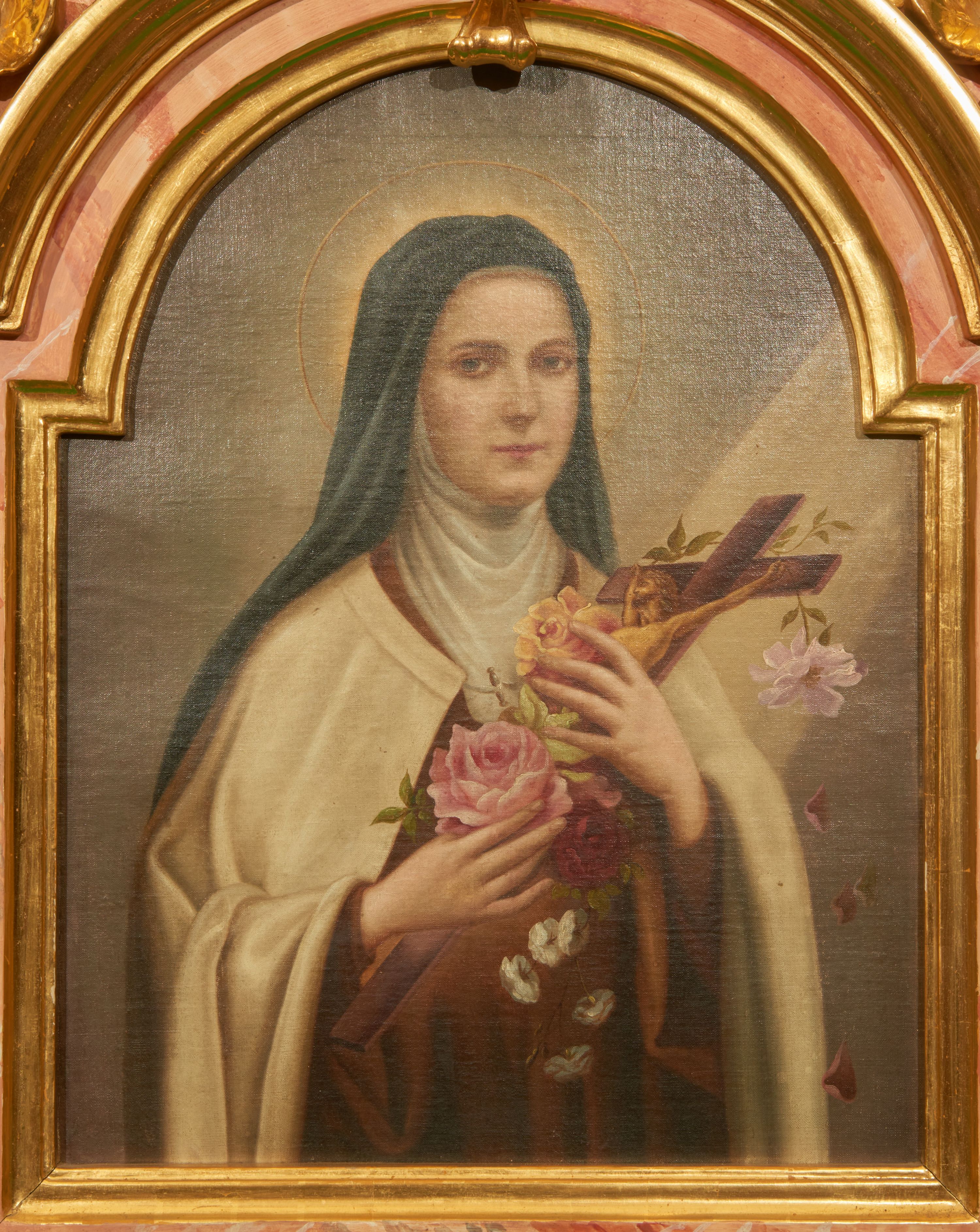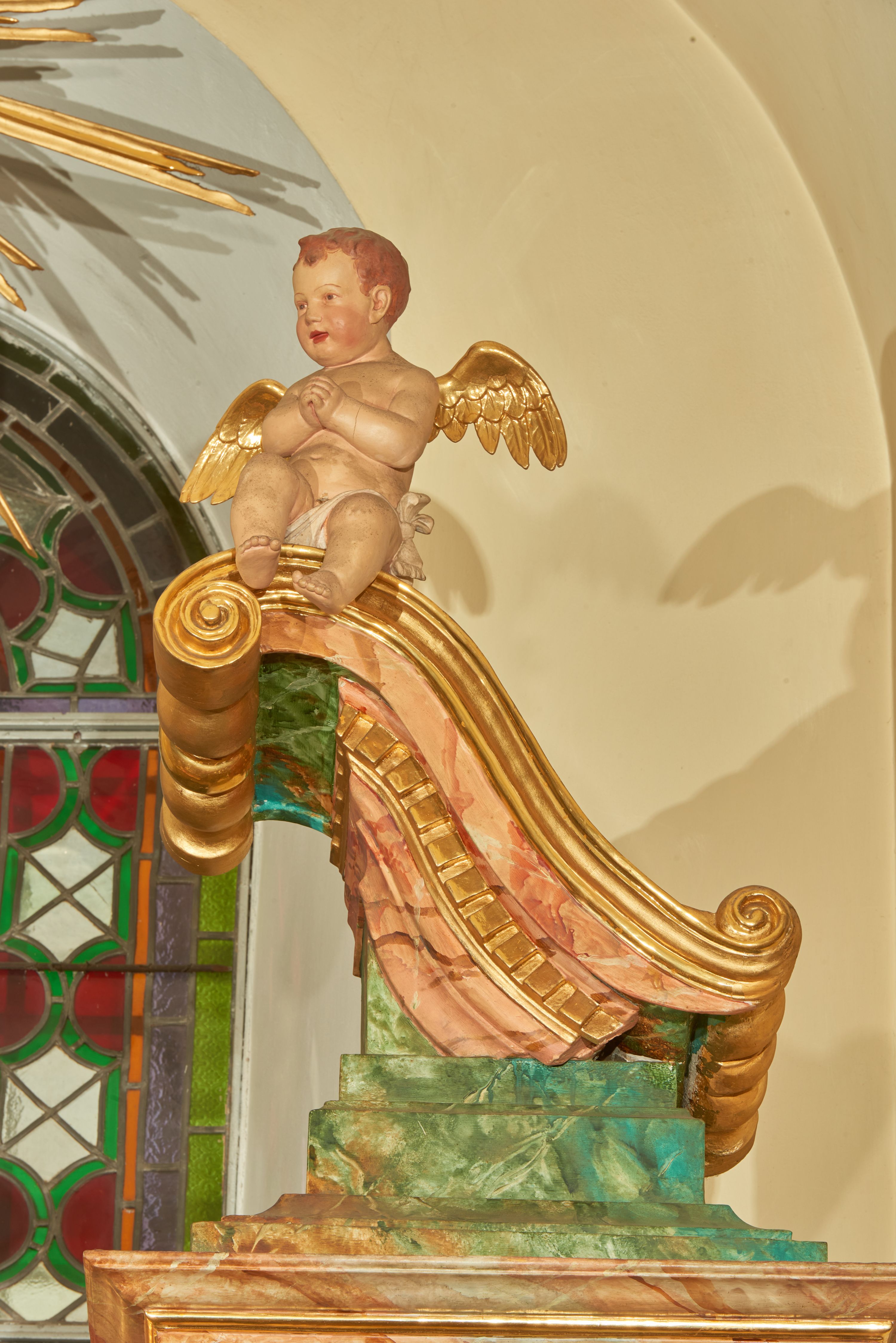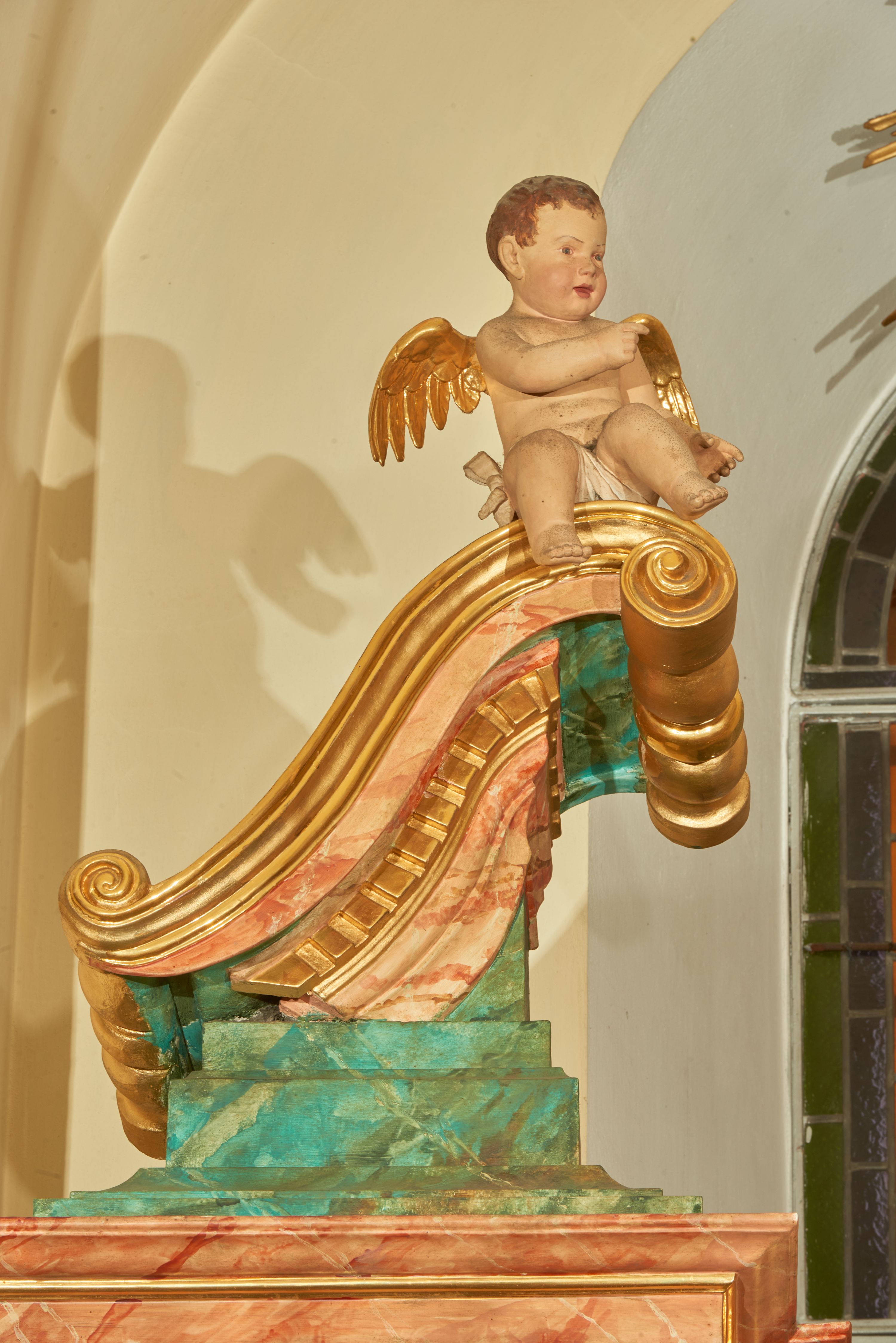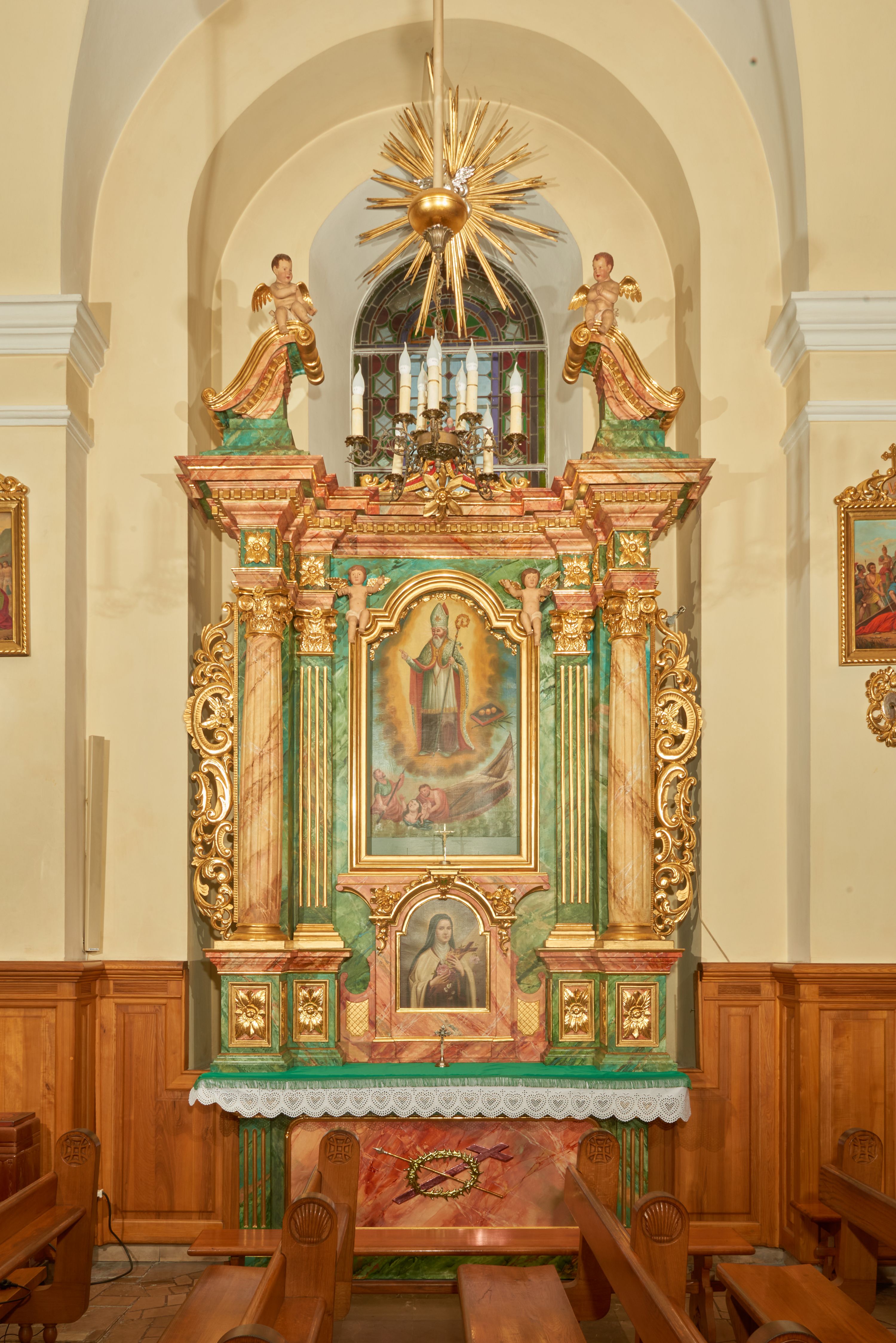 Struktura marmoryzowana jest w odcieniu niebieskim i jasnoróżowym; ornamentyka, profile, ramy i kanelury na pilastrach są złocone.