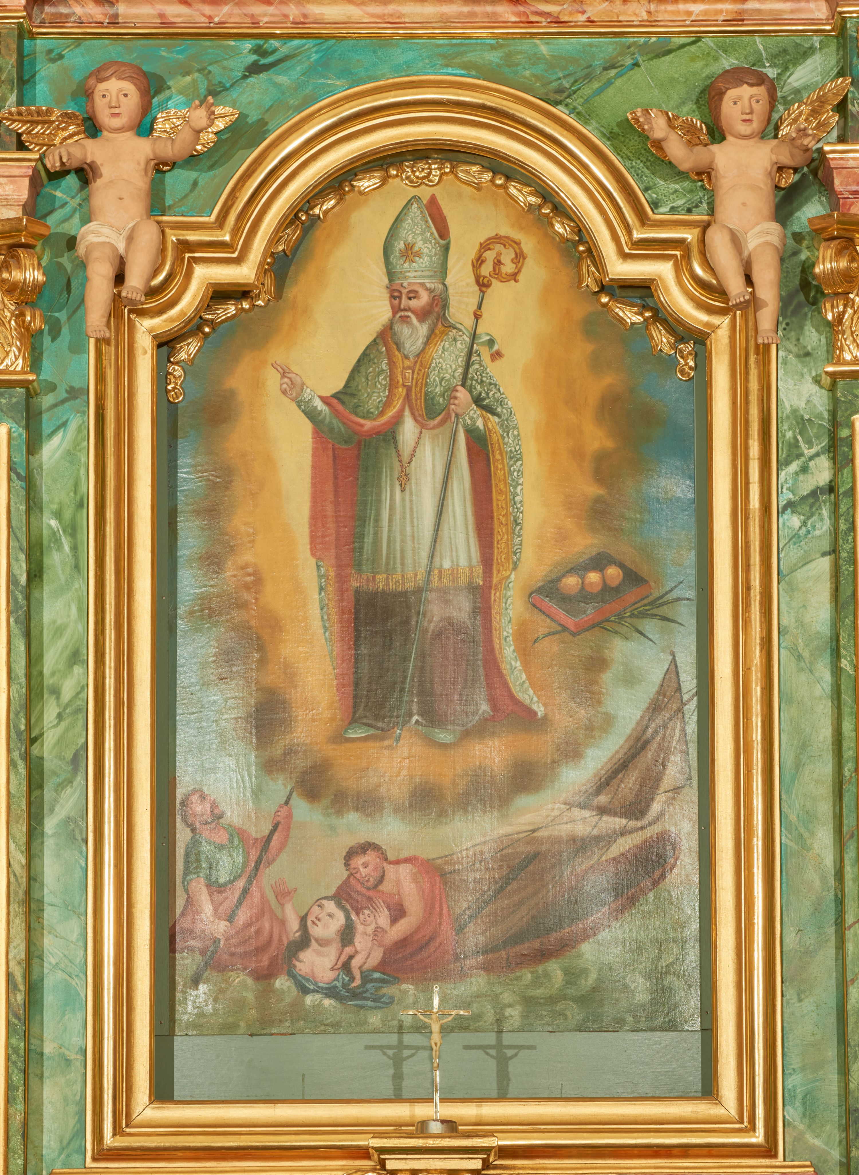 W polu środkowym w szerokiej ramie w kształcie stojącego prostokąta, zamkniętego łukiem wklęsło-wypukłym z uskokami umieszczony jest obraz św. Mikołaja oraz św. Barbary na zasuwie. W zwieńczeniu ramy po bokach usadzona jest para aniołków. Poniżej obrazu fantazyjna, architektoniczna oprawa z umieszczonym w polu obrazem św. Teresy z Lisieux. Oprawa w formie niewielkiej, płaskiej aediculi, ustawionej na niskim cokole, flankowanej dwoma pilastrami, zamkniętej łukiem nadwieszonym, na szczycie którego niski cokolik na krucyfiks. Po bokach uszy o fantazyjnym wykroju, z wycięciem w górnej połowie, w dolnej zdobione kratką.