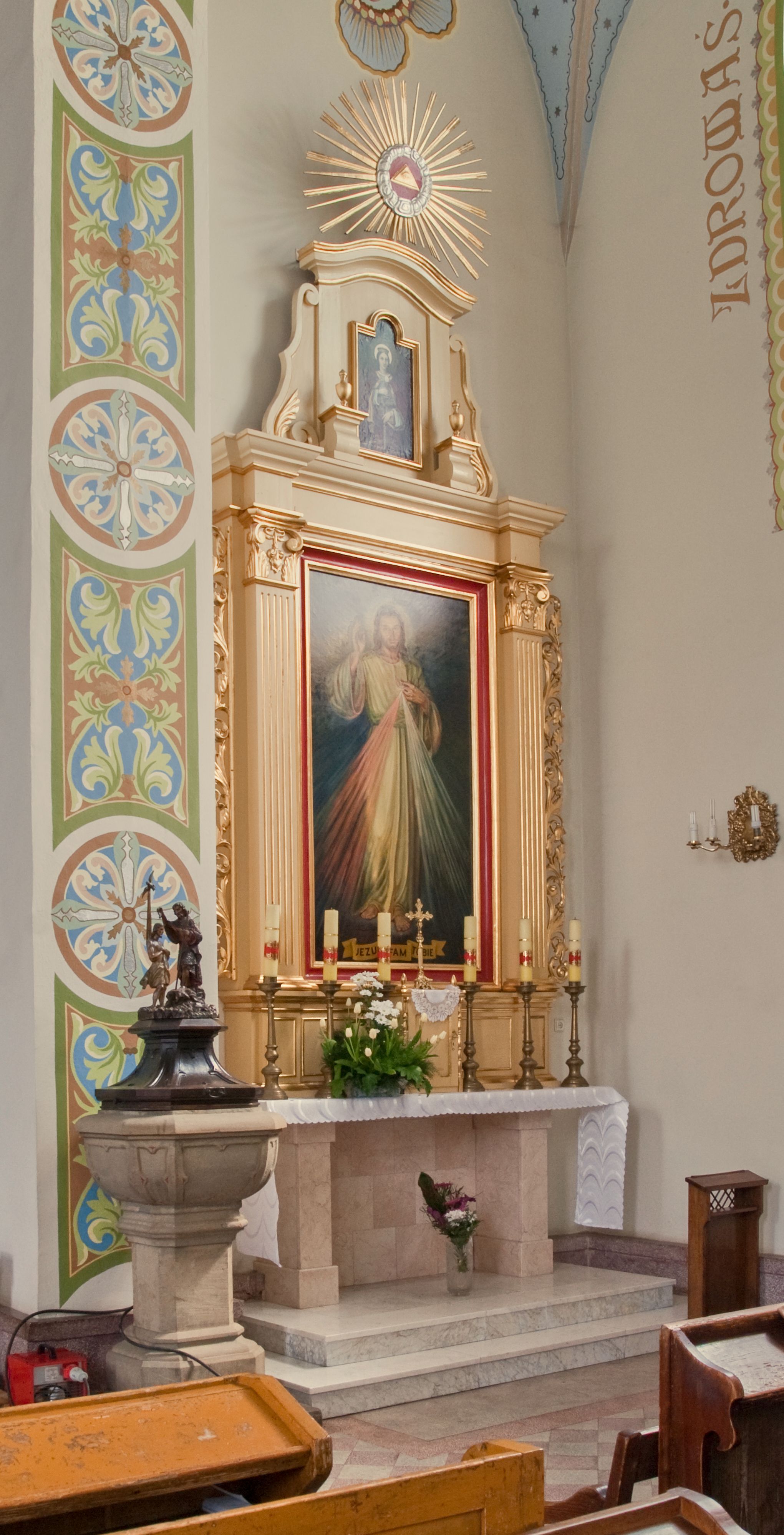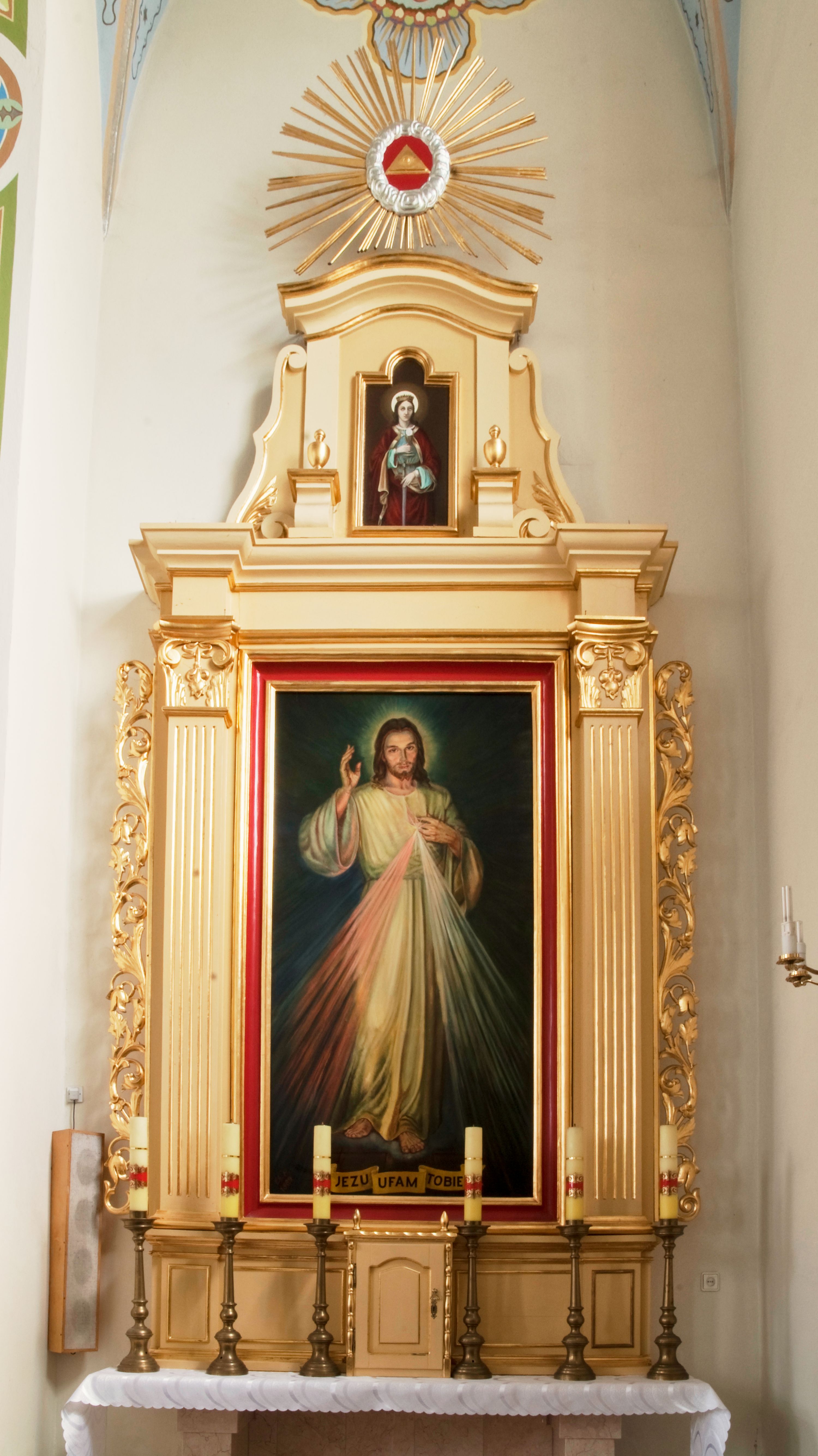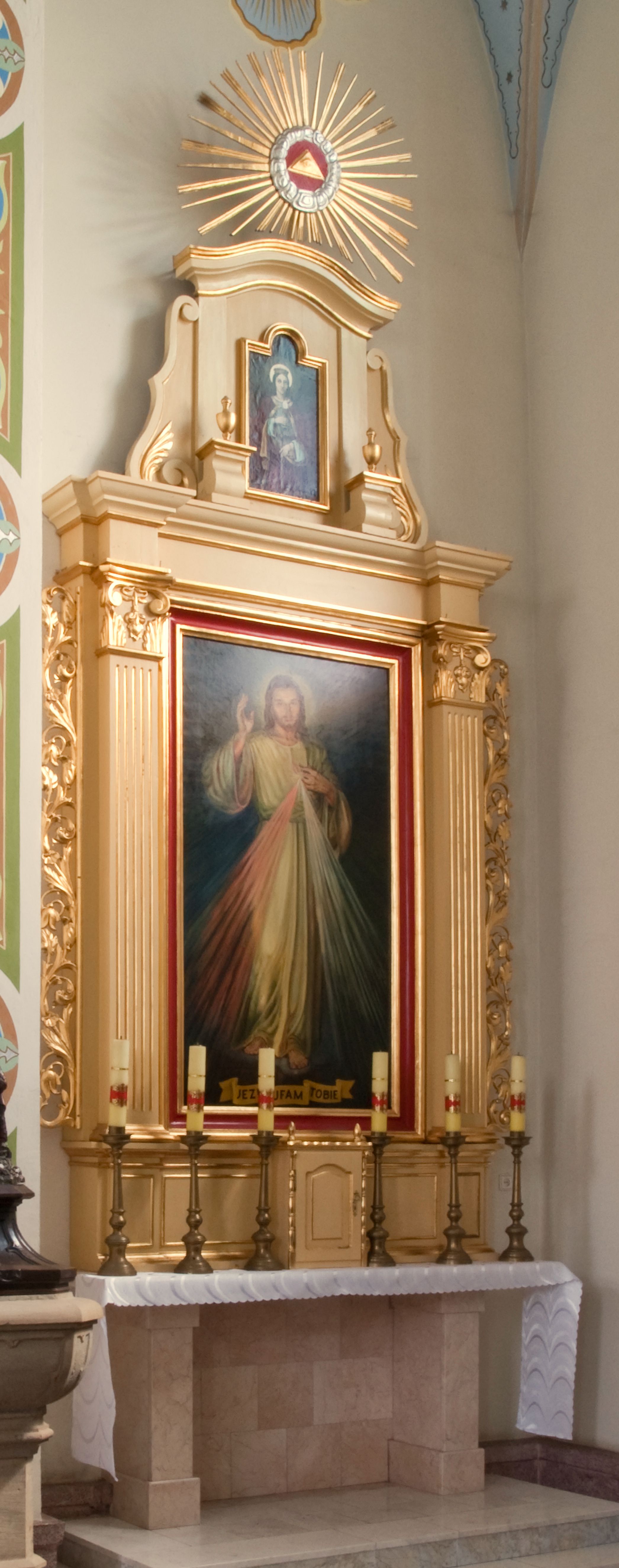 Obraz w polu ołtarza to współczesna kopia obrazu „Jezu Ufam Tobie” namalowanego w 1944 roku przez Adolfa Hyłę, według wizji siostry Faustyny Kowalskiej.