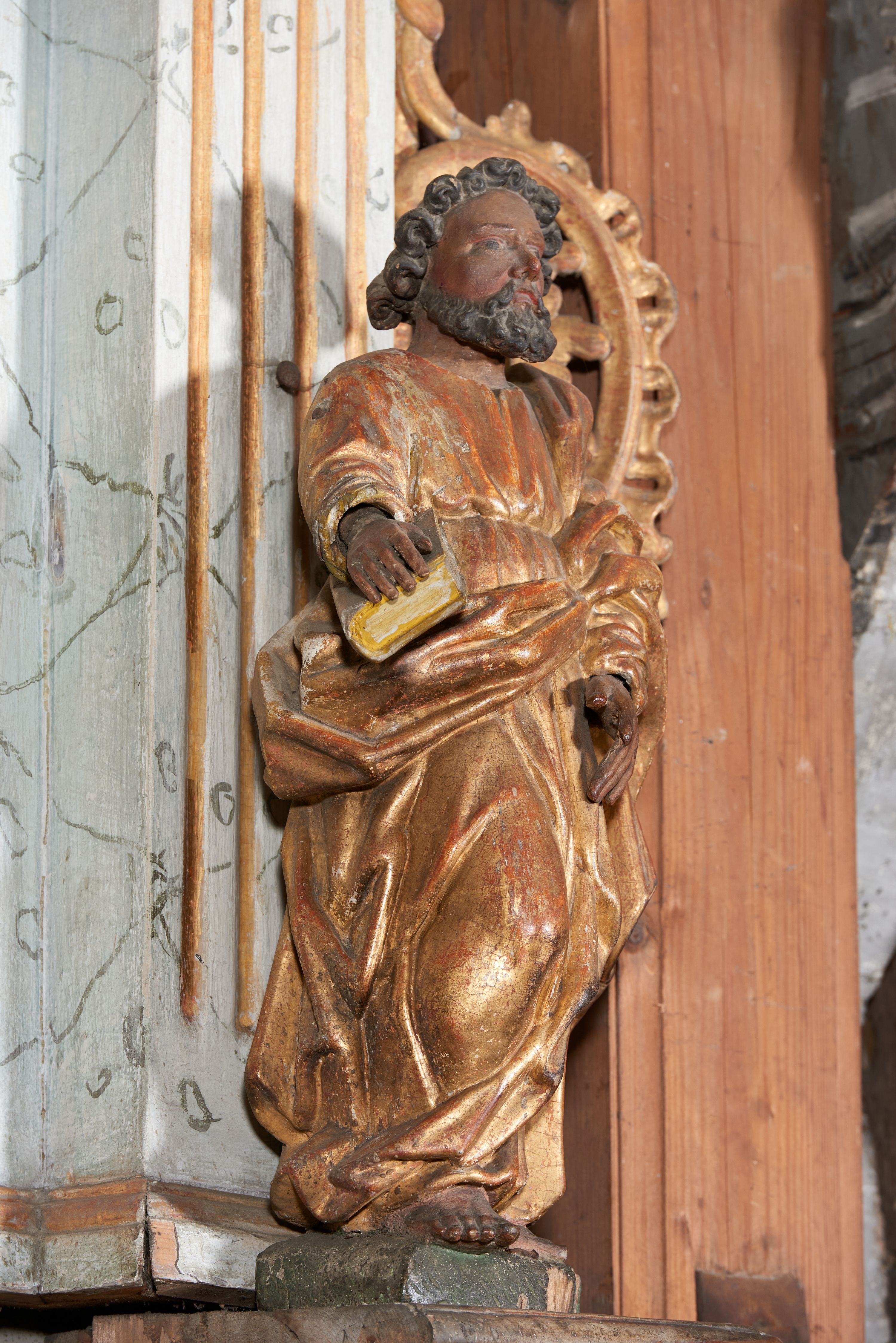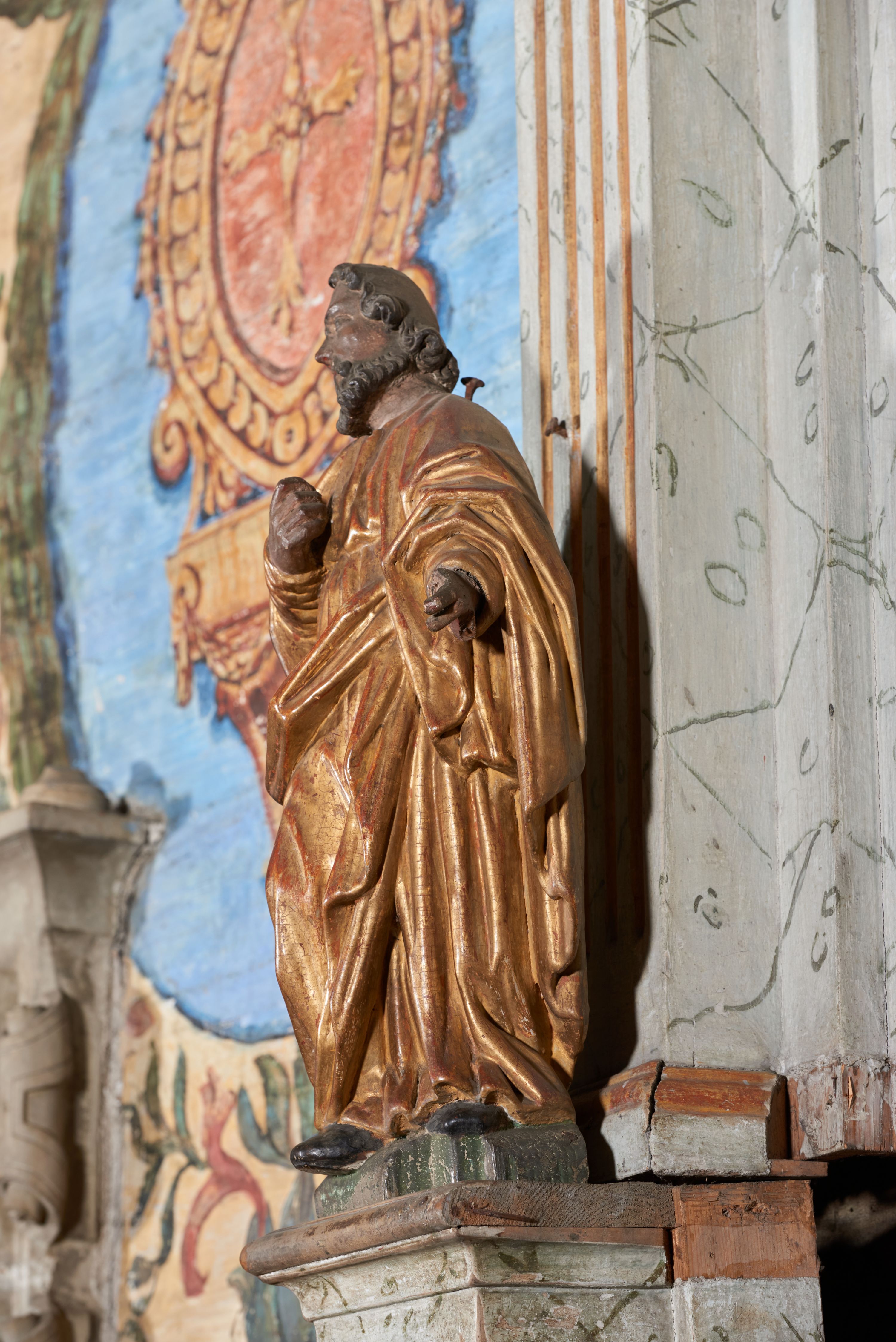 Zły; brak mensy oraz fragmentu konstrukcji pod obrazem głównym, brak prawego fragmentu przerwanego przyczółka oraz jednego zwisu roślinnego dekorującego pierwotnie łuk zwieńczenia. Liczne ślady po drewnojadach, silne zabrudzenia.