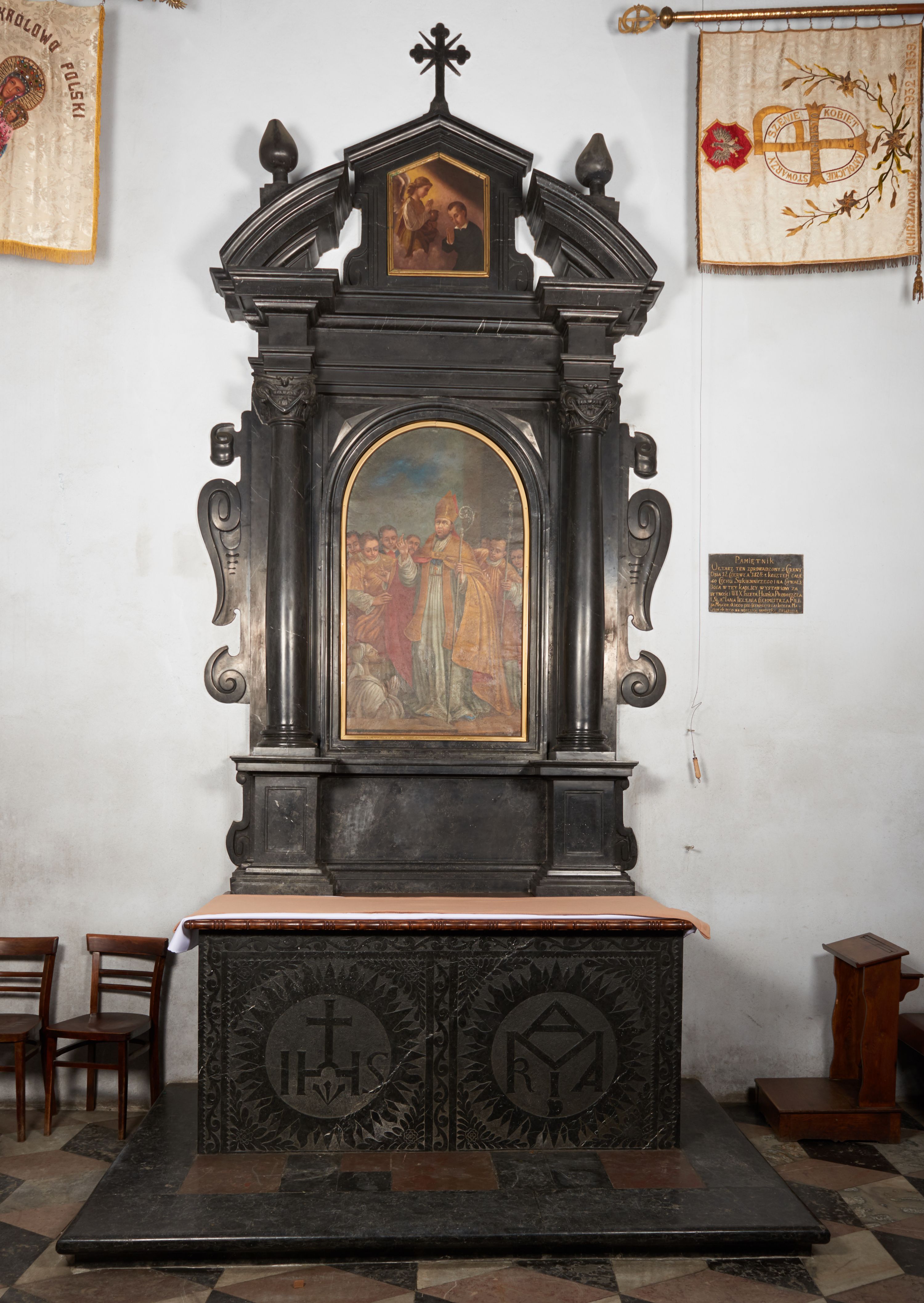 Ołtarz prostopadłościenny z antepedium z rytą dekoracją utworzoną z dwóch kwadratowych pól obwiedzionych bordiurą z wicią roślinną i wypełnionych dwiema gloriami promienistymi z monogramami Jezusa i Marii (IHS i MARIA). Nastawa ołtarzowa jest architektoniczna, jednoosiowa, ujęta kolumnami z jońskimi kapitelami podtrzymującymi belkowanie z przerwanym przyczółkiem, na którym umieszczone wazony. Zwieńczenie w formie prostokąta zakończonego trójkątnym gzymsem, ujęte spływami wolutowymi. W zwieńczeniu obraz ze sceną Komunii św. Stanisława Kostki. Nad zwieńczeniem krzyż o ramionach zakończonych trójlistnie z promieniami między nimi. Po bokach ołtarza dostawione uszy ze spływami wolutowymi i zawijającymi się kartuszami. W środkowym polu obraz w kształcie stojącego prostokąta zamkniętego półkoliście ze sceną Wskrzeszenia Piotrowina. Obok ołtarza wmurowana tabliczka z inskrypcją „PAMIĘTNIK / OŁTARZ TEN ZPROWADZONY Z CZERNY / DNIA 12 CZERWCA 1824. r(oku) KOSZTEM CAŁE/GO CECHU SUKIENNICZEGO I NA CHWAŁĘ / BOGA W TEY KAPLICY WYSTAWIONY ZA / BYTNOŚCI W(IELEBNEGO) I(EGOMOŚCIA) X(IĘDZA) JÓZEFA HUDKA PROBOSZCZA / I SLA(WETNY)CH JANA JELENIA CECHMISTRZA FILI/PA MĄSIORSKIEGO POD CECHMISTRZA I JÓZEFA MA/SIORSKIEGO NA WIECZNĄ PAMIATKĘ OFIARUJĄ”.