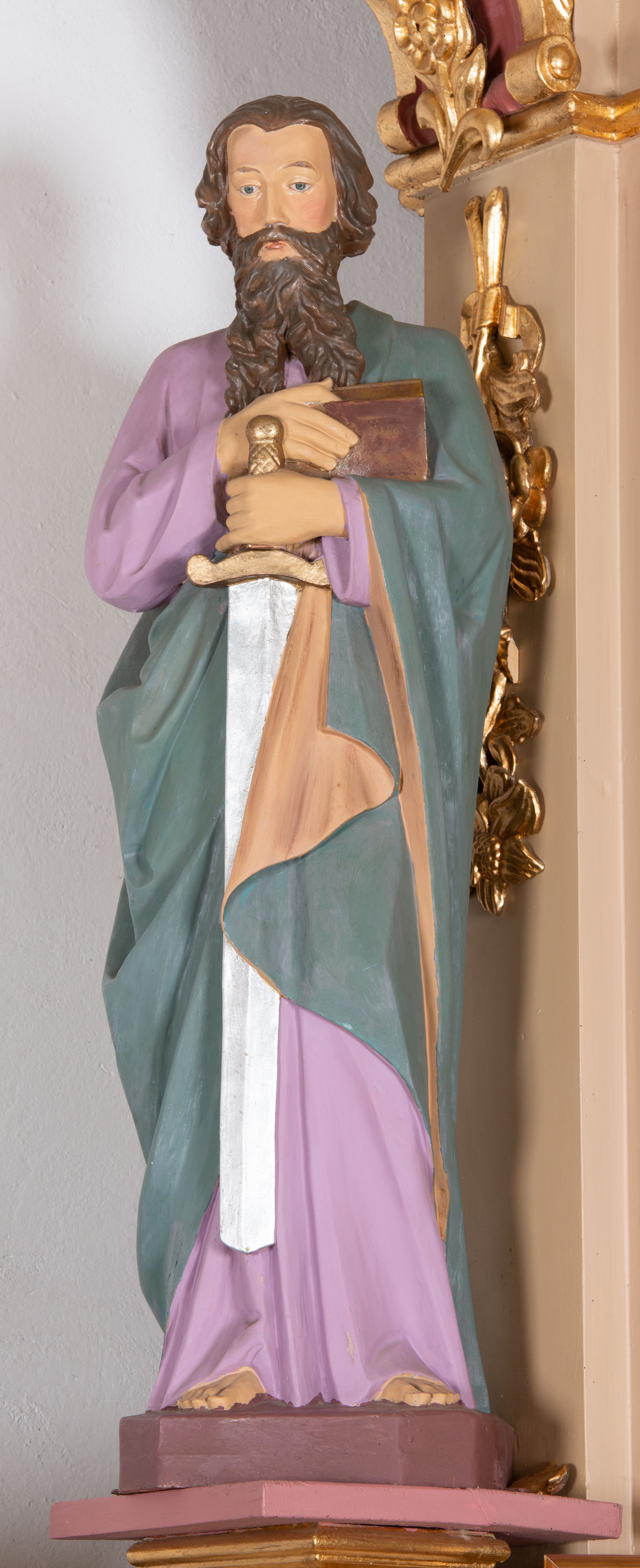 Struktura polichromowana w kolorze beżowym; wnęka i kapitele w kolorze różowym; ornamentyka i partie detalu architektonicznego złocone.