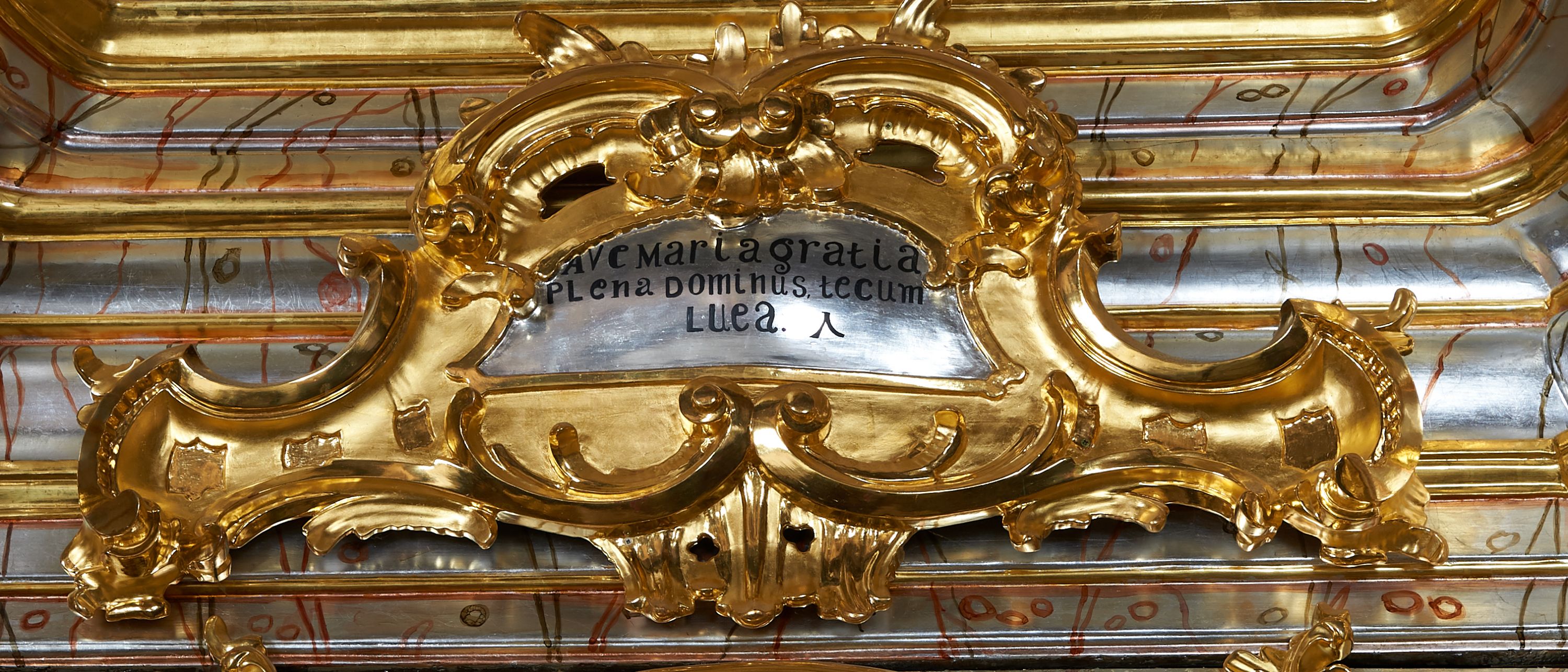 Ołtarz boczny w kościele w Brodach powstał w trzeciej ćwierci XVIII wieku w stylu rokokowym. Reprezentuje typ aediculowy, czyli jednoosiowej nastawy, ujętej parą podpór dźwigających belkowanie ze zwieńczeniem. Stanowi przykład jednego z najbardziej popularnych typów retabulum w XVIII wieku w Europie, najczęściej stosowanych do ołtarzy bocznych, skromniejszych od ołtarza głównego. Ołtarz zdobiony jest ornamentem rokokowym, adekwatnie do czasu powstania. Razem z drugim ołtarzem bocznym Ecce Homo powstał w nieznanym warsztacie rzeźbiarskim. Słowa zapisane w kartuszu są fragmentem Pozdrowienia anielskiego, czyli modlitwy popularnie nazywanej Zdrowaś Maryjo. Pierwsze słowa wypowiedział archanioł Gabriel w czasie zwiastowania (Łk 1, 28), kolejne św. Elżbieta podczas nawiedzenia (Łk 1, 42). Trzecia część modlitwy powstała dopiero w XIV wieku, w czasie epidemii dżumy w Europie.