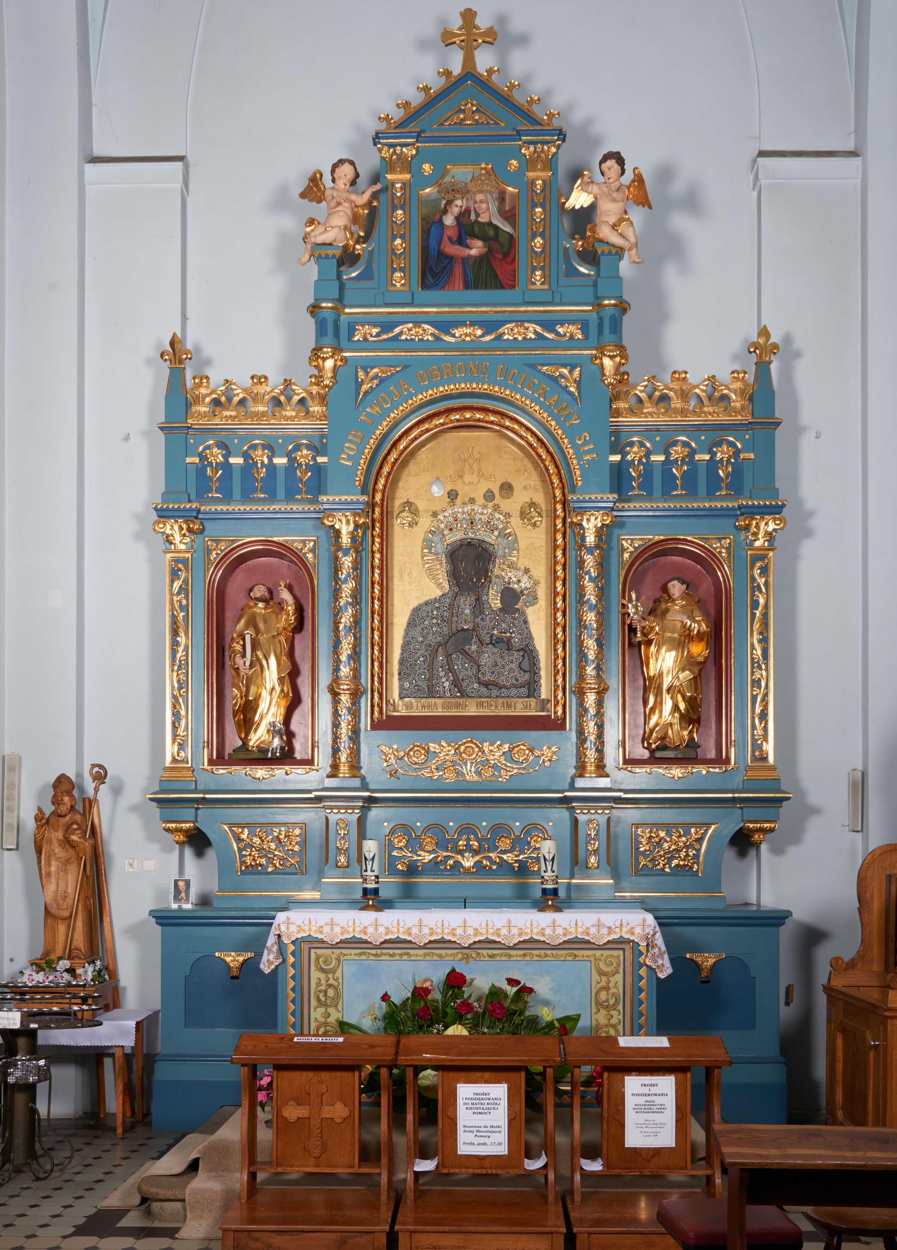 Ołtarz architektoniczny, trójosiowy, jednokondygnacyjny ze zwieńczeniem. Nastawa ustawiona na wysokim postumencie, przed którym stoi zasadniczy ołtarz z drewnianą mensą i marmurowym portatylem oraz współczesnym, malowanym antepedium z przedstawieniem aniołów trzymających koronę. Nastawa osadzona na predelli o wyciętych ćwierćkoliście bokach, artykułowana pilastrami na zewnętrz i kolumnami od wewnątrz. Część środkowa wyższa od bocznych, z prostokątnym polem zamkniętym łukiem półkolistym. Nad polem obrazowym napis „POD TWOJĄ OBRONĘ UCIEKAMY SIĘ”. Pola boczne z niszami zakończonymi półkoliście zakończone prostym gzymsem i ścianką z arkadkami wypełnionymi kwiatkami i zwieńczoną liliami połączonymi półkolistymi listwami. Nad częścią środkową zwieńczenie w formie aediculi, ujęte w dolnej części okrągłymi wieżyczkami z postumentami i zwieńczone liściastymi żabkami i krzyżem. W polu głównym obraz Matki Boskiej z Dzieciątkiem, w niszach figury św. Dominika i św. Jacka, w zwieńczeniu obraz „Nawiedzenie św. Elżbiety” oraz dwa siedzące nagie putta. W środkowym polu predelli i pod obrazem Matki Boskiej ornament w postaci gałązki i kwiatów róż, w bocznych – winne liście i grona. Kolumienki przedzielone ażurową opaską pokrywa spiralnie wijąca się wić winnego grona. Pilastry i pozostałe pola pokryte drobnym ornamentem roślinnym. Struktura jest polichromowana na niebiesko, profile i tła nisz w polach bocznych na czerwono, detale ornamentalne złocone.