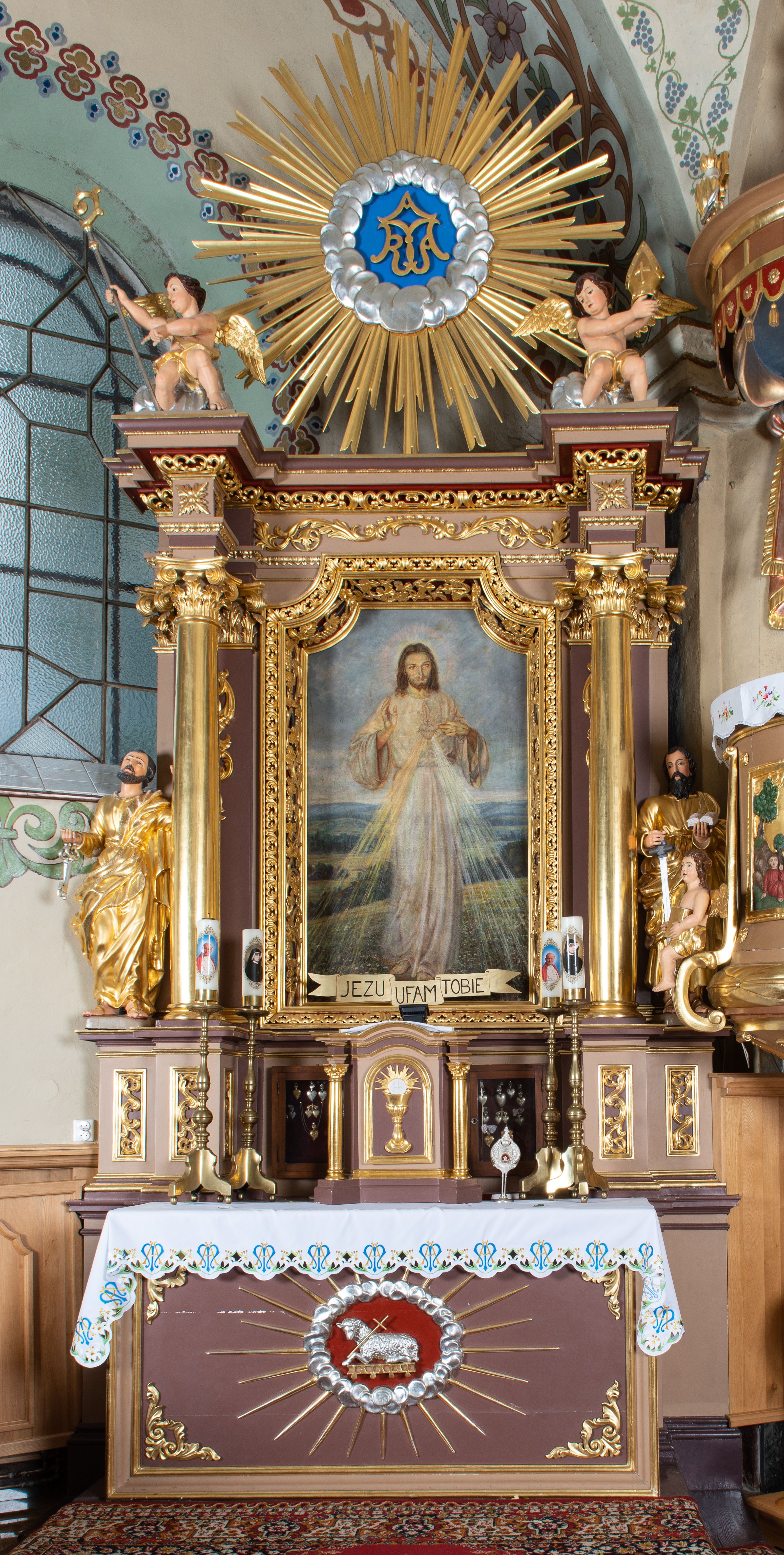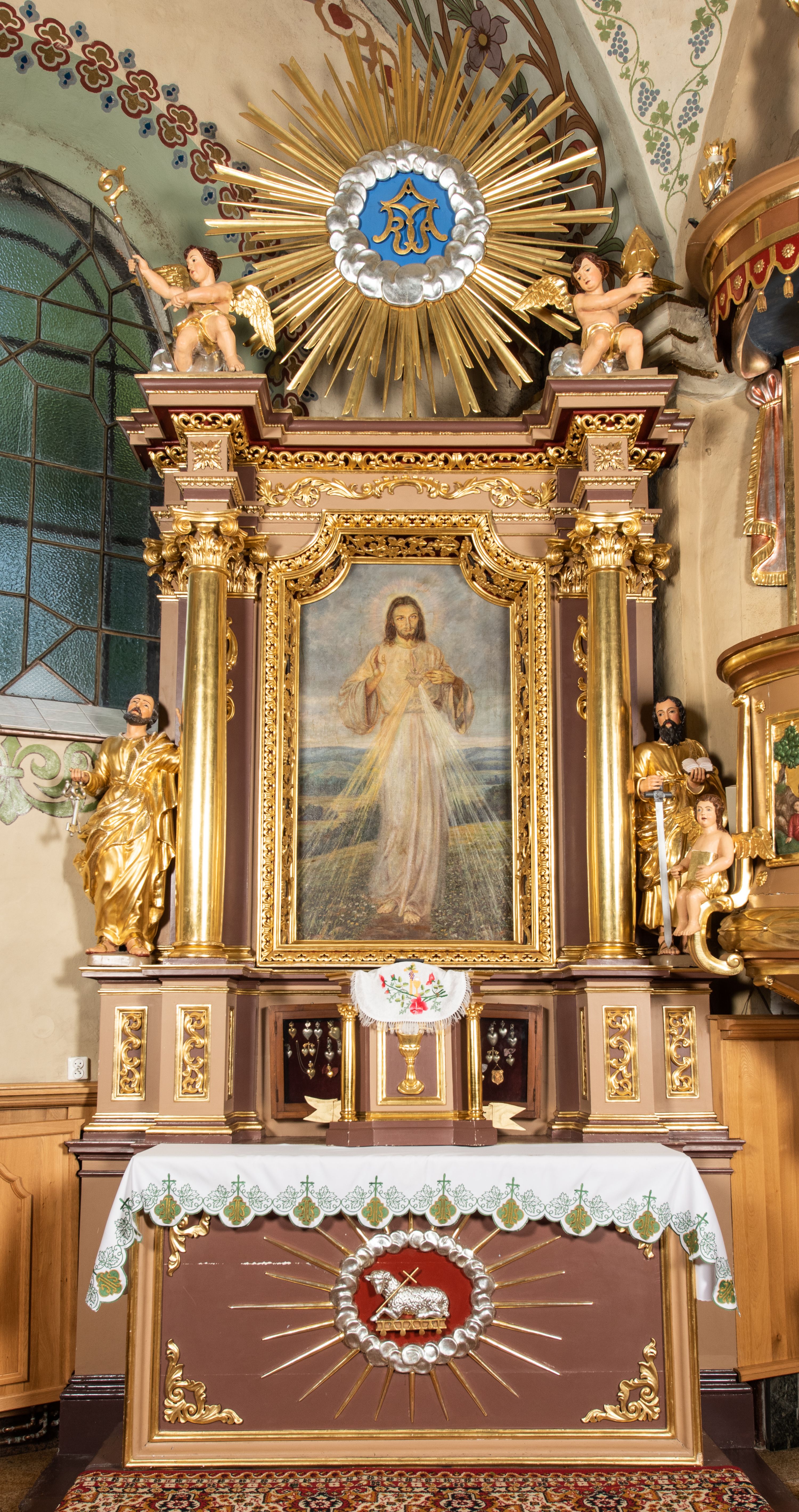 Nastawa ołtarzowa architektoniczna, jednoosiowa i jednokondygnacyjna. Ołtarz prostopadłościenny, drewniany z drewnianą mensą i z marmurowym portatylem. Antepedium w formie prostokąta ujętego profilowaną ramą. W polu płycina o narożach zdobionych płaskorzeźbioną dekoracją roślinną złożoną z liści stylizowanego akantu oraz umieszczonym w polu Barankiem Paschalnym na księdze z siedmioma pieczęciami na czerwonym tle w otoczeniu obłoków i promienistej glorii. Tabernakulum w kształcie prostopadłościennej skrzynki na niskim cokole, flankowane dwiema kolumnami ustawionymi pod kątem, zamknięte od góry prostym belkowaniem, pośrodku nadwieszonym. Na drzwiczkach płycina w kształcie stojącego prostokąta, zamkniętego łukiem półkolistym, ujęta profilowaną ramą, w polu umieszczony jest płaskorzeźbiony kielich z hostią.