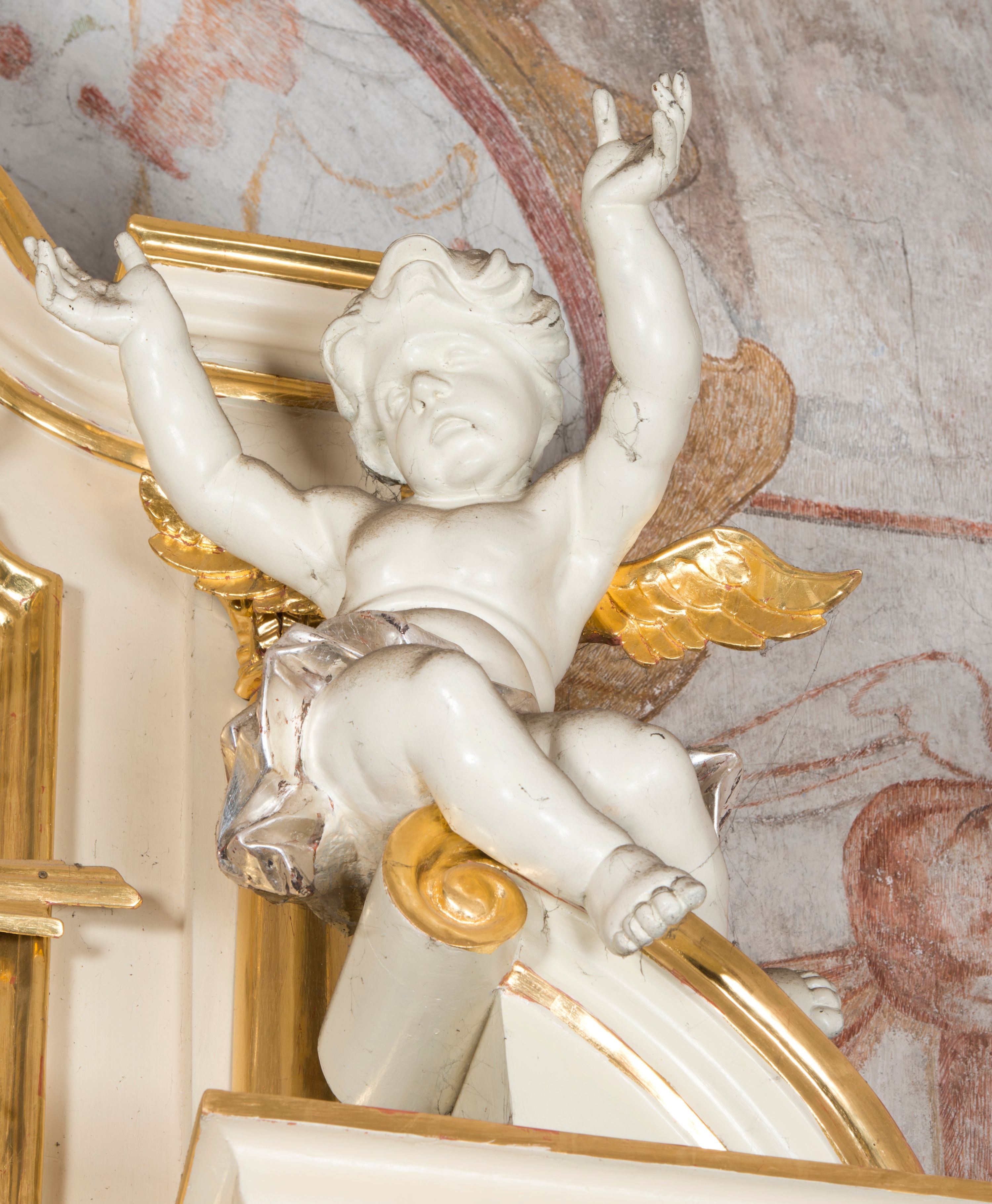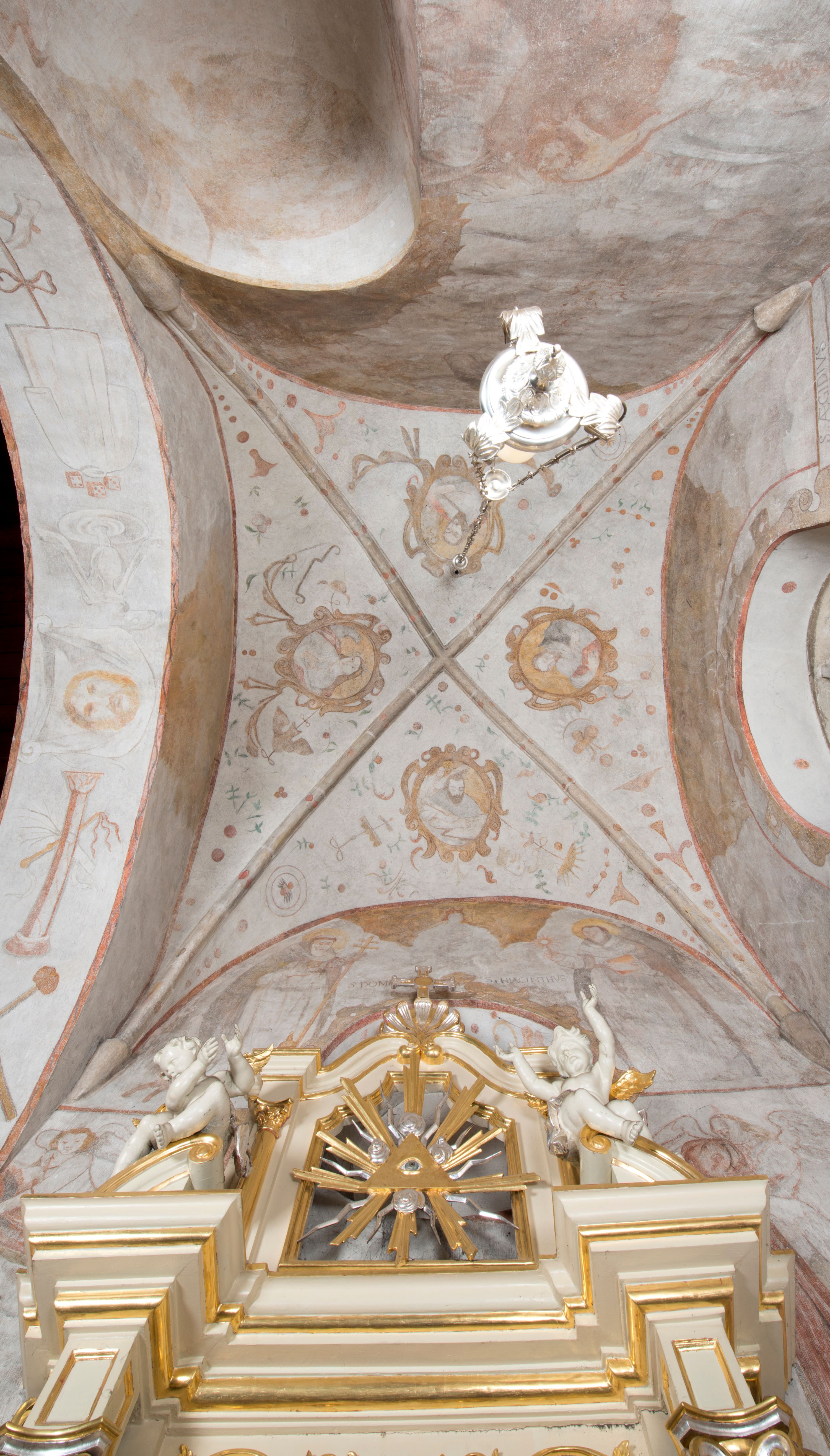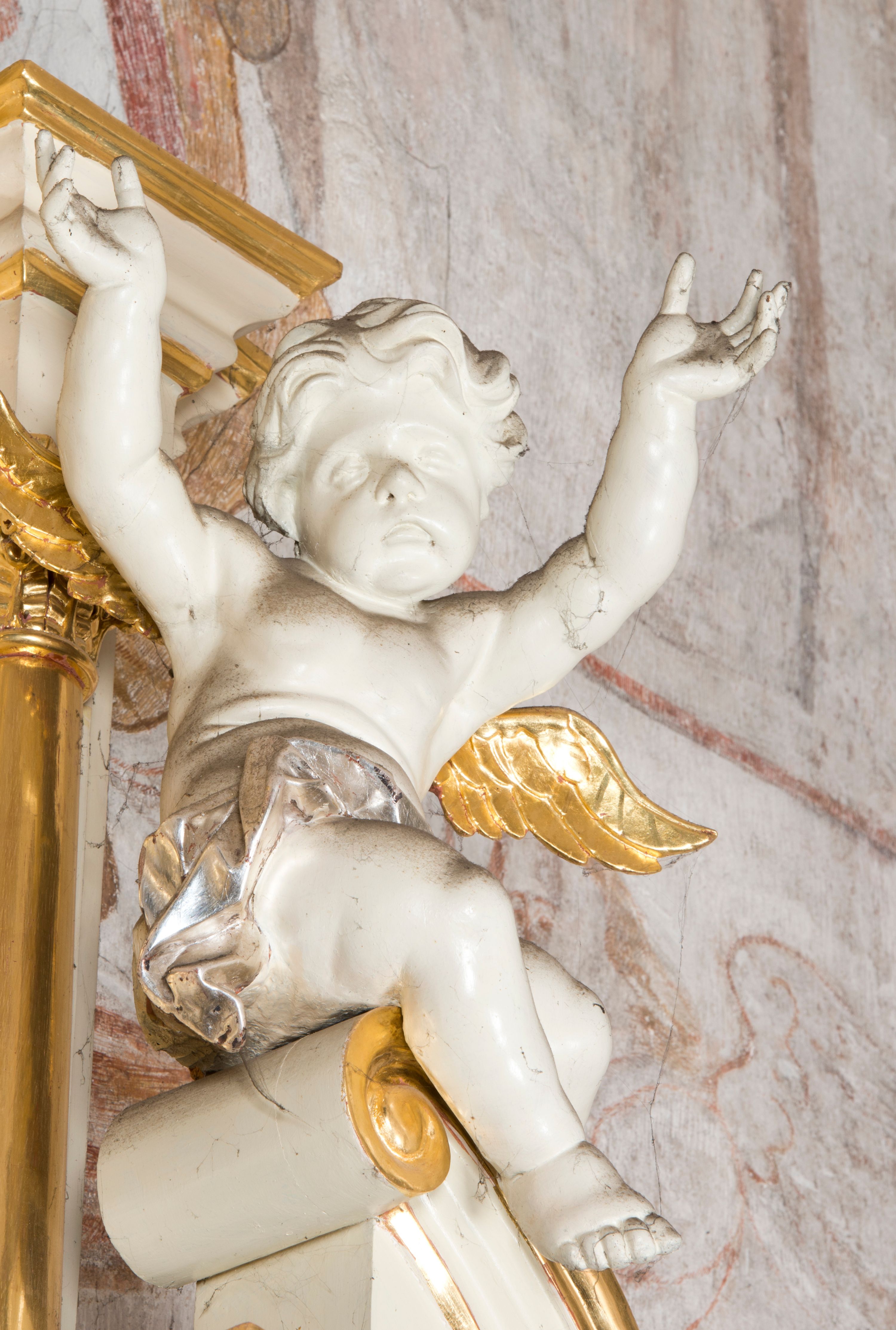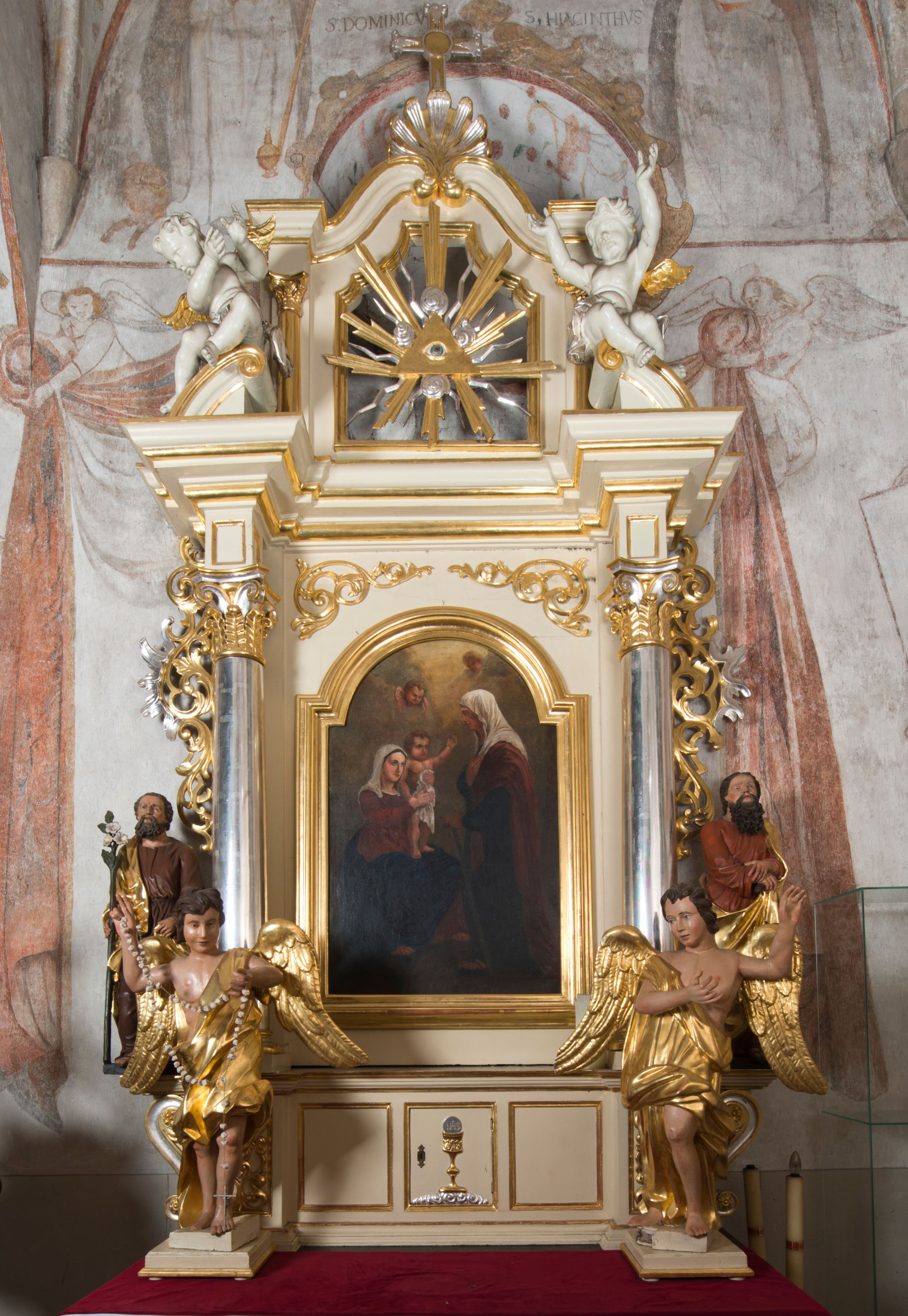 Zwieńczenie flankowane półkolumnami o kompozytowych kapitelach podtrzymujących profilowany gzyms przybierający kształt dwóch stykających się wolut, zwieńczony muszlą palmetową i krzyżem. W polu zwieńczenia ażurowy prześwit w kształcie prostokąta o uskokowo i ćwierćkoliście ściętych narożach, wypełniony okiem Opatrzności na tle promienistej glorii. Struktura polichromowana w kolorze jasnego beżu, ornamentyka oraz detale złocone i srebrzone.