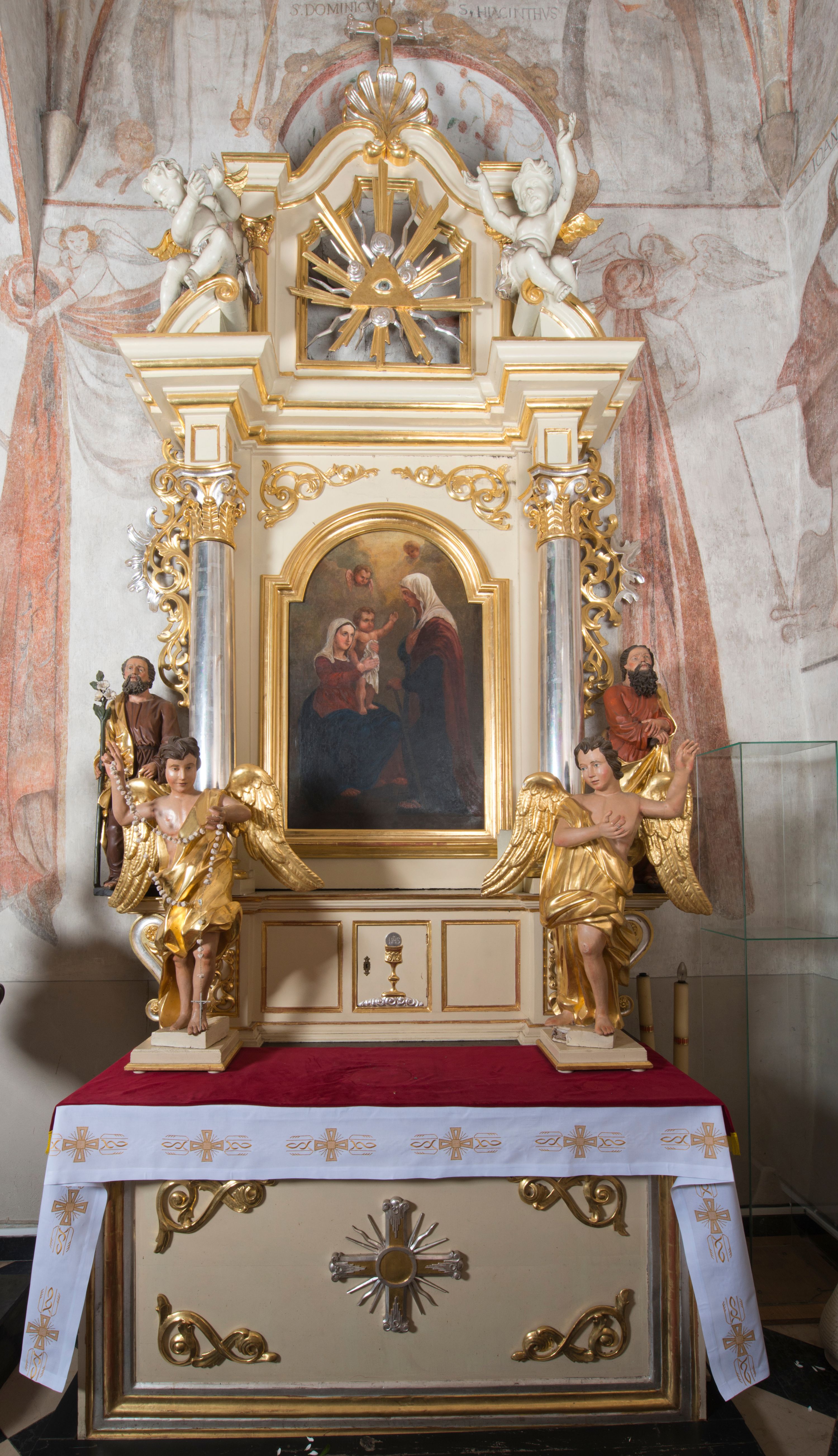 Ołtarz neobarokowy, wykonany przez nieznanego artystę około 1882 roku z fundacji Wincentego Mędrka (zm. 1887) i jego żony Kunegundy. Struktura opiera się na wzorach wykształconych w sztuce nowożytnej. Nastawa jest posadowiona na wysokim cokole, z polem głównym flankowanym podporami, z obrazem w pierwszej kondygnacji oraz glorią promienistą w zwieńczeniu. Wolnostojące figury aniołów powstały również w XIX wieku, jednak mogą pochodzić z innego kompletu ołtarzowego.