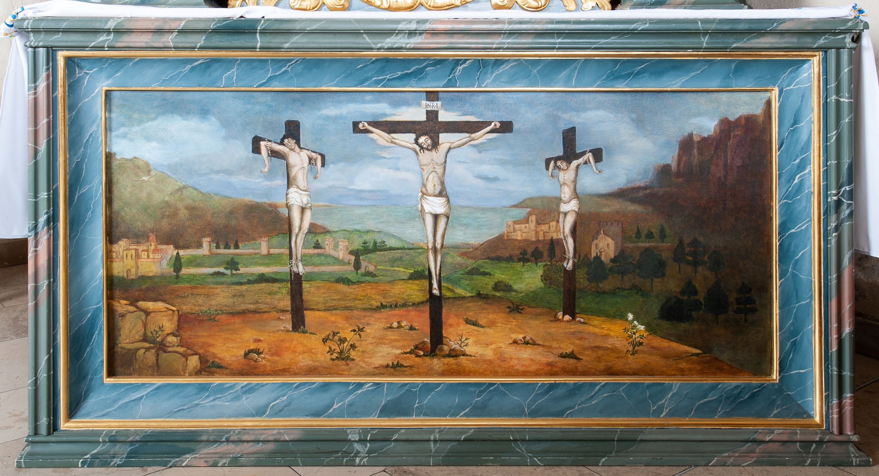 Ołtarz drewniany, prostopadłościenny z drewnianą mensą, w polu antepedium malowana na drewnie scena Ukrzyżowania. Na ołtarzu stoi tabliczka z kanonem w otoczeniu akantowych wolut tworzących podstawę dla pięciu lichtarzy utworzonych z ornamentu roślinnego (brak środkowego).