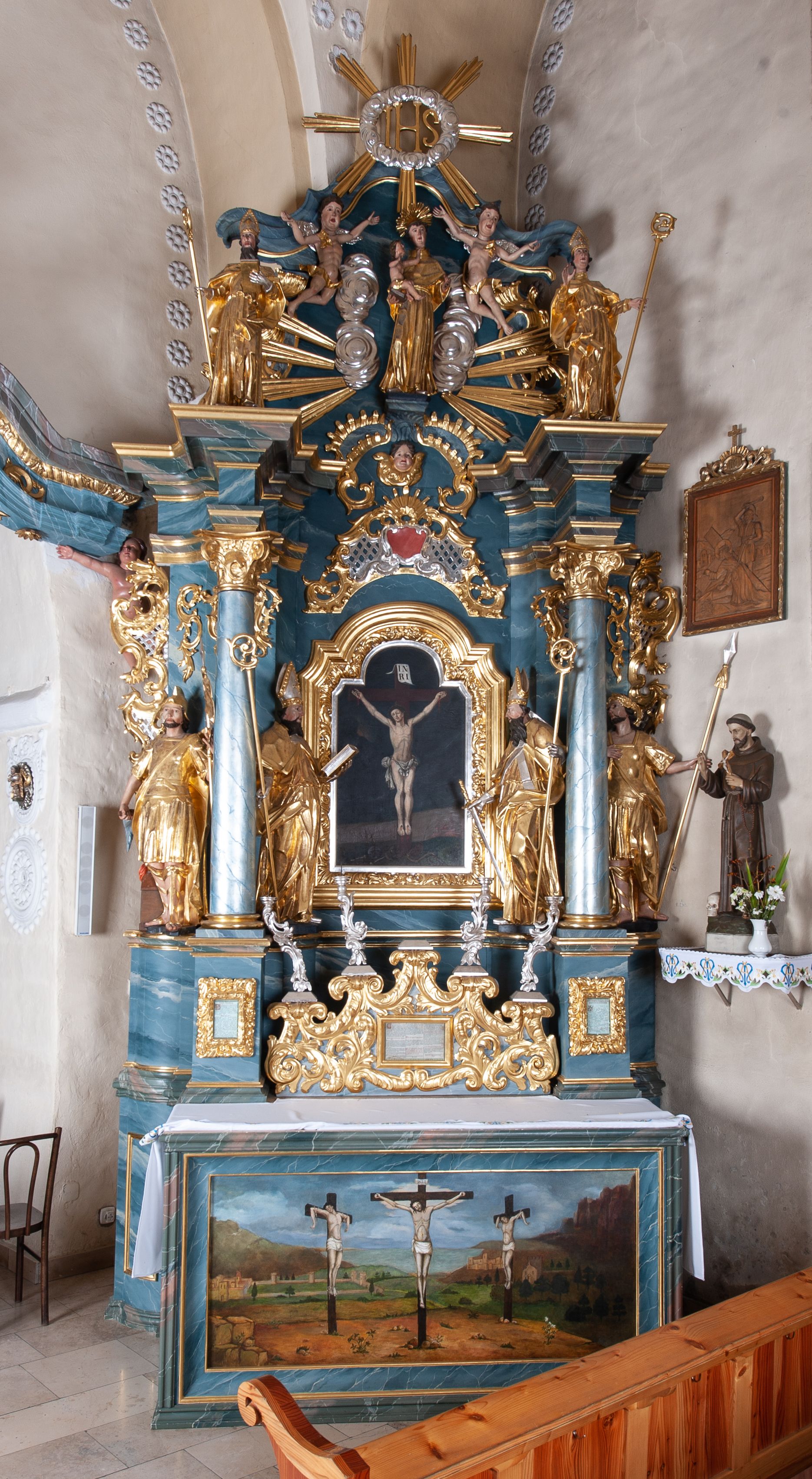Nastawa architektoniczna, jednoosiowa, jednokondygnacyjna ze zwieńczeniem, ustawiona na dwustrefowym cokole, ujęta parą półfilarów i stojącą przed nimi parą kolumn dźwigających pełne belkowanie, przerwane nad polem środkowym. Na cokołach kolumn kanony w ornamentalnych ramach. Kolumny flankują od zewnątrz figury św. Floriana i św. Longina, od wewnątrz św. Donata i św. Marcina. W polu głównym obraz Ukrzyżowania w formie stojącego prostokąta zamkniętego łukiem półkolistym nadwieszonym z uskokiem w profilowanej, dekorowanej ornamentem roślinnym ramie. Ponad nim kartusz ujęty ornamentem rocaille'owym i kratką regencyjną oraz uskrzydlona główka anielska flankowana rocaille'ami. Zwieńczenie w formie leżącego prostokąta ujętego spływami wolutowymi dekorowanymi rocaille'ami, zamkniętego fragmentem falującego gzymsu z monogramem IHS w otoku z obłoków w glorii promienistej. W polu rzeźbiarskie przedstawienie św. Antoniego Padewskiego flankowanego obłokami i wiązkami promieni oraz parą puttów. Na belkowaniu figury św. Walentego i św. Jana Chryzostoma. Ołtarz ujęty uszami utworzonymi z ornamentu rocaille'owego i kratki regencyjnej. Struktura polichromowana w sposób naśladujący marmoryzację w kolorze niebiesko-białym, profile i ornamentyka pozłacane.