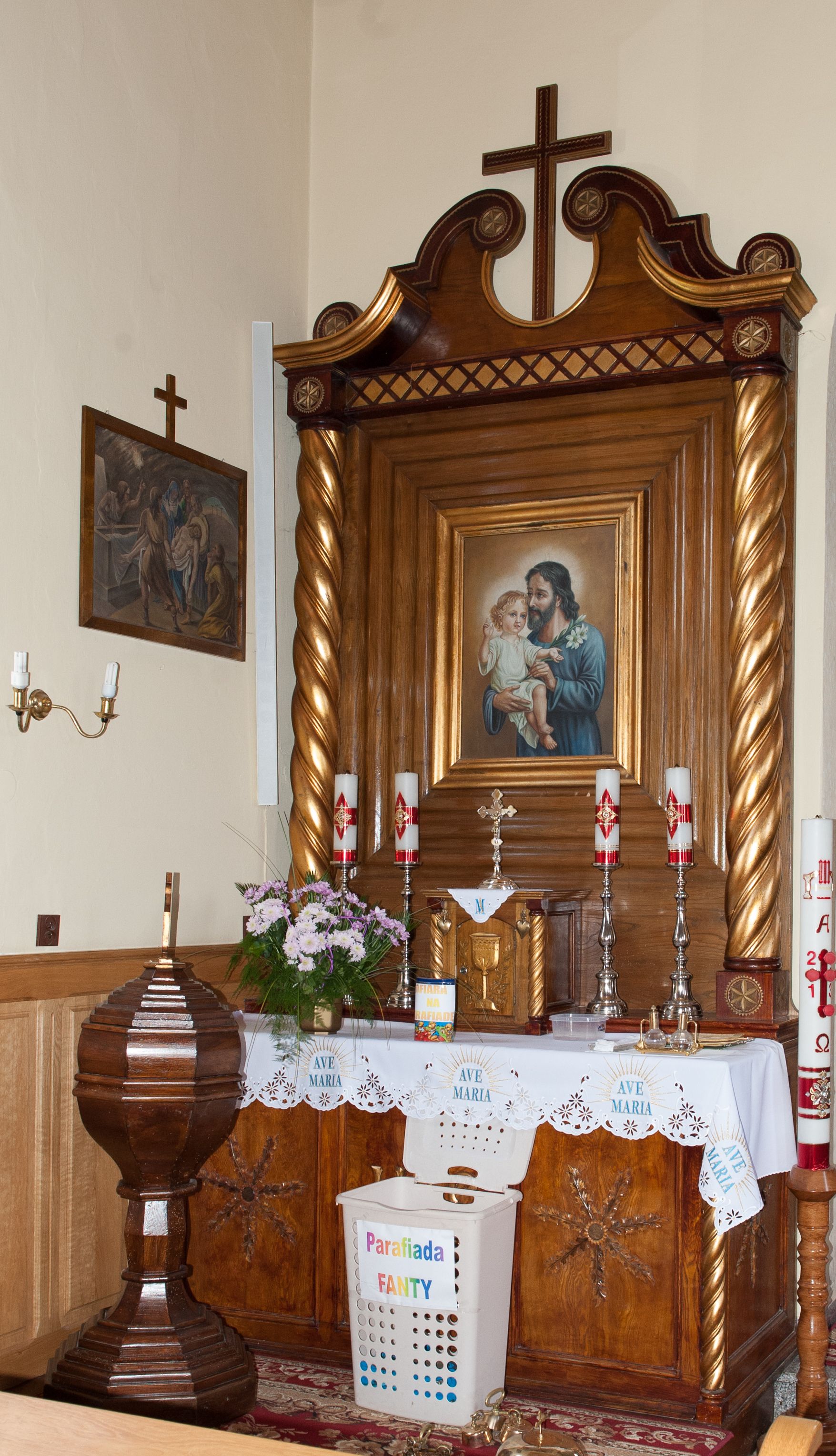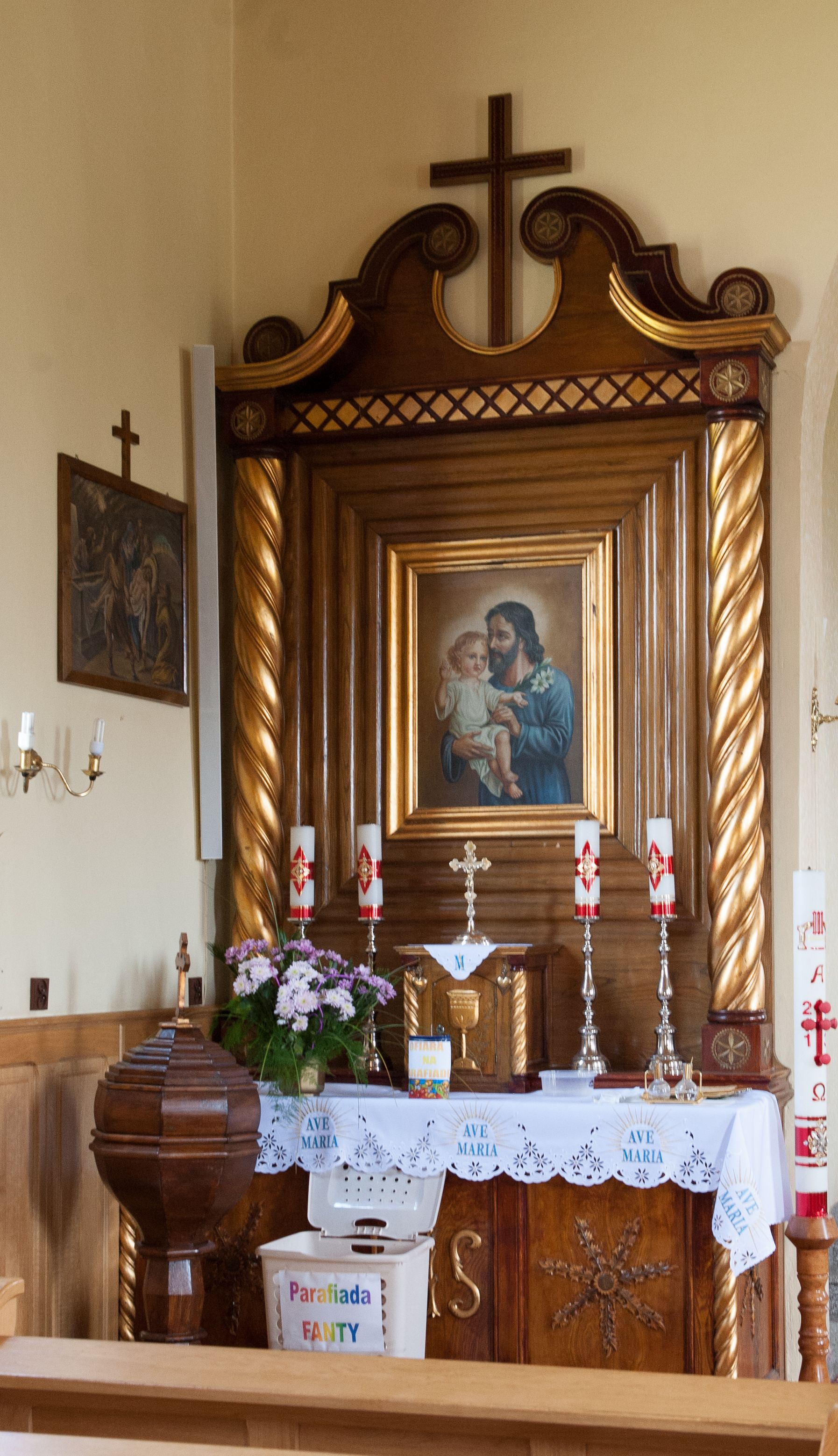 Nastawa ołtarzowa przyścienna, architektoniczna, jednokondygnacyjna ze zwieńczeniem. Mensa skrzyniowa, prostopadłościenna, ustawiona na jednym stopniu. Antepedium trójpolowe, obramione profilowanymi listwami, w narożach ujęte skręconymi, złoconymi kolumnami. W środkowym polu hierogram IHS, w bocznych motywy kwiatu dziewięćsiłu. Portatyl w formie kamiennej płytki. Tabernakulum w kształcie niewielkiej prostopadłościennej szafki, ujęte w narożach skręconymi kolumnami o kapitelach kostkowych, podtrzymujących profilowany gzyms. Od frontu drzwiczki w formie prostokąta zamkniętego łukiem odcinkowym, z rytą dekoracją roślinną i aplikowanym złoconym kielichem. Nastawa płaska, flankowana skręconymi, złoconymi kolumnami, ustawionymi na cokołach, dekorowanych rozetką. Kolumny zwieńczone kostkowymi kapitelami z rozetkami, nad którymi przerwany przyczółek. Nad polem środkowym zredukowane belkowanie, z fryzem zdobionym ukośną kratką. Zwieńczenie ujęte dwoma wolutami z uskokiem, dekorowanymi na krańcach rozetkami pomiędzy którymi półokrągłe wycięcie i łaciński krzyż. W polu głównym obraz św. Józefa z Dzieciątkiem w prostokątnej ramie, dookoła obwiedziony szerokim profilowaniem. Struktura bejcowana, pokryta lakierem, detale i kolumny złocone.