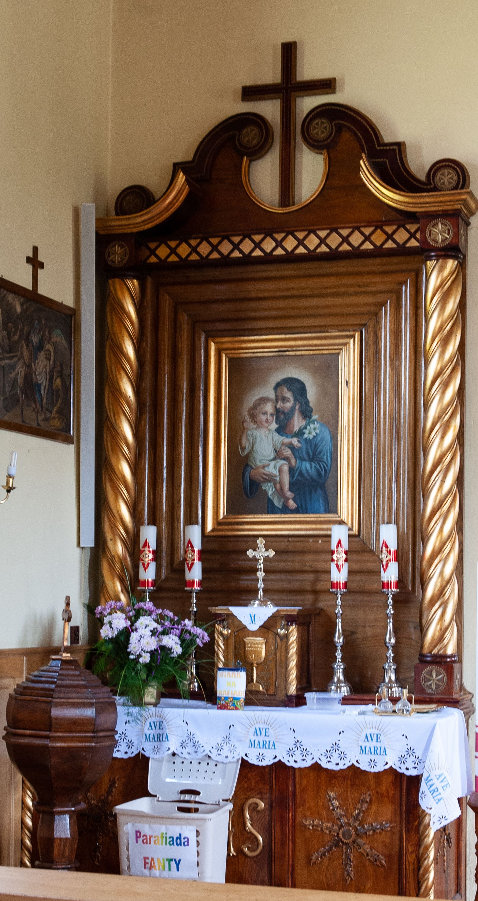 Ołtarz boczny powstał zapewne po wybudowaniu świątyni, czyli po 1939 roku. Jego struktura opiera się na wzorach wykształconych w sztuce nowożytnej. W polu głównym umieszczony jest obraz św. Józefa z Dzieciątkiem. Interesującym motywem w zdobieniu ołtarza są kwiaty dziewięćsiłu pospolitego, który występuje na terenie babiogórskim. Dziewięćsił jest góralską nazwą rośliny, która według miejscowych wierzeń ma w sobie dziewięć mocy, które dają człowiekowi dziewięć sił, a te z kolei są dziewięć razy silniejsze od innych ziół.