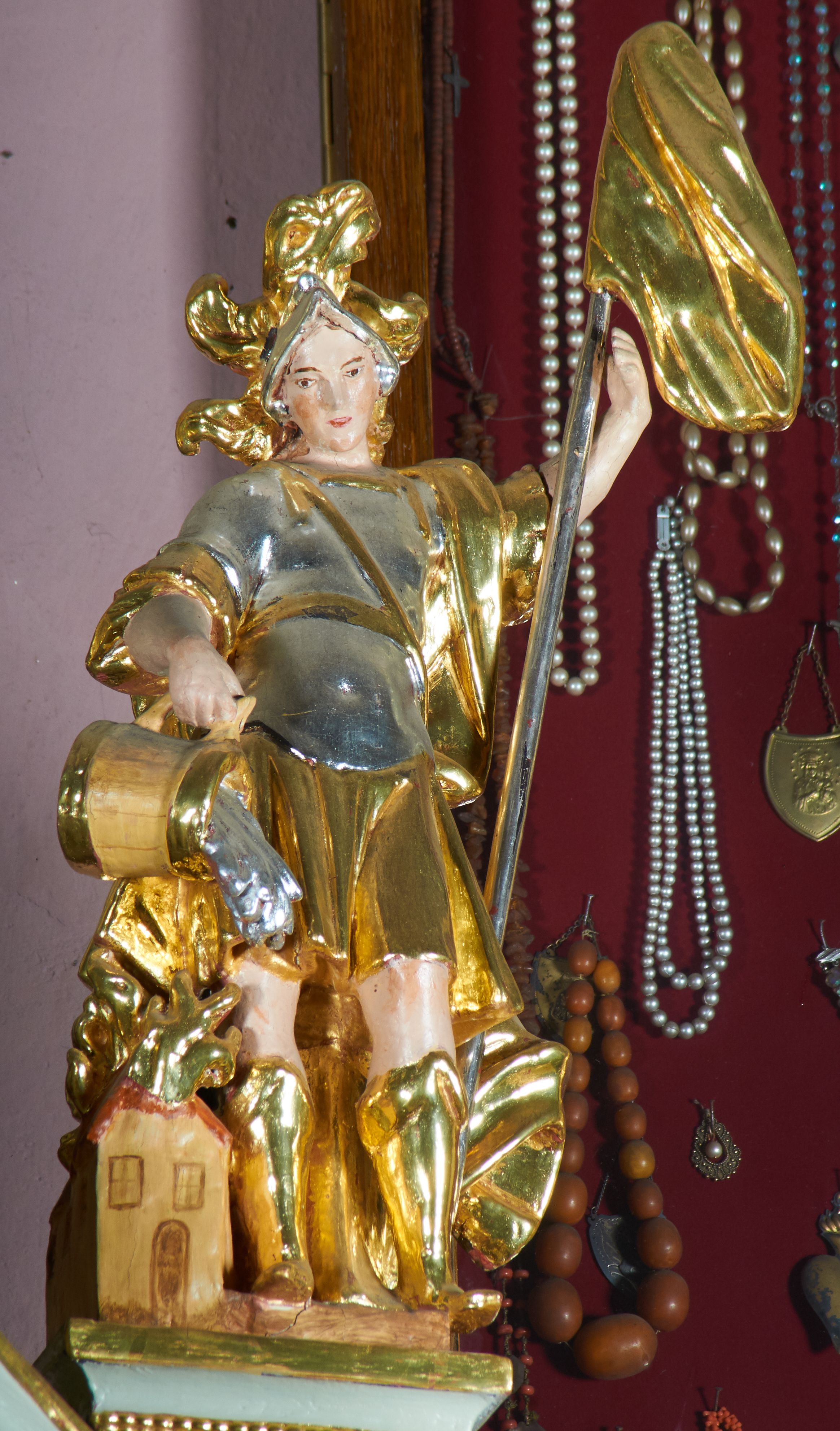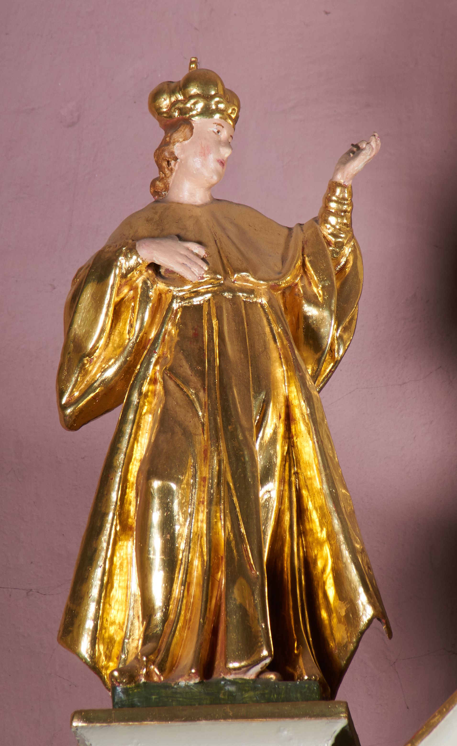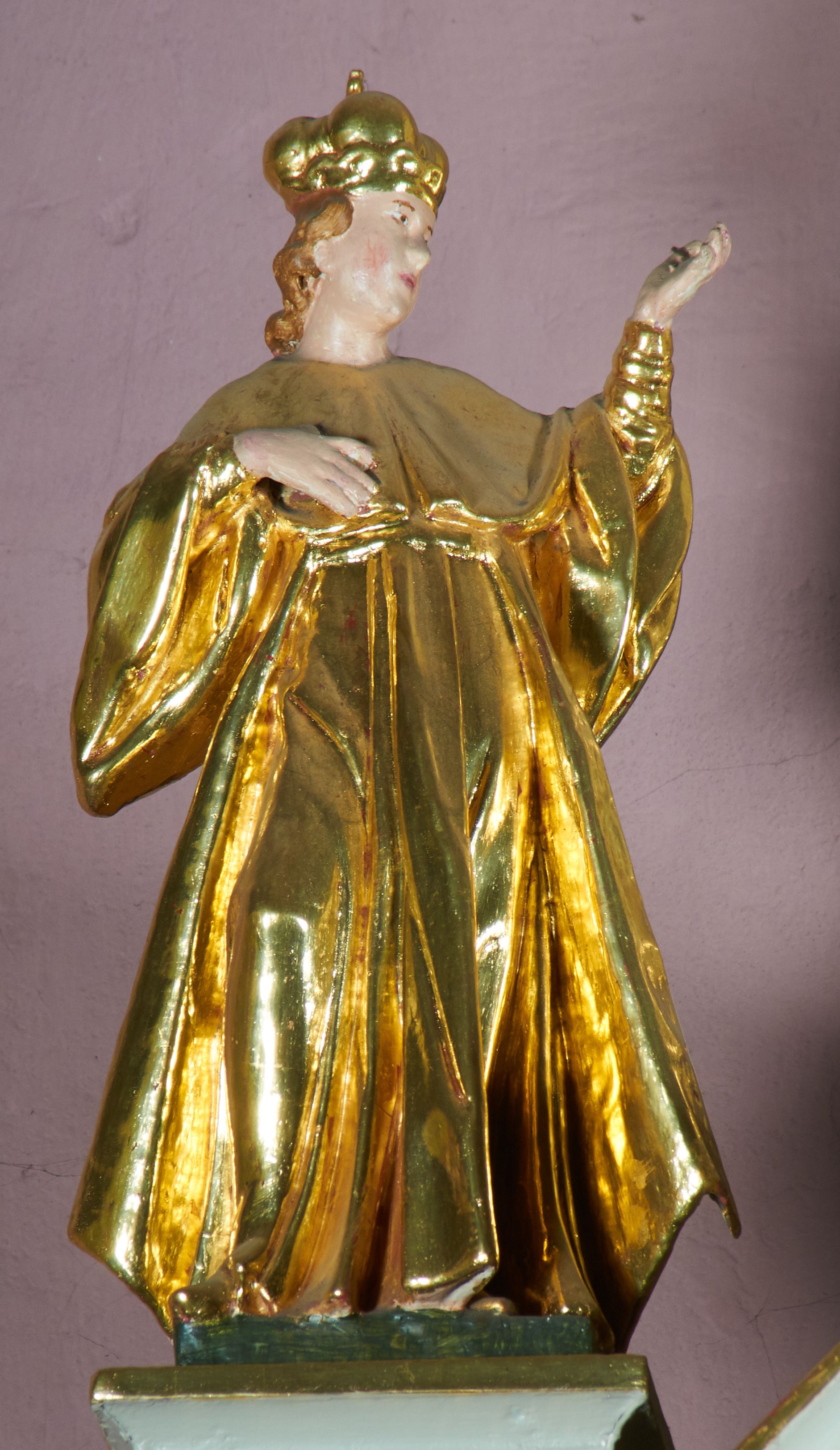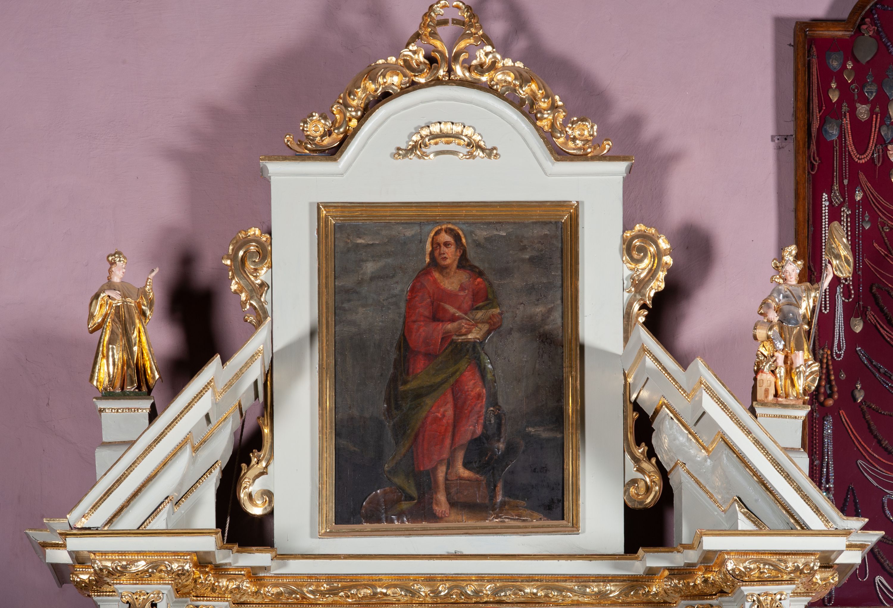 Struktura ołtarza polichromowana w kolorze bieli; rzeźby, detale, ornamentyka, profile i kolumny pozłacane.