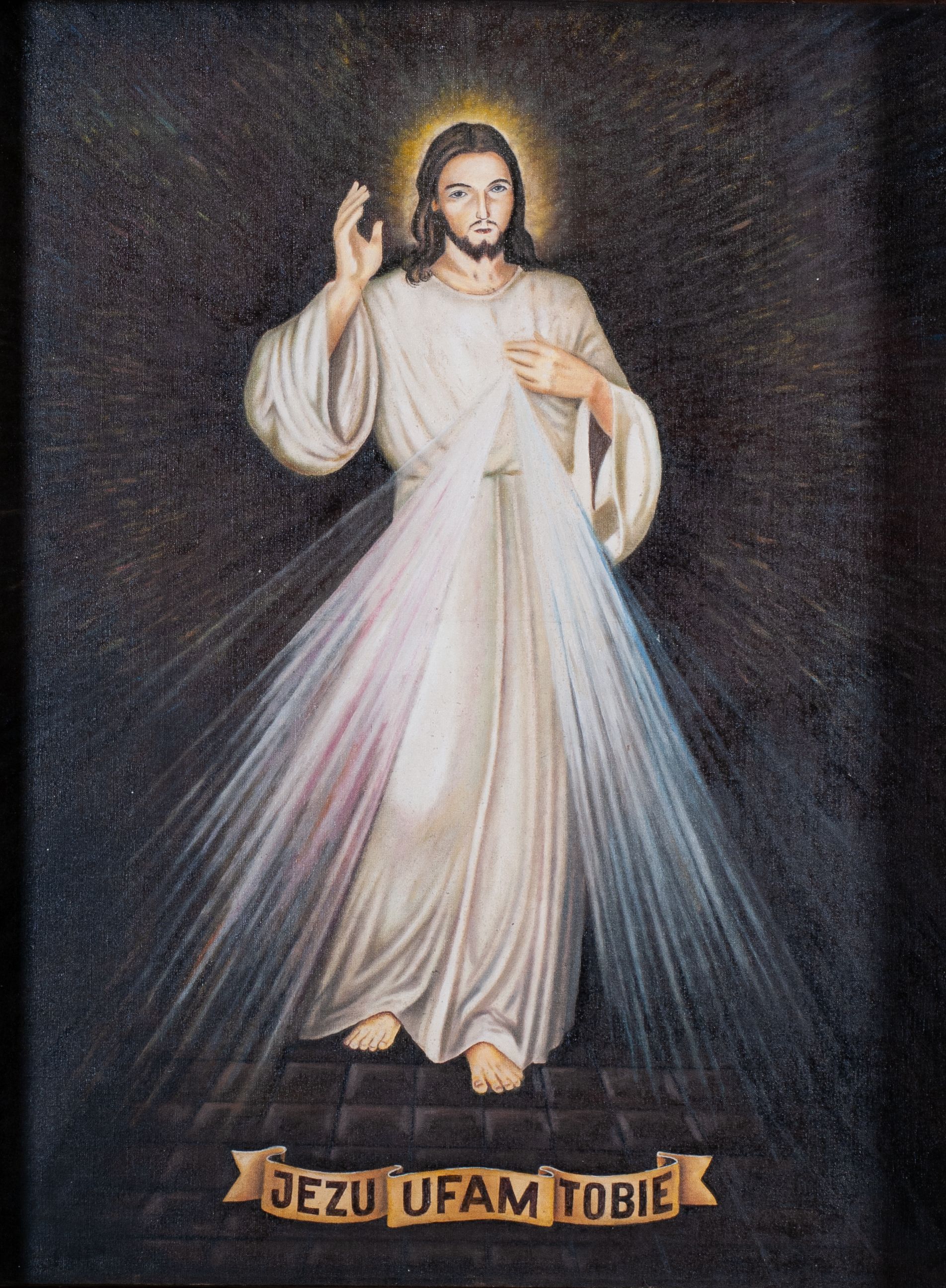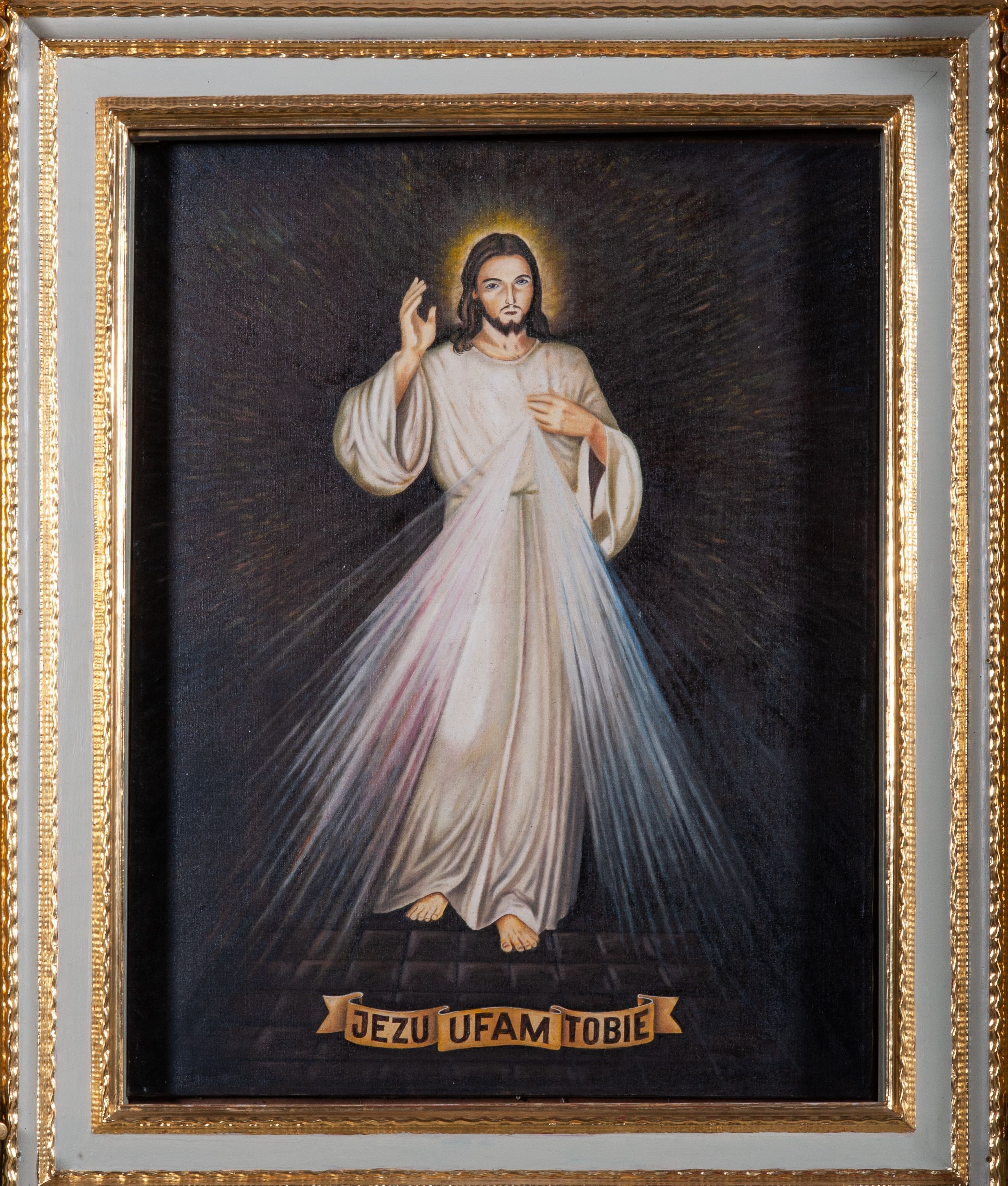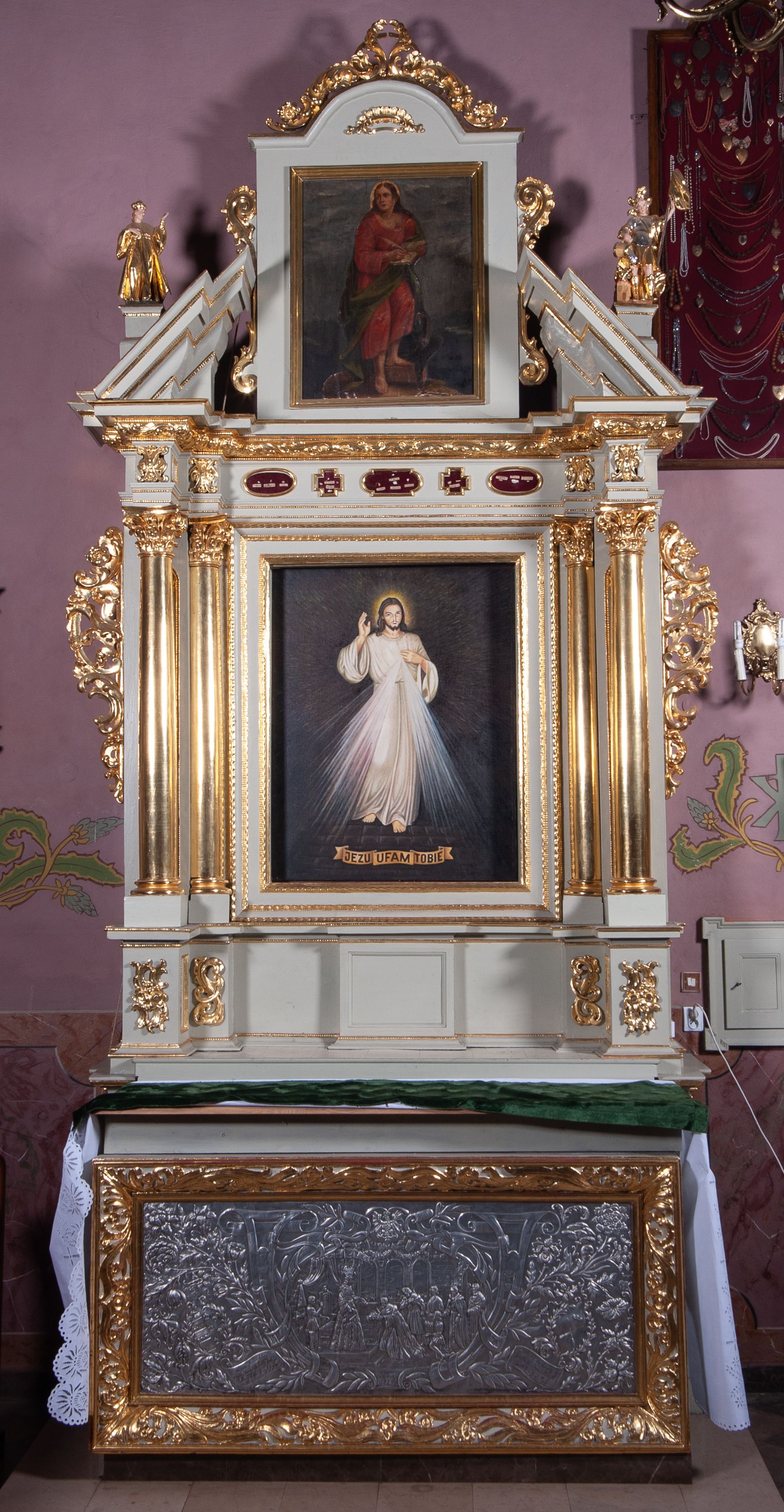 Ołtarz architektoniczny, jednoosiowy, jednokondygnacyjny ze zwieńczeniem, ustawiony na dwustrefowym cokole. Retabulum ujęte dwiema parami kolumn, z których skrajne wysunięte do przodu. Podpory o kapitelach kompozytowych, dźwigają pełne belkowanie wyłamane na ich osi oraz przerwany, trójkątny przyczółek z ustawionymi za nim figurami: po lewej św. Kazimierza, po prawej św. Floriana. W polu środkowym obraz z przedstawieniem „Jezu Ufam Tobie” oraz „Święty Jan Kanty” na zasuwie. Obrazy ujęte w profilowane, proste ramy w kształcie stojącego prostokąta. Ołtarz flankowany uszami utworzonymi z rocaille'u. Zwieńczenie w formie stojącego prostokąta, zamkniętego łukiem nadwieszonym, ujętego po bokach spływami wolutowymi. U szczytu zdobione rzeźbioną, dekoracją rocaille'ową. W polu w kształcie stojącego prostokąta obraz „Święty Jan Ewangelista”. W partii belkowania pięć relikwiarzy ułożonych w rzędzie, w różnych kształtach: pierwszy znajdujący się pośrodku w postaci prostokątnej płyciny o bokach zamkniętych łukiem nadwieszonym, dwa umieszczone po bokach w formie krzyża greckiego i dwa na skrajach w kształcie spłaszczonego owalu. W relikwiarzach na czerwonym materiale umieszczone relikwie świętych, opisane karteczkami: „S(anctae) Gertrudis.”, „S(anctae) Victoris. M(artyris)”, „S(anctae) Maximae M(artyris)”, „3 Sanctor-”, „S(ancti) Victoris M(artyris)”, „S(anctae) Marcella”, „S(ancta) Prisca (?)”. Część podpisów nieczytelna.