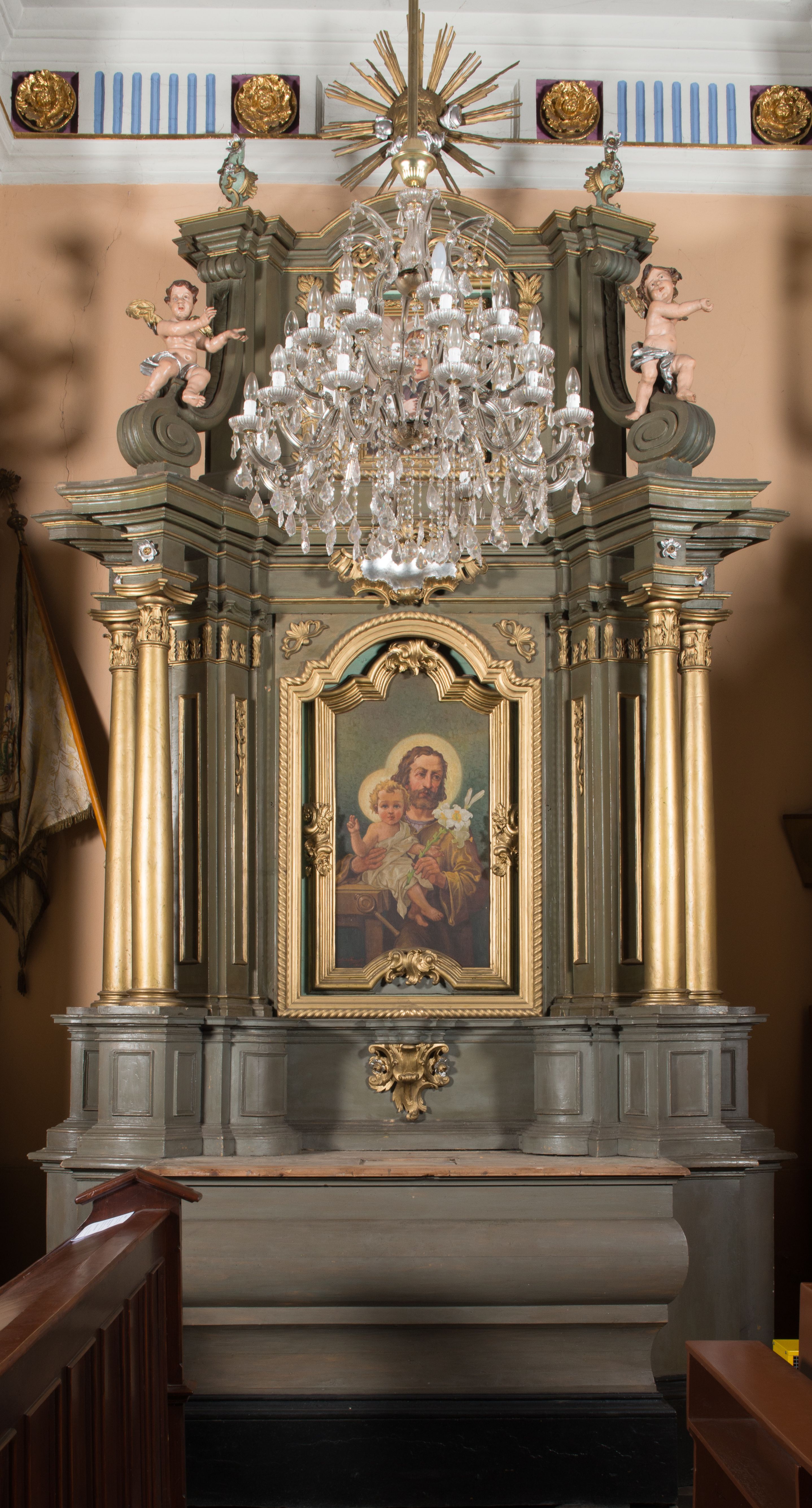 Nastawa architektoniczna, jednokondygnacyjna, jednoosiowa ze zwieńczeniem. Ołtarz sarkofagowy, wybrzuszony, z drewnianą mensą i drewnianym portatylem integralnie zespolony z cokołem retabulum. Nastawa wsparta na ukośnie ustawionych postumentach z filarami i stojącymi przed nimi oraz z boku wolnostojącymi kolumnami z głowicami akantowymi, podtrzymującymi wspólnie, wznoszące się nad nimi belkowanie. Zwieńczenie ujęte ukośnie posadowionymi spływami wolutowymi podtrzymującymi gzyms wyłamujący się pośrodku łukowato. W środku nastawy głęboka wnęka w profilowanym obramieniu z motywem skręconego sznura, prostokątna o ściętych górą narożach, zamknięta łukiem półkolistym nadwieszonym. W niej obraz przedstawiający św. Józefa z Dzieciątkiem, w ramie powielającej wykrój wnęki, z drobnymi rocaille'ami na bokach. W zwieńczeniu wnęka prostokątna w profilowanym obramieniu, z motywem skręconego sznura, ujęta po bokach kłosami zbóż, a zwieńczona motywem akantu. W niej obraz prostokątny obraz z wyobrażeniem św. Stanisława Kostki. Na spływach wolutowych uskrzydlone nagie aniołki z przepaską na biodrach. Nad wnęką w środkowej części ołtarza wypukły kartusz ujęty rocaile'm, drobne rocaille nad wnęką i na filarach, w partii cokołu utworzona z motywu rocaille'owego konsola. Kolorystyka struktury w odcieniu zieleni wpadającej w szarość, partie detalu architektonicznego i ornamentyka złocone.
