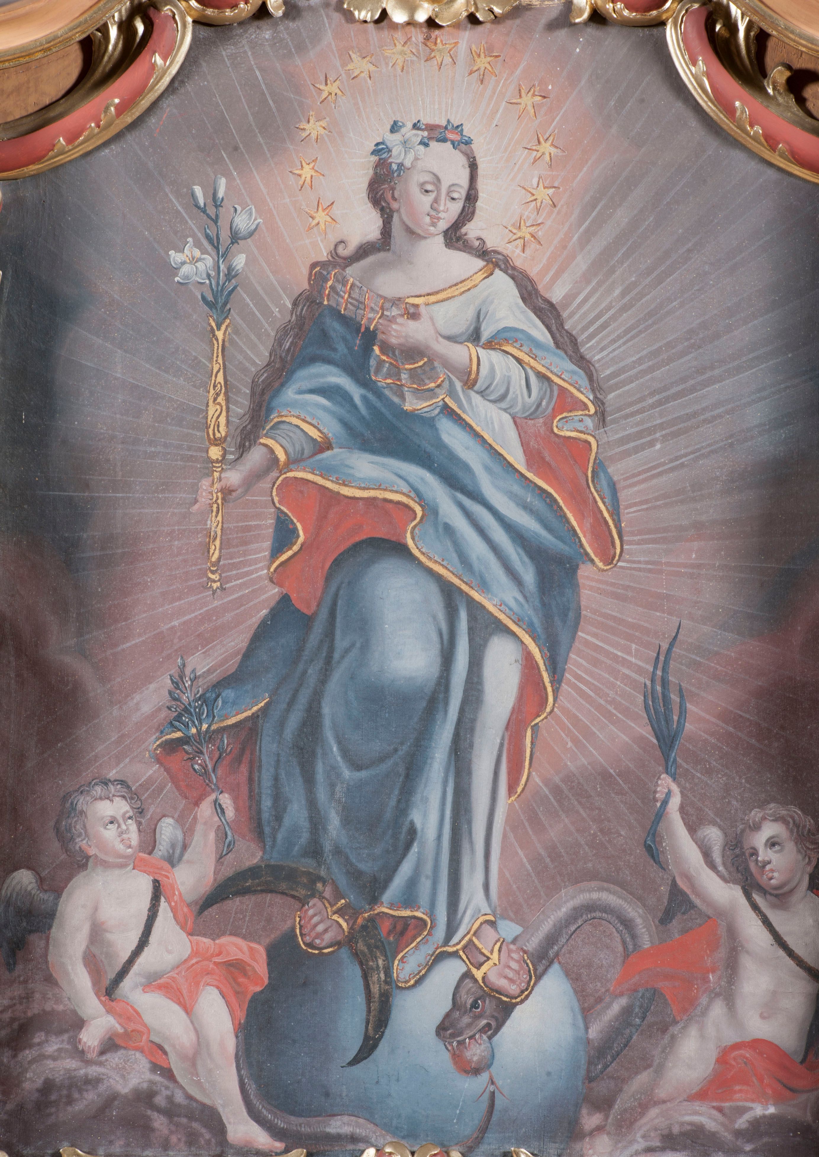 Ołtarz jednoosiowy, jednokondygnacyjny ze zwieńczeniem. Mensa sarkofagowa. Nastawa osadzona na cokole, flankowana dwoma spływami wolutowymi, obficie dekorowanymi rocaille'ami. W polu głównym, w płytkiej niszy w kształcie stojącego prostokąta zamkniętego łukiem wklęsło-wypukłym z uskokami obraz Matki Boskiej Niepokalanie Poczętej. W dolnej części kondygnacji prostokątne pole utworzone z rocaille'i. Zwieńczenie o wielkości kondygnacji w formie promienistej glorii, z gołębicą Ducha Świętego w polu, wokół której uskrzydlone główki aniołków na tle obłoków oraz rocaille'e spięte u góry koroną w typie otwartym. Struktura polichromowana na kolor jasno i ciemnobeżowy, detale, ornamentyka i profilowania złocone. Taki sam ornament zdobi narożniki mensy, ryzality w cokole, ujmuje również pole obrazowe na jego dłuższych bokach oraz w zwieńczeniu pola.