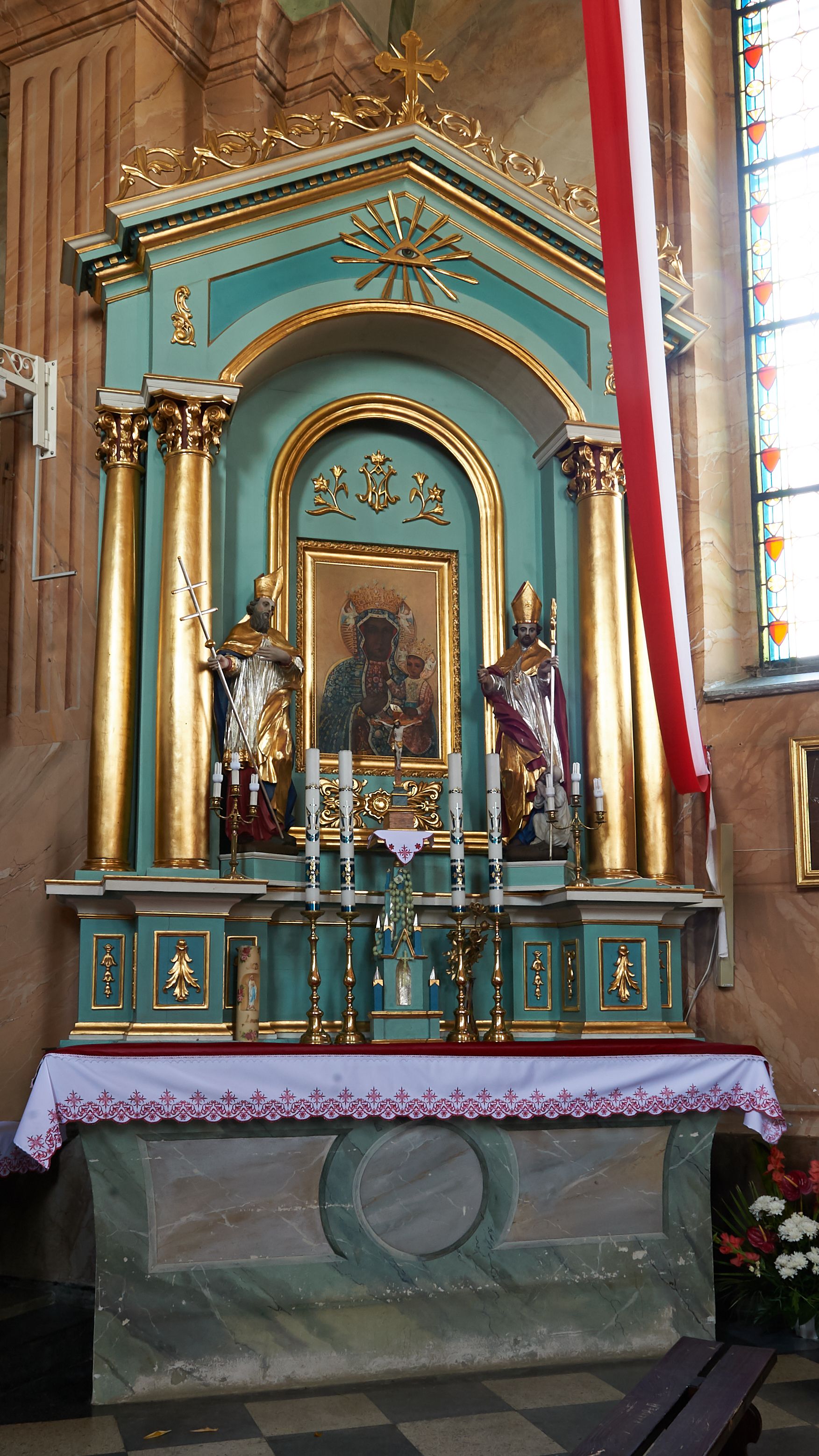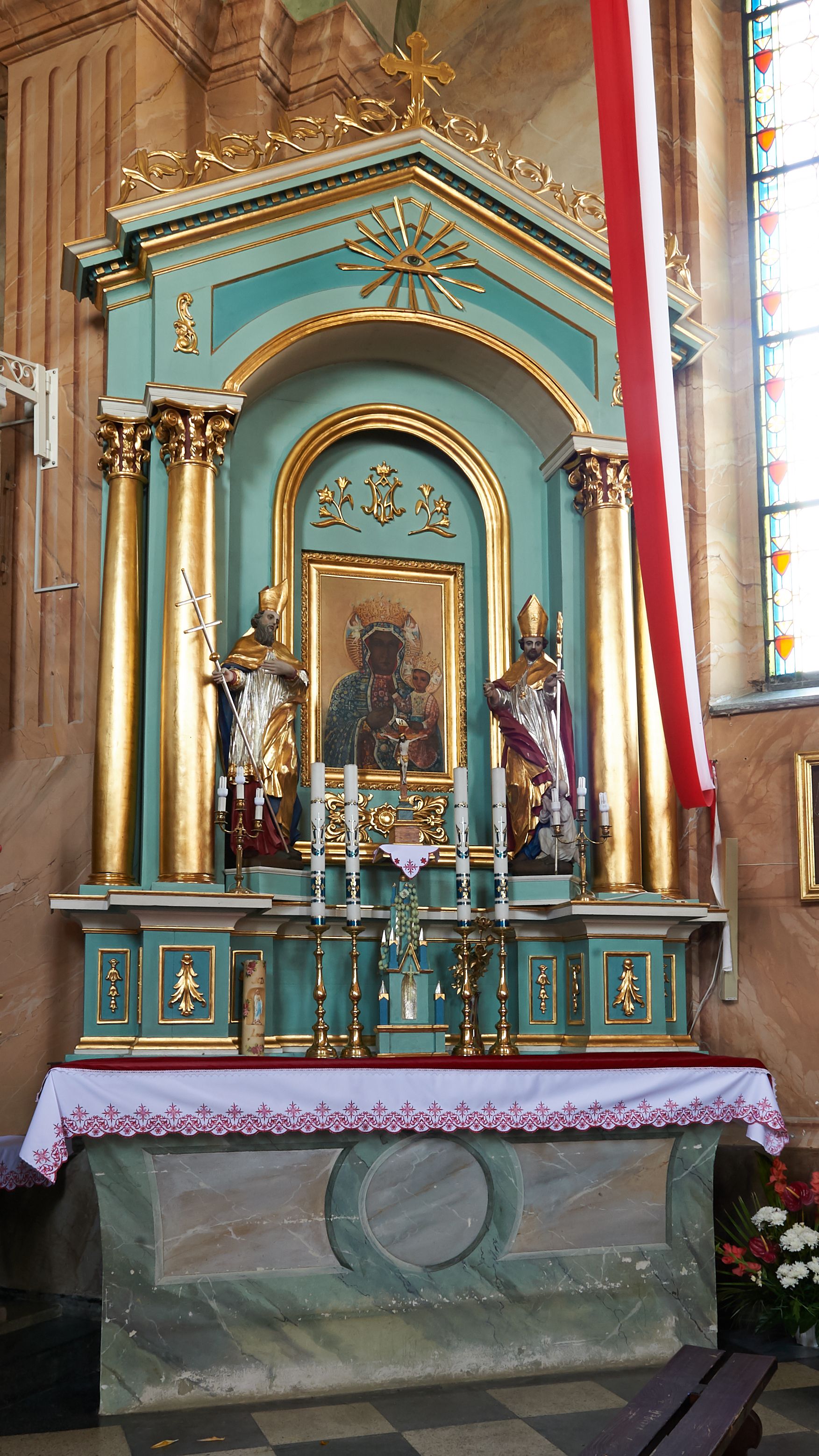 Nastawa ołtarzowa architektoniczna, jednoosiowa, jednokondygnacyjna, na cokole z wyodrębnionymi zwielokrotnionymi prostopadłościanami. Ołtarz murowany, prostopadłościenny, rozszerzający się ku górze. Mensa kamienna; antepedium marmoryzowane z iluzjonistycznie malowaną płyciną z medalionem. Cokół dekorowany płycinami z ornamentem roślinnym i kampanulami. Nastawa ujęta dwiema parami kolumn w układzie schodkowym. Wewnętrzna para podtrzymuje łuk odcinkowy, wszystkie podpory zaś trójkątny szczyt zamknięty profilowanym gzymsem z kostkowaniem, dekorowany wicią roślinną, całość zwieńczona krzyżem. Pole środkowe tworzy nisza w formie stojącego prostokąta zamkniętego łukiem odcinkowym, wewnątrz niej mniejsza płycina o kształcie stojącego prostokąta zamkniętego łukiem półkolistym, ujęta profilowaną ramą, z mniejszym obrazem Matki Boskiej Częstochowskiej, w osobnej, profilowanej ramie. Nad obrazem monogram maryjny flankowany gałązkami lilii, pod nim ornament roślinny. Po bokach wizerunku znajdują się figury św. Stanisława i św. Wojciecha ustawione na niskich cokołach. W przestrzeni szczytu wnęka o fantazyjnym kształcie z okiem Opatrzności w glorii promienistej. Struktura polichromowana w kolorze jasnozielonym, płyciny na zielono; ornamentyka, profile i kolumny złocone.