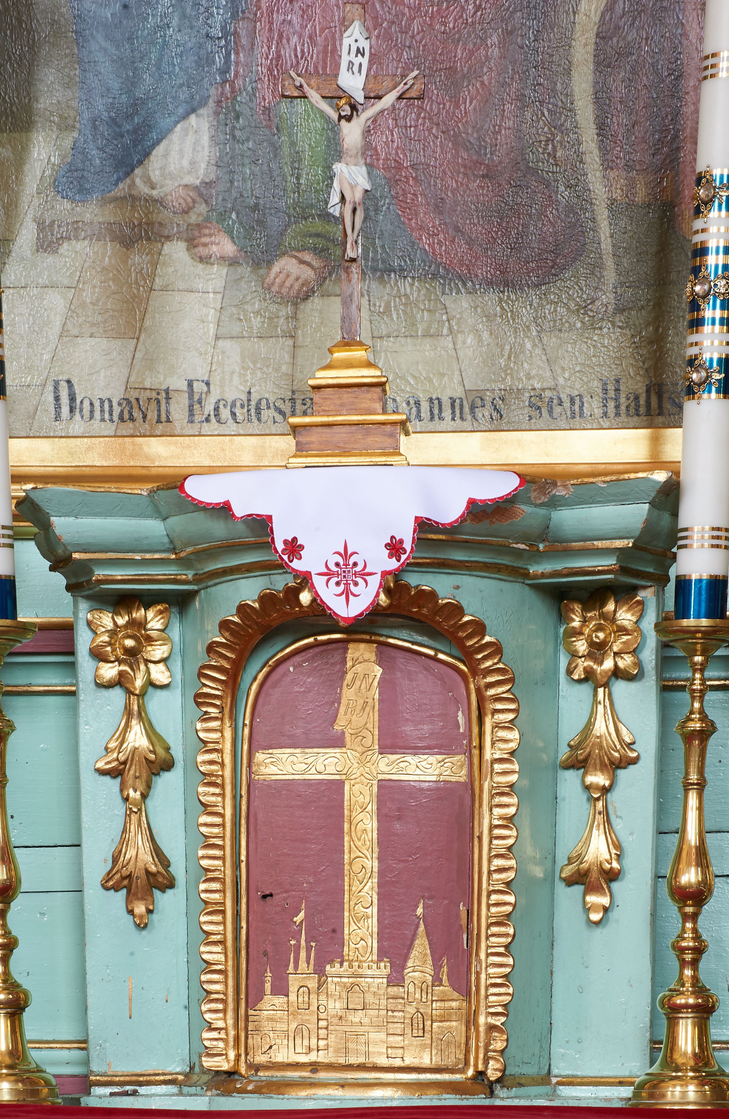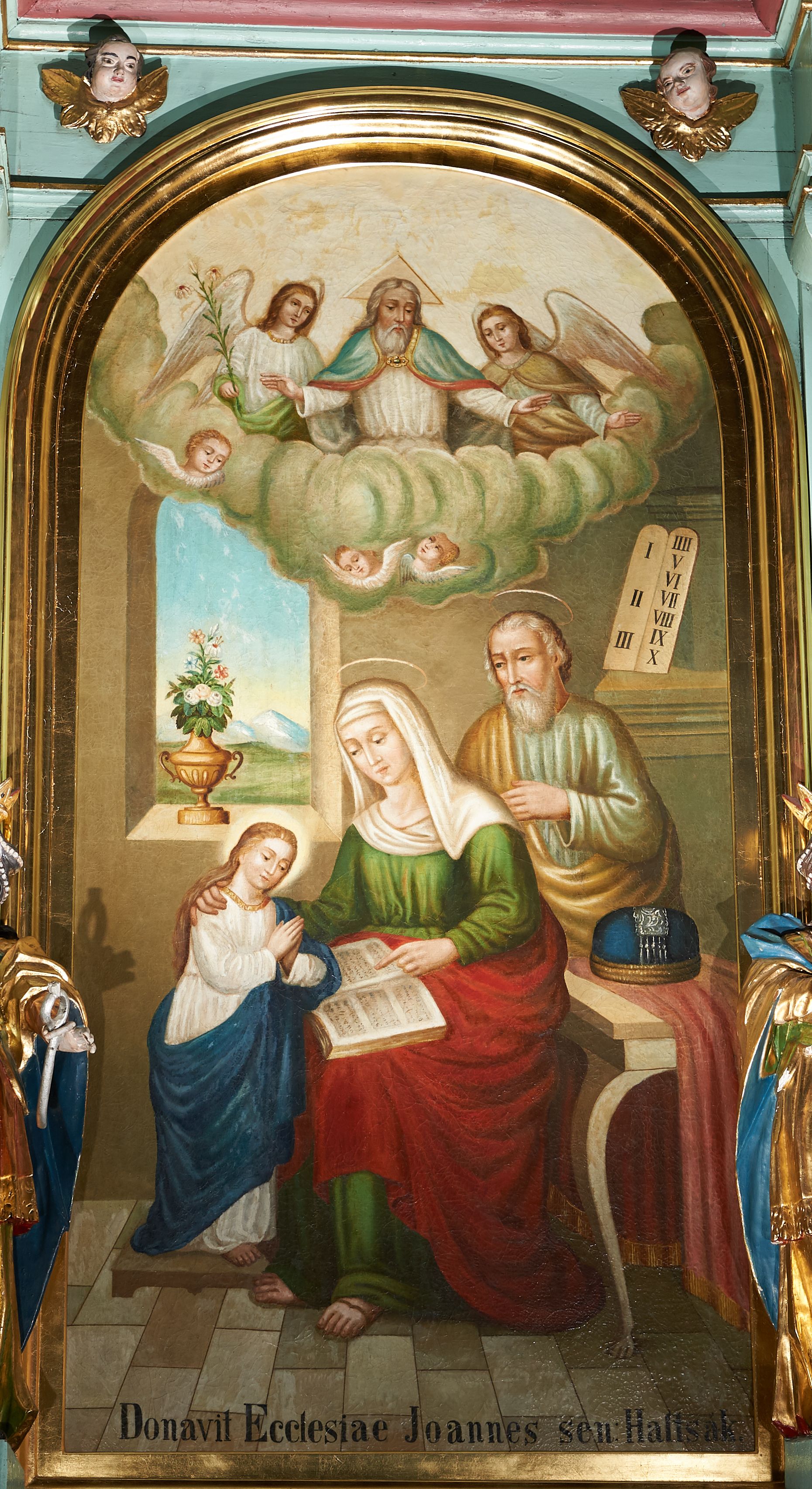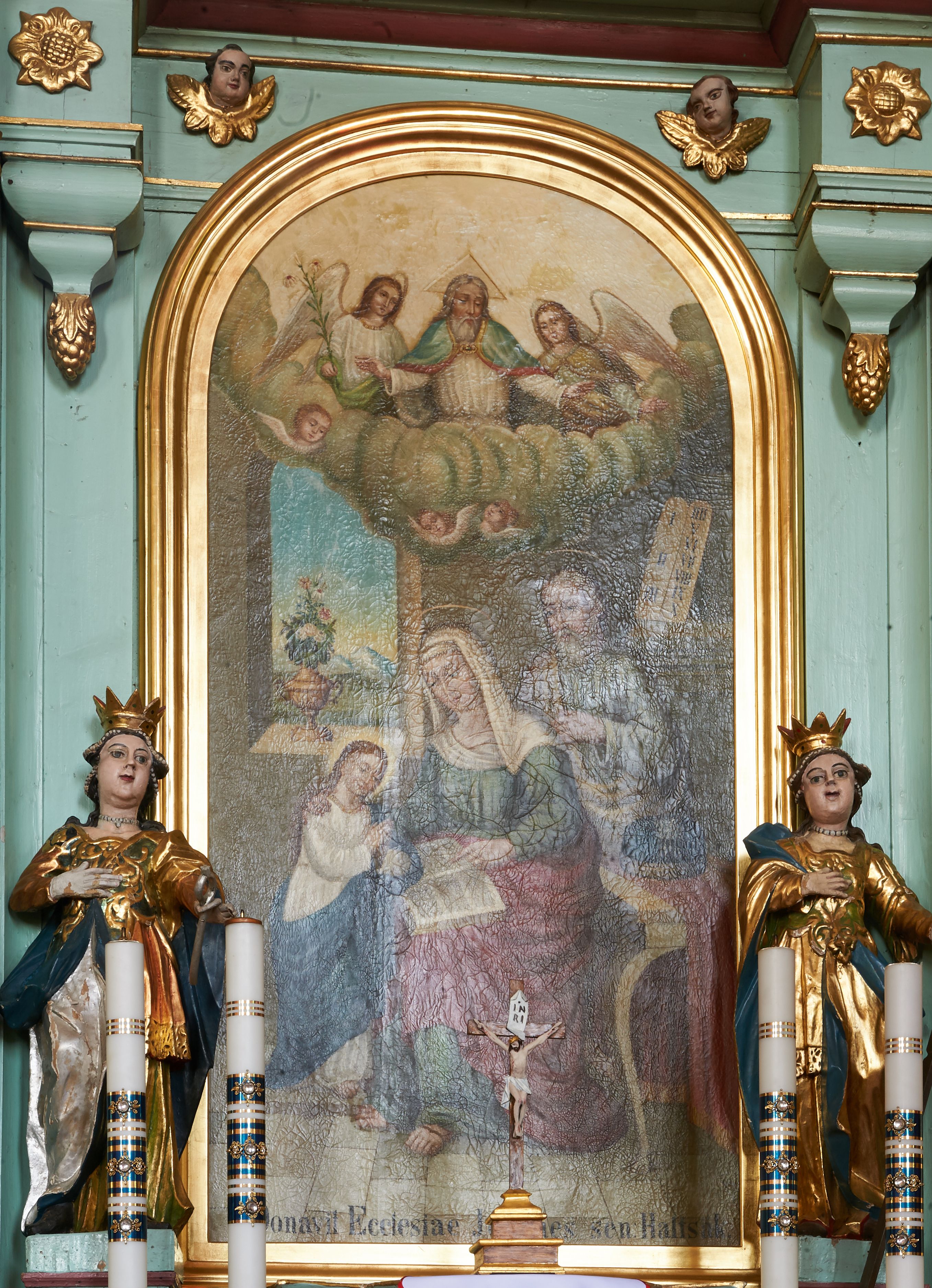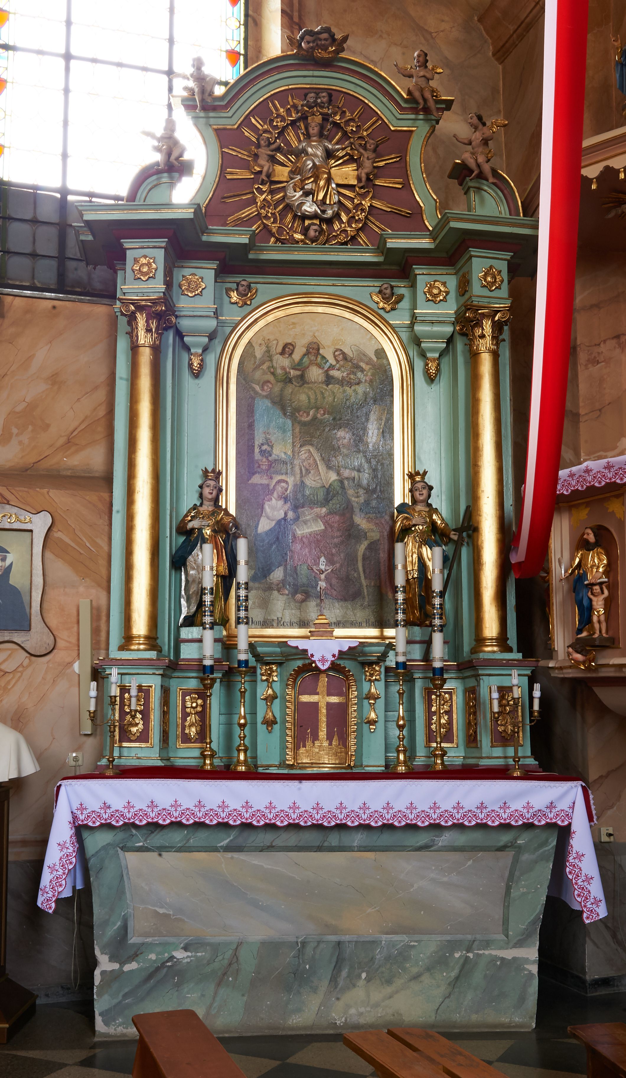 Tabernakulum w formie prostopadłościennej skrzynki, o wypukłym froncie, zwieńczonej profilowanym gzymsem. Drzwiczki w kształcie stojącego prostokąta zamkniętego półkoliście, ujęte obwódką utworzoną z liści, dekorowane płaskorzeźbionym wizerunkiem krzyża i panoramą miasta; flankowane roślinnymi zwisami. Retabulum ujęte parą kolumn o kapitelach korynckich dźwigających pełne belkowanie, wyłamane na ich osi. Po wewnętrznej stronie z wyłamanymi impostami podtrzymywanymi na wspornikach zakończonych szyszkami. Belkowanie o architrawie i fryzie przerwanymi polem środkowym, z silnie wysuniętym gzymsem i fragmentami półkolistego, przerwanego przyczółka. Fryz dekorowany rozetami. Pole środkowe w formie wnęki o kształcie stojącego prostokąta zamkniętego łukiem półkolistym, ujętej profilowaną ramą, z obrazem Nauczania Marii. Obraz flankują figury św. Apolonii i św. Heleny. Zwieńczenie w formie zbliżonej do trapezu, o wklęsłych bokach, zamkniętego łukiem segmentowym nadwieszonym. W polu płycina o tym samym kształcie z rzeźbiarskim przedstawieniem Marii siedzącej na obłoku, na tle krzyża, ujętej wieńcem roślinnym z aniołkami i uskrzydlonymi główkami anielskimi, w glorii promienistej. Gzyms i zwieńczenie z siedzącymi puttami oraz uskrzydlonymi główkami anielskimi. Struktura polichromowana w kolorze jasnozielonym, z czerwonymi detalami, złoconymi kolumnami, ornamentyką i profilami.
