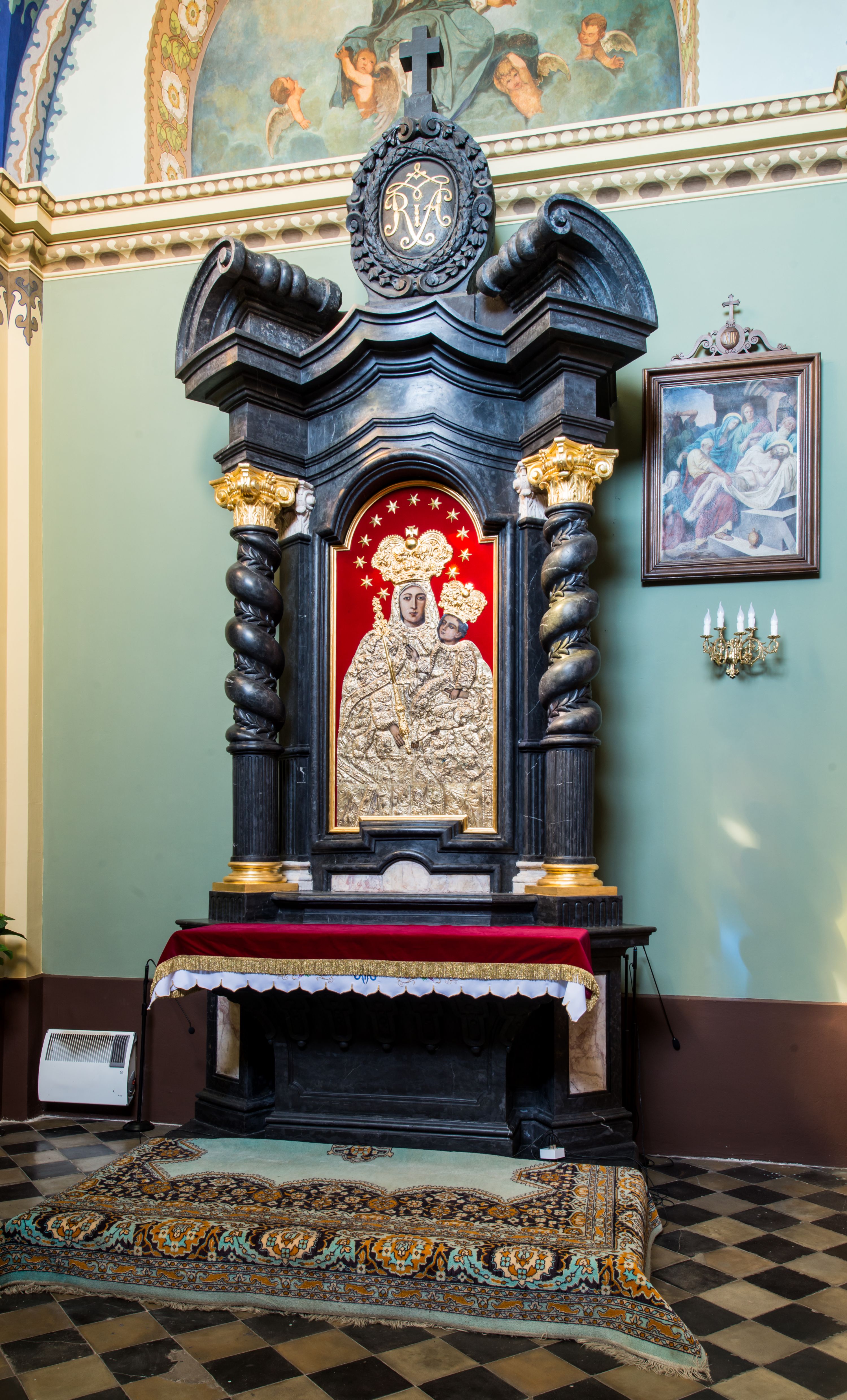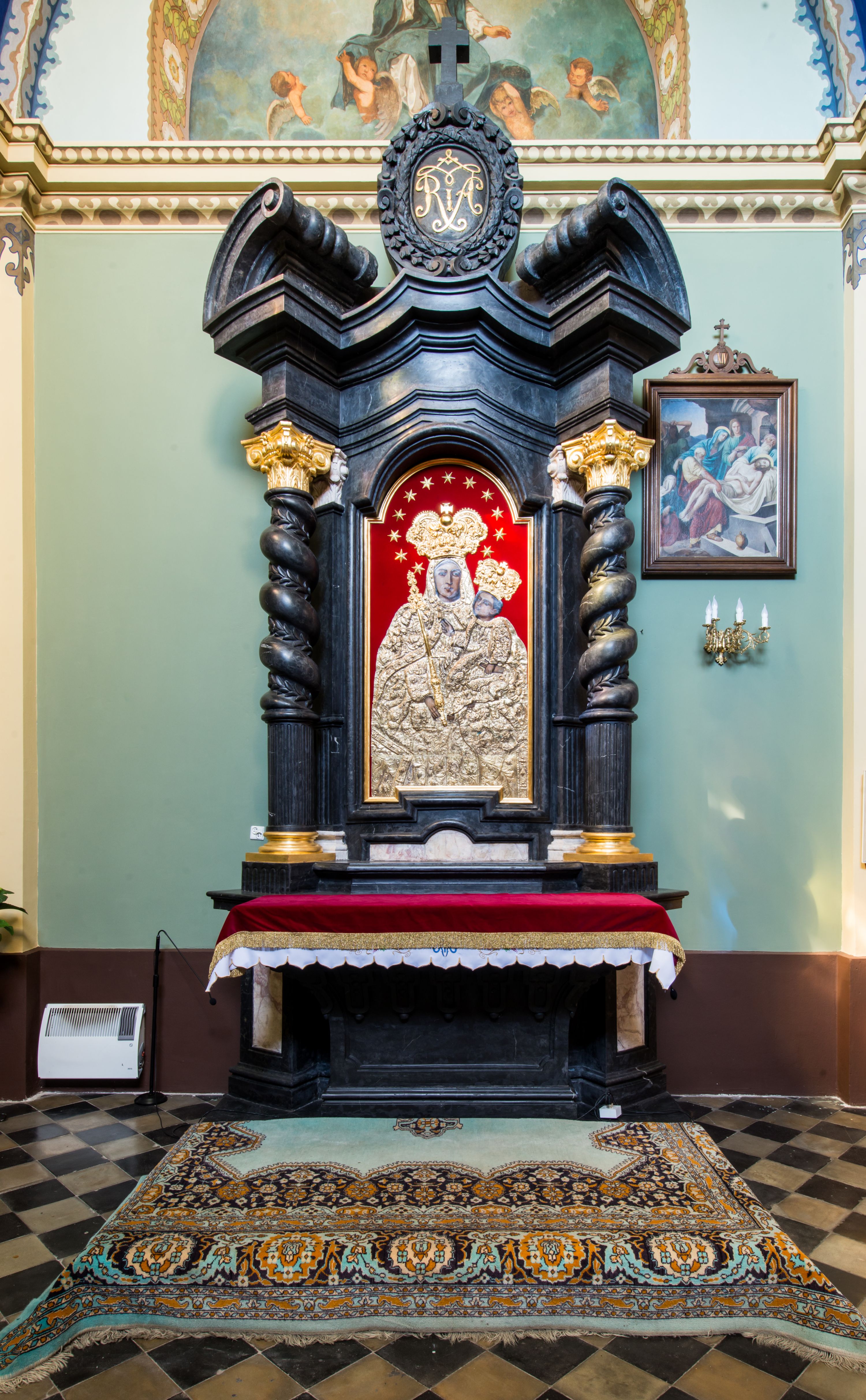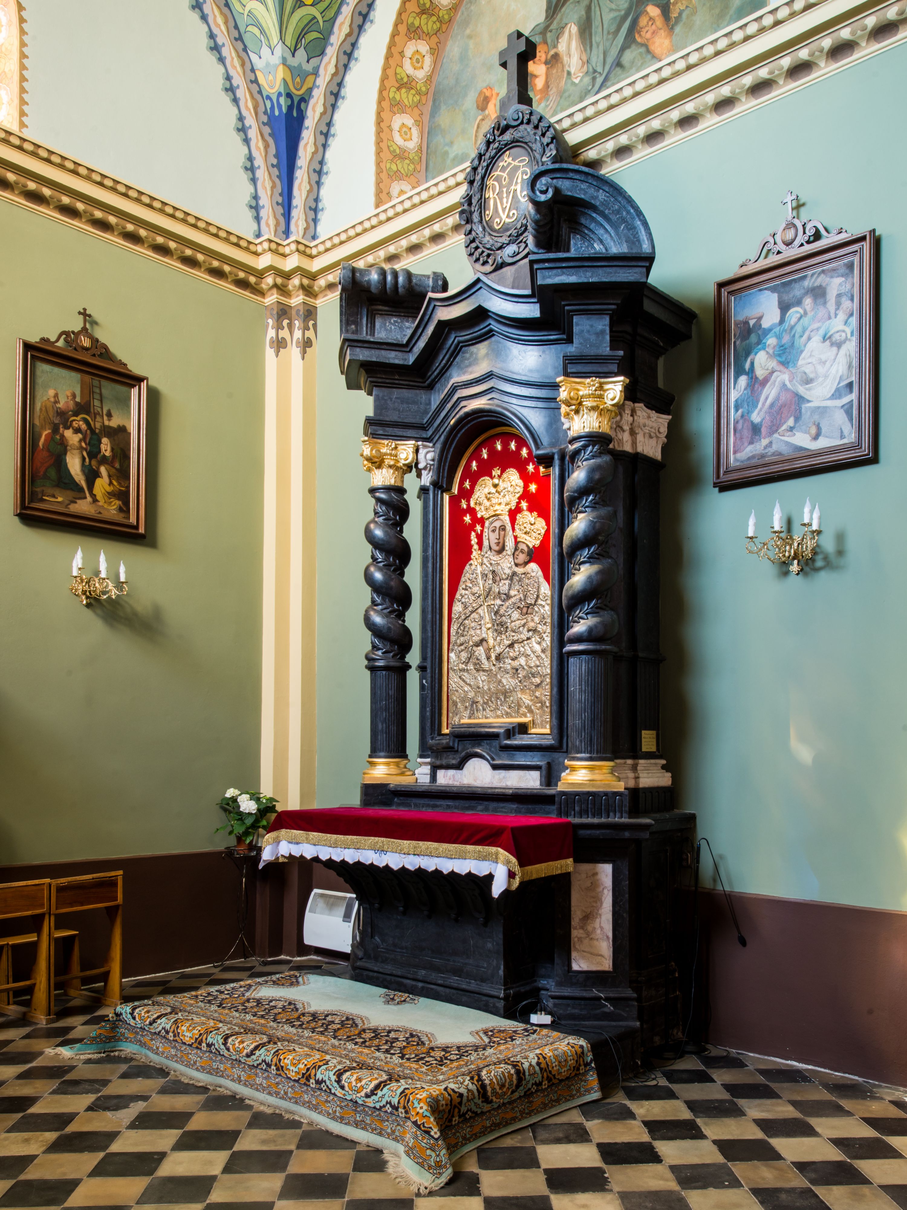 Ołtarz prostopadłościenny, w typie tumbowym, z mensą o brzegu zdobionym rzędem liści akantu naprzemian z łukami kotarowymi zwieńczonymi kulami oraz podwieszonym lambrekinem. Nastawa ołtarzowa jest architektoniczna, jednoosiowa ze zwieńczeniem, ujęta przez kolumny stojące na ukośnie dostawionych cokołach. Kolumny w jednej trzeciej kanelowane w dwóch trzecich skręcone z wplecioną wicią roślinną, ze złoconym kapitelem podtrzymują przerwany przyczółek ze ślimacznicami. Belkowanie bogato profilowane nad częścią środkową jest wyłamane trzema wklęsłymi łukami. W szczycie owalny medalion z monogramem ”MARIA”, w obramieniu z wieńca laurowego, ślimacznic i festonów, zakończony krzyżem. W osi środkowej prostokątna wnęka w profilowanym obramieniu, zamknięta półkolistym łukiem nadwieszonym z obrazem Matki Boskiej z Dzieciątkiem.