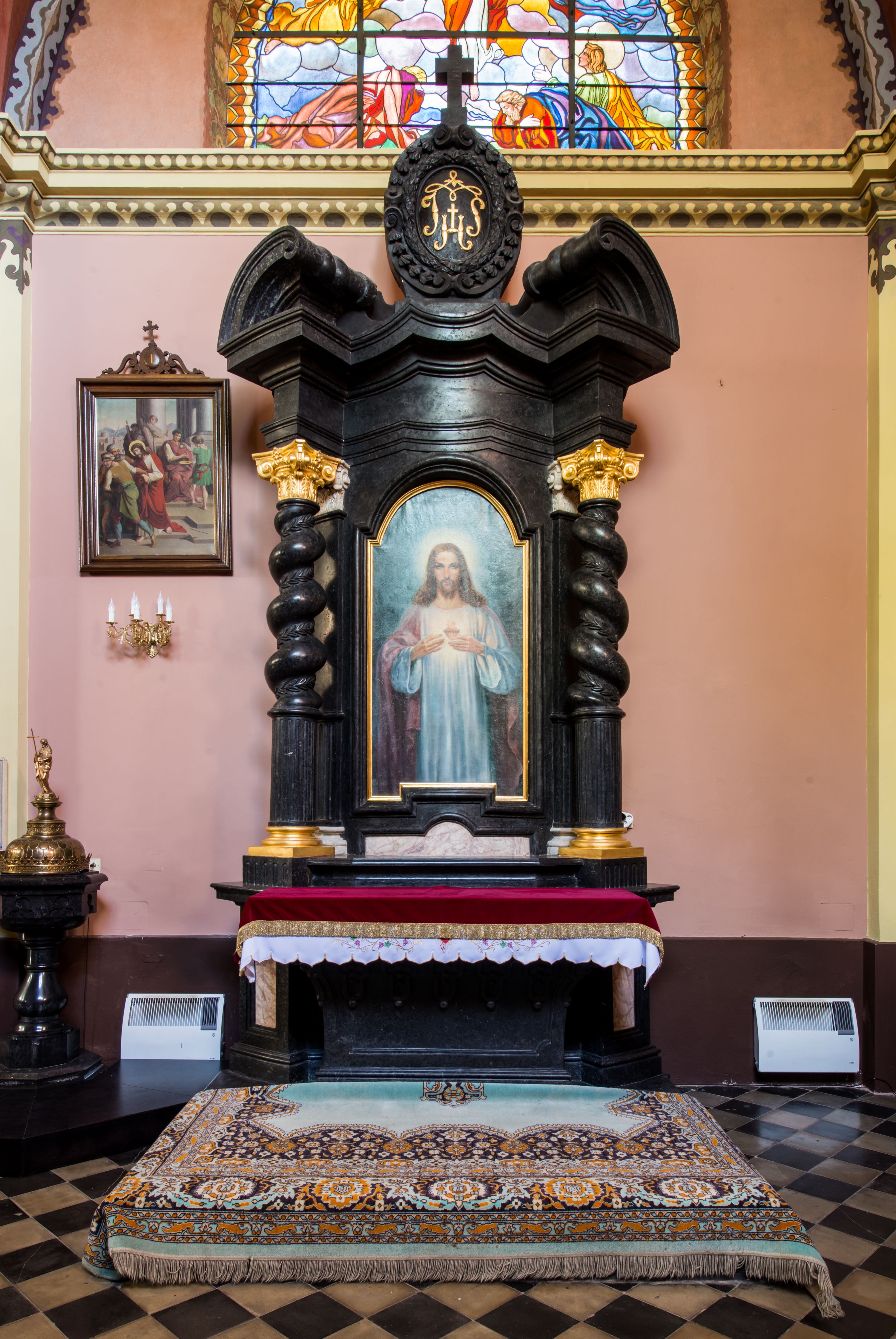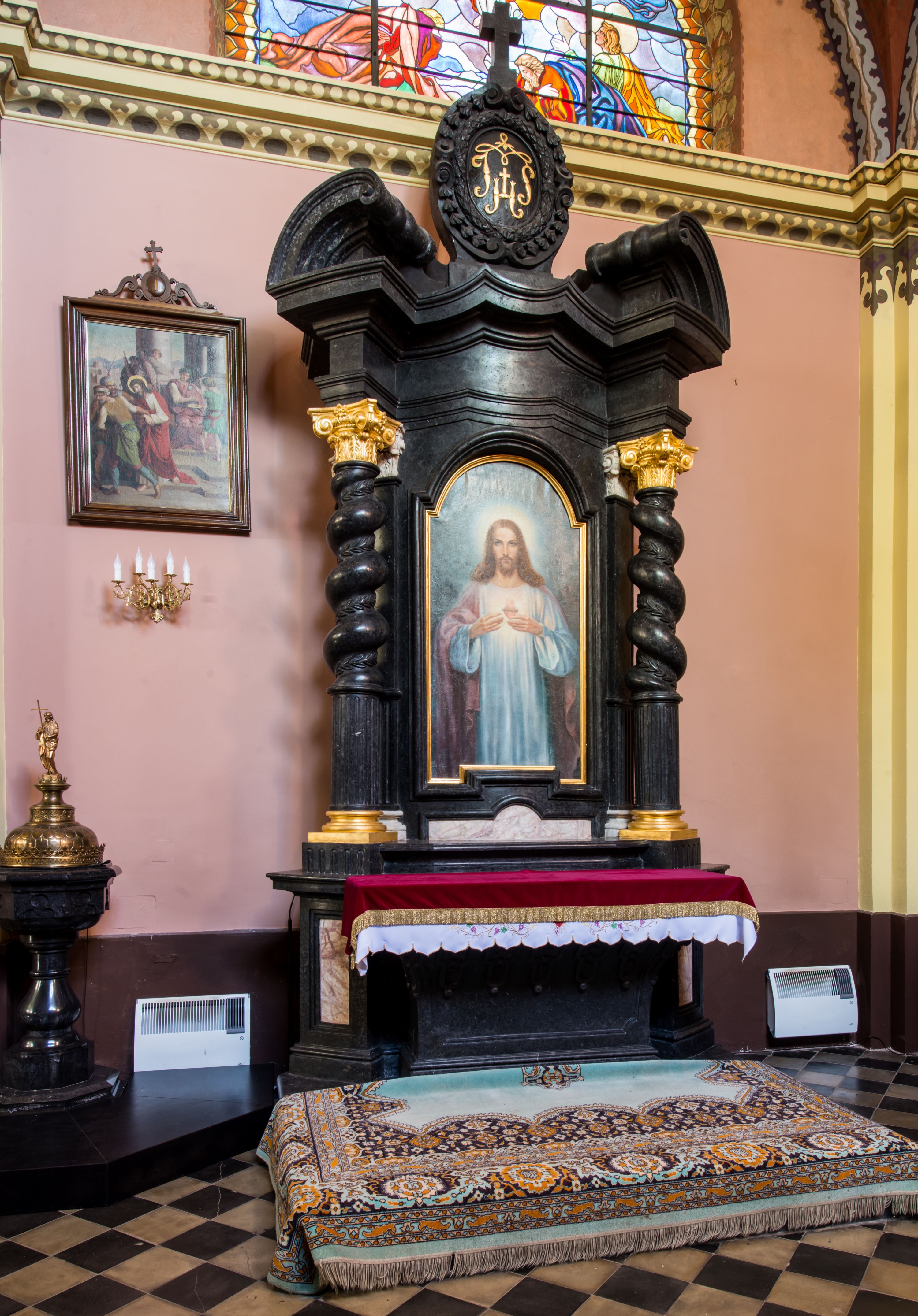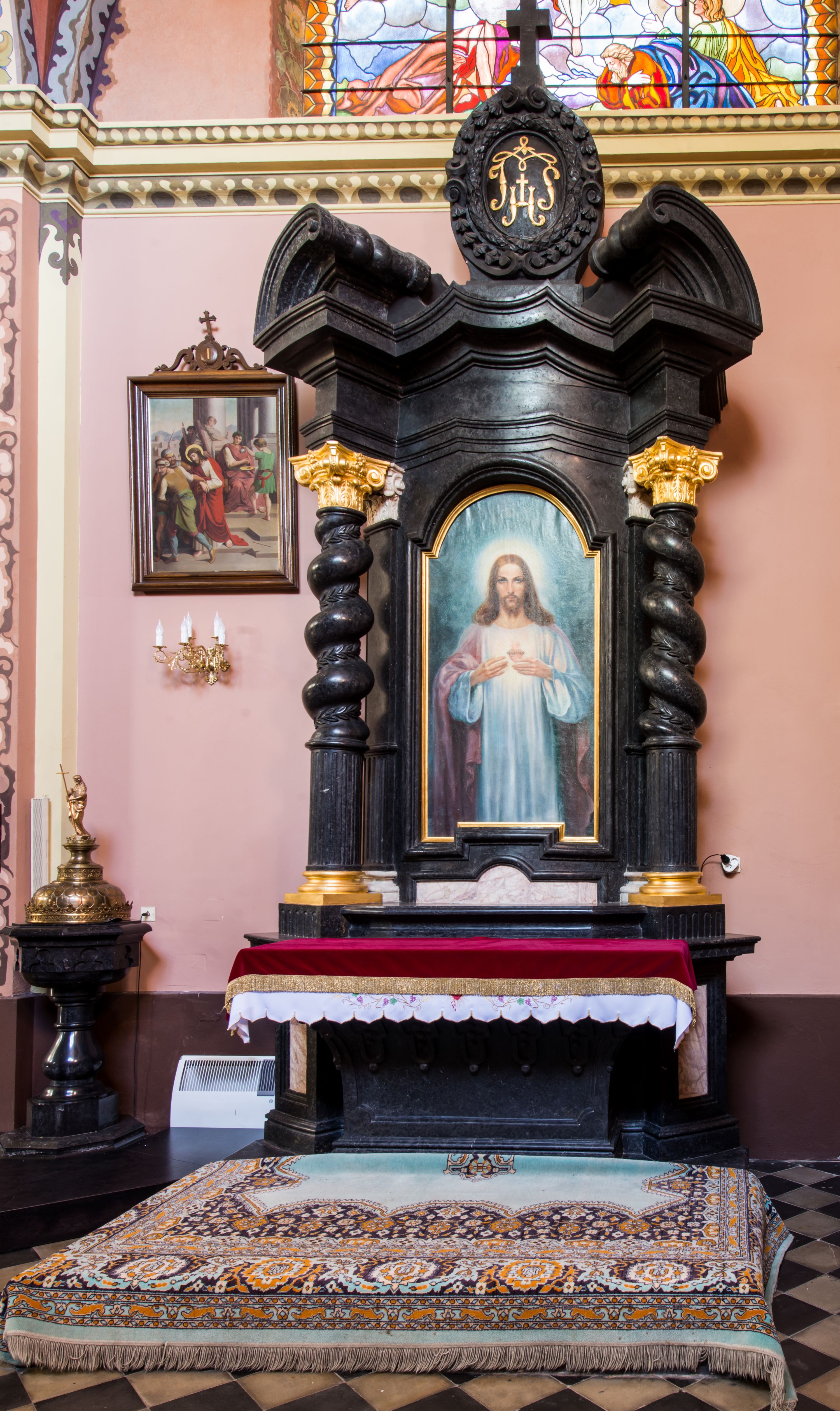 Ołtarz prostopadłościenny, w typie tumbowym, z mensą o brzegu zdobionym rzędem liści akantu naprzemian z łukami kotarowymi zwieńczonymi kulami oraz podwieszonym lambrekinem. Nastawa ołtarzowa jest architektoniczna, jednoosiowa ze zwieńczeniem, ujęta przez kolumny stojące na ukośnie dostawionych cokołach. Kolumny w jednej trzeciej kanelowane w dwóch trzecich skręcone z wplecioną wicią roślinną, ze złoconym kapitelem podtrzymują przerwany przyczółek ze ślimacznicami. Belkowanie bogato profilowane nad częścią środkową jest wyłamane trzema wklęsłymi łukami. W szczycie owalny medalion z monogramem "IHS”, w obramieniu z wieńca laurowego, ślimacznim z festonami, zakończony krzyżem. W osi środkowej prostokątna wnęka w profilowanym obramieniu, zamknięta półkolistym łukiem nadwieszonym z obrazem Najświętszego Serca Jezusowego.